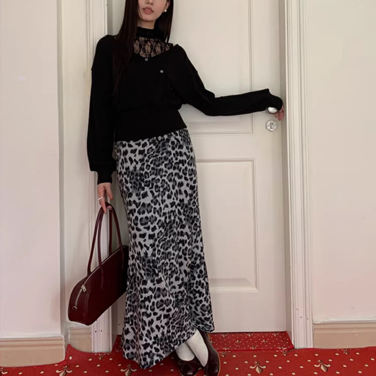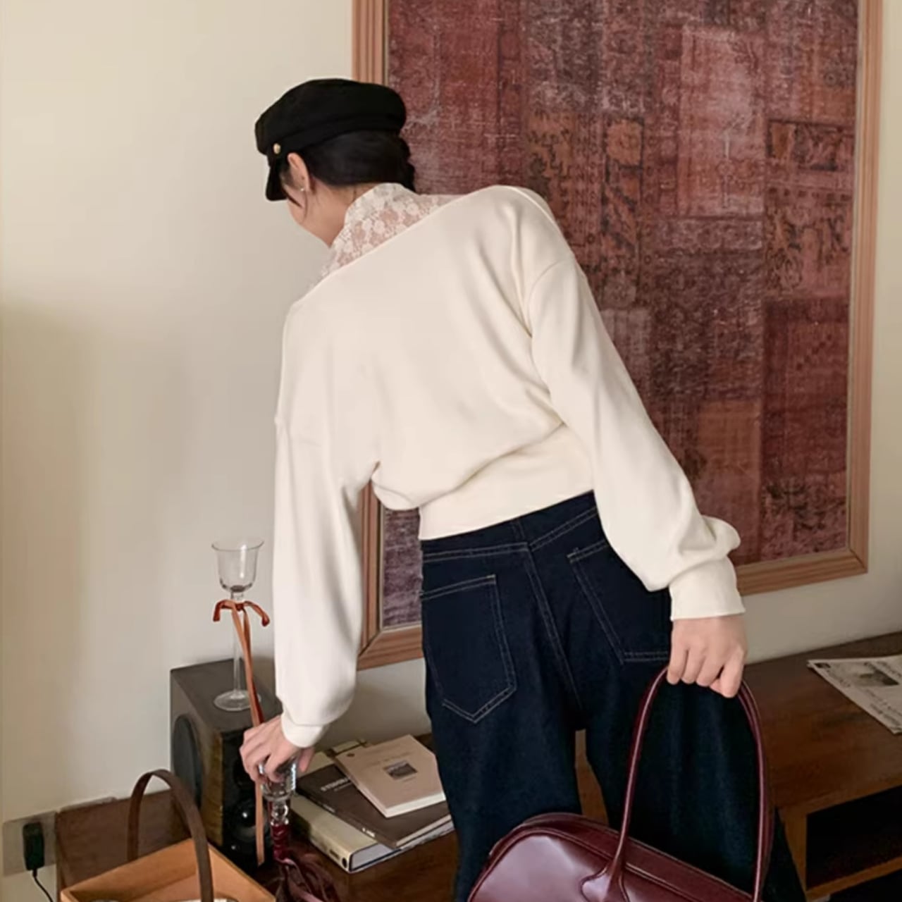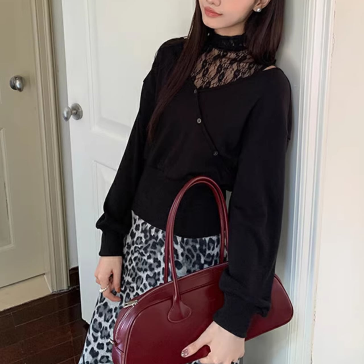 すっきりとしたVネックに、インナーのレースの透け感が大人の女性らしさを演出。