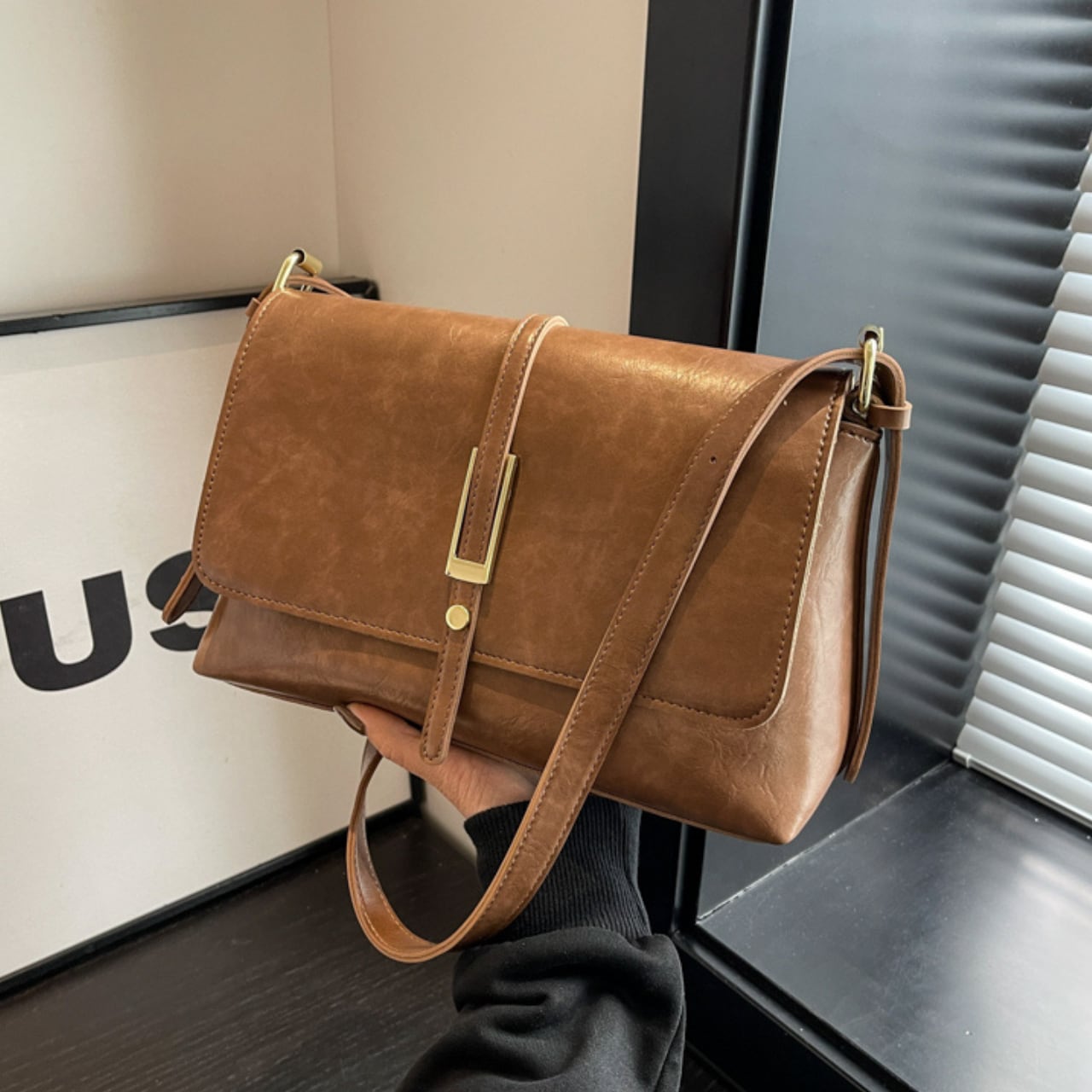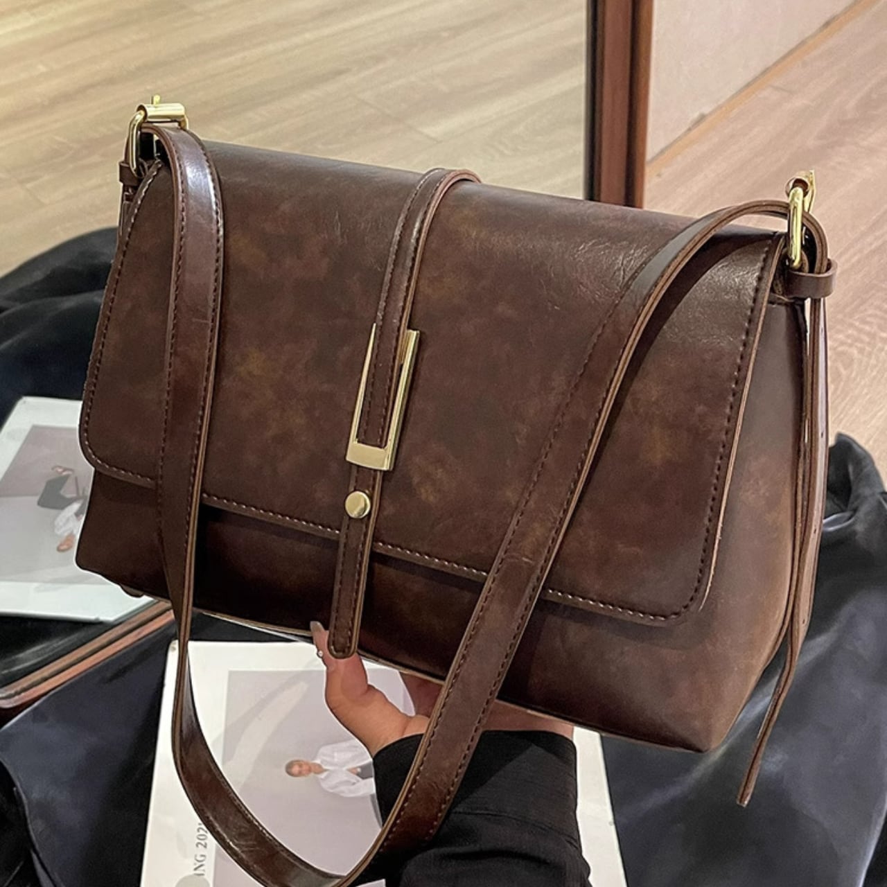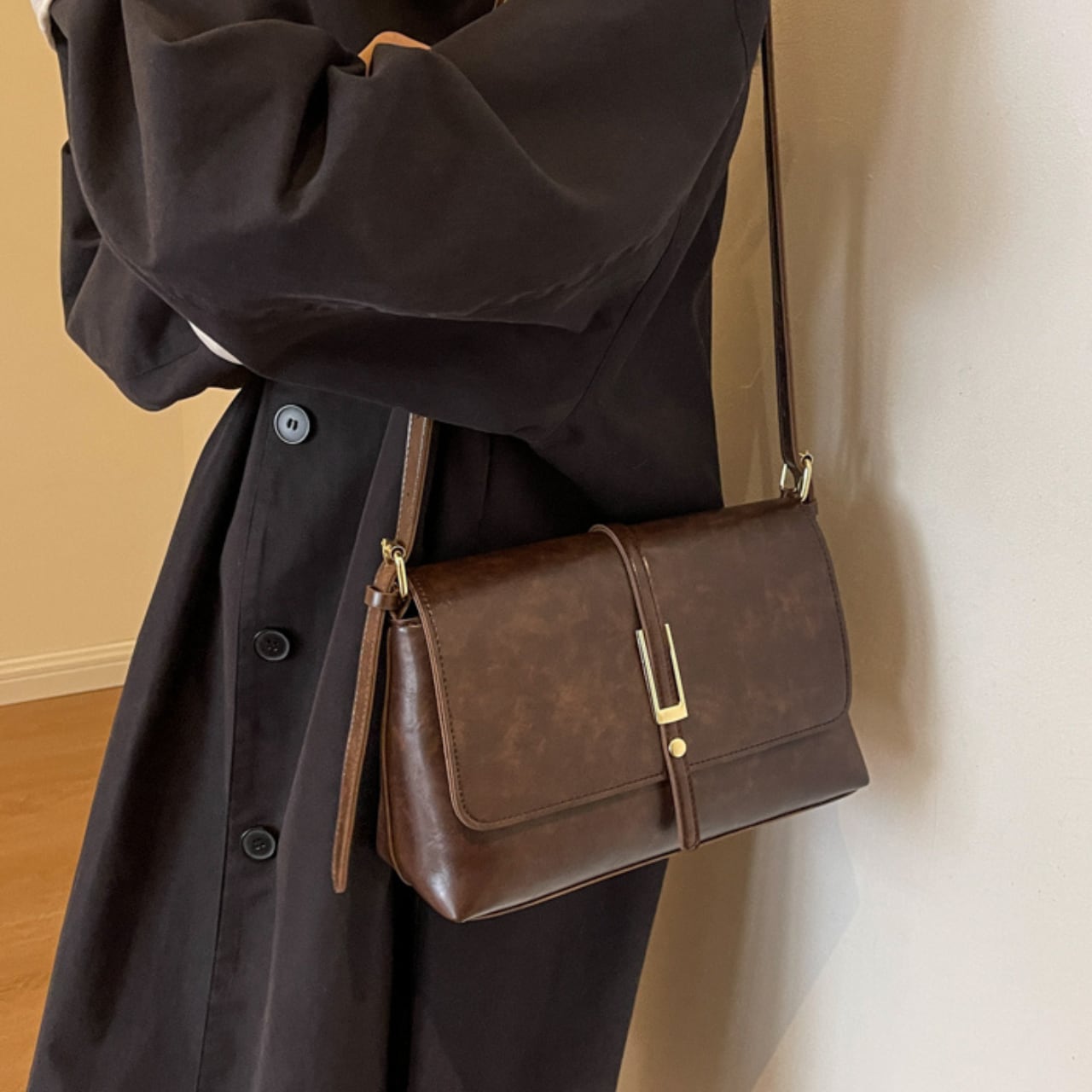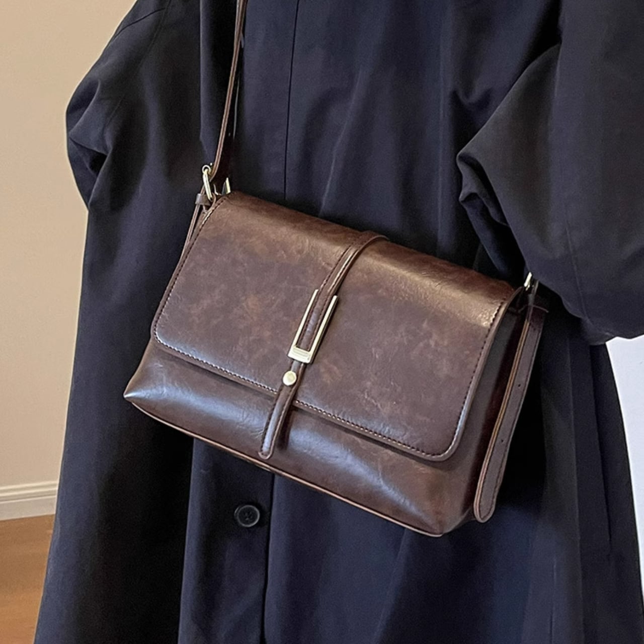 レトロな風合いのスクエア型ショルダーバッグ。