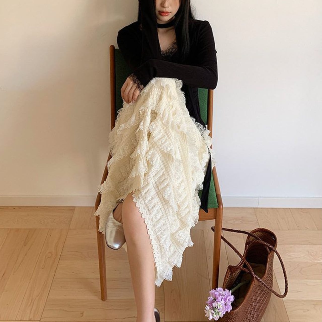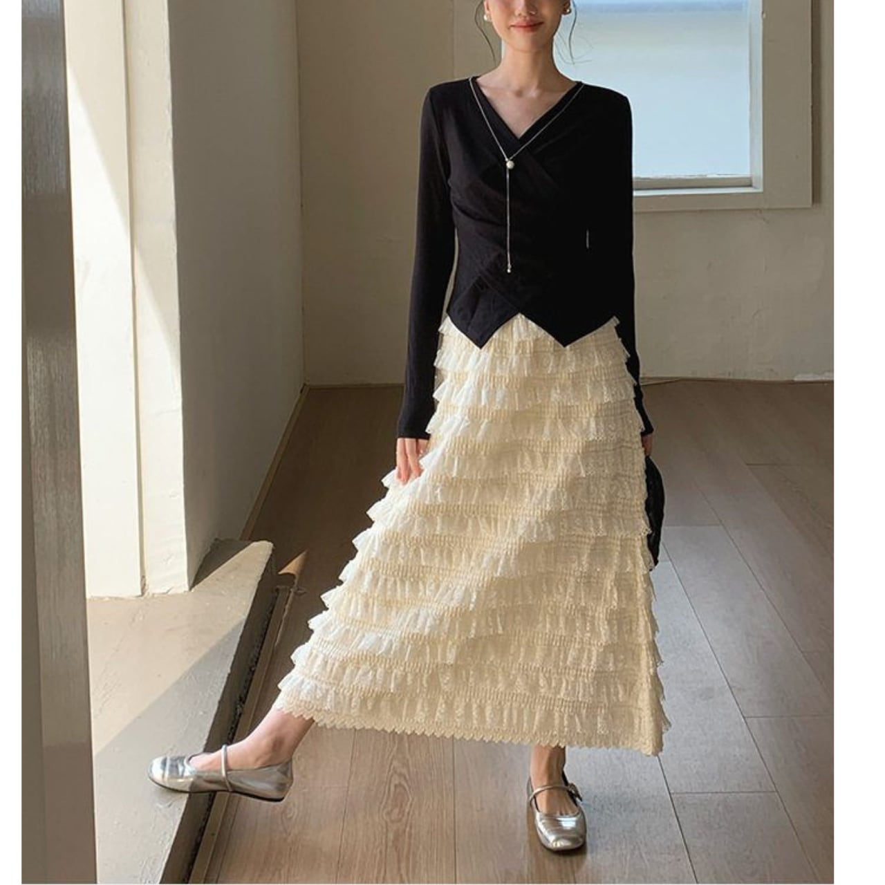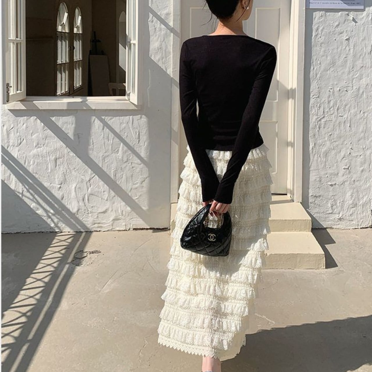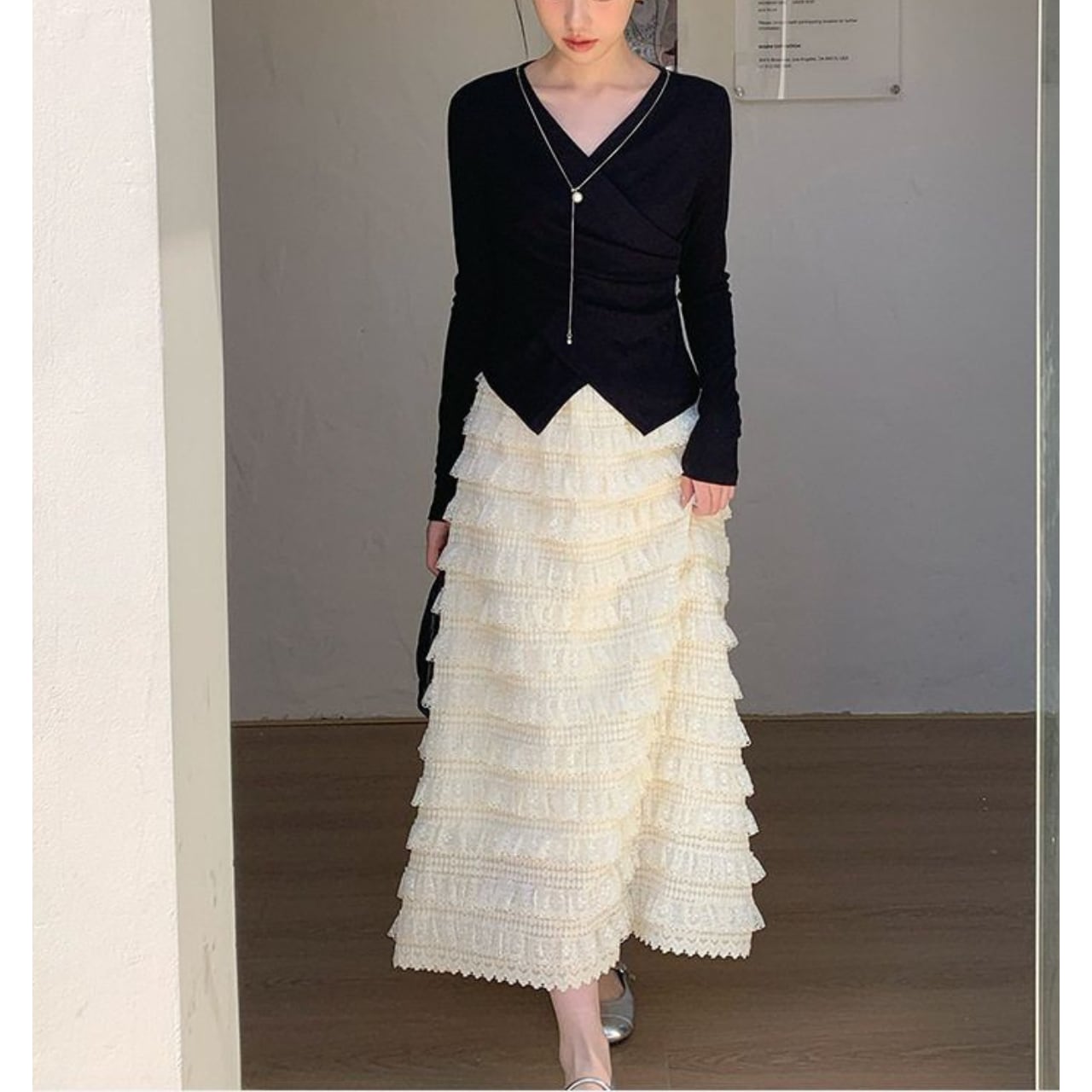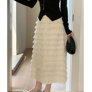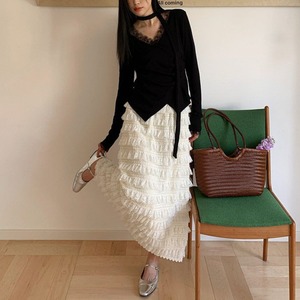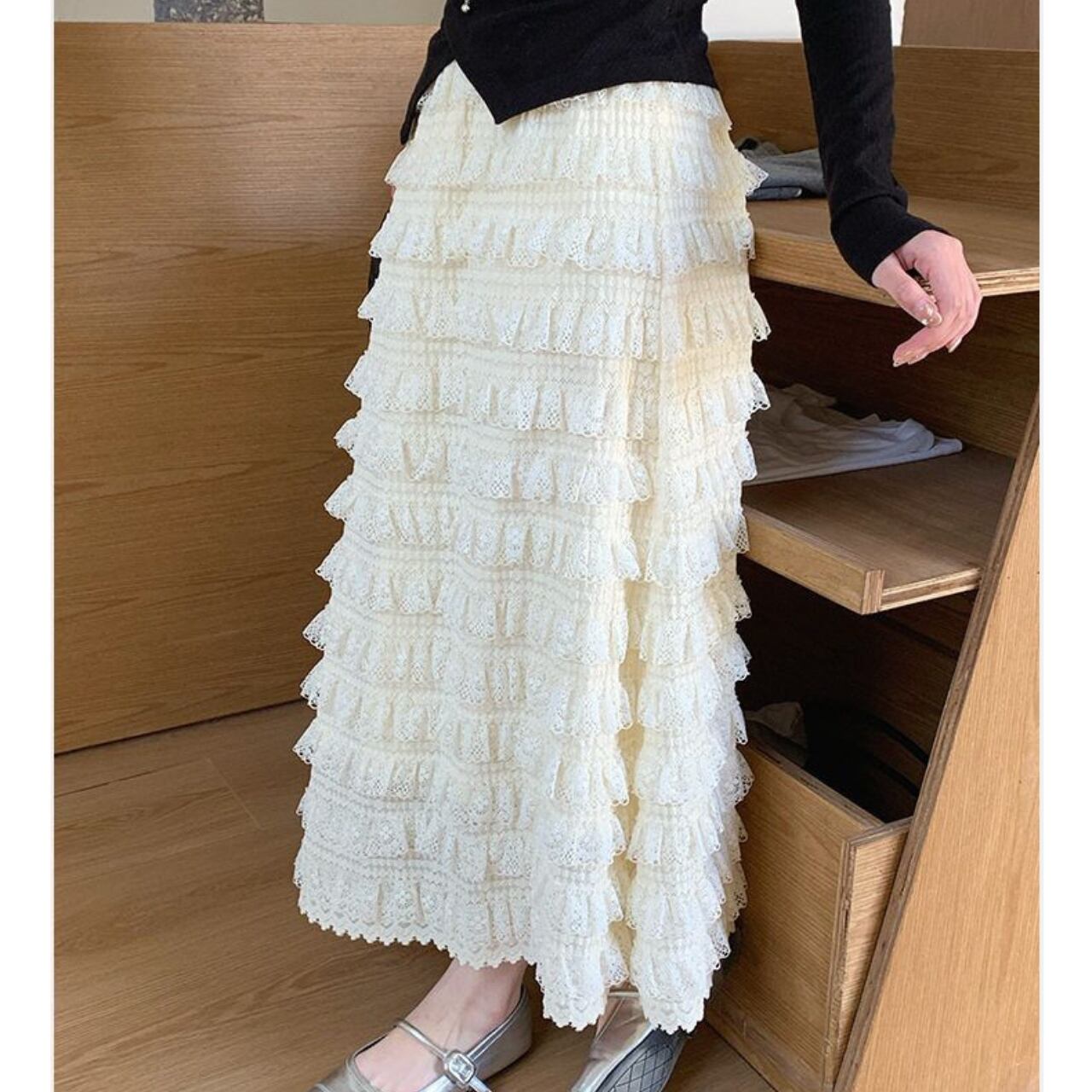 繊細なレースのティアードデザインが美しいロングスカートです。