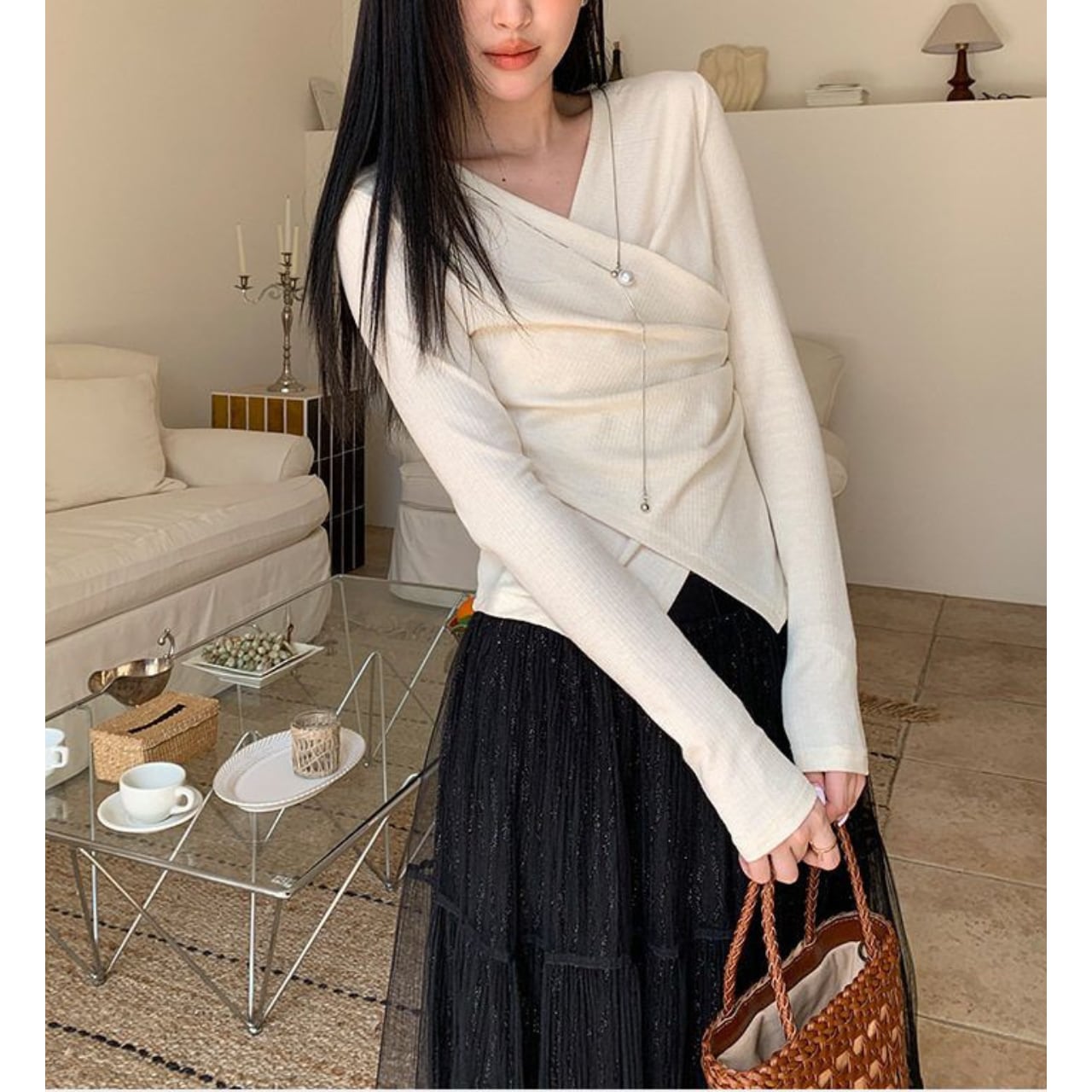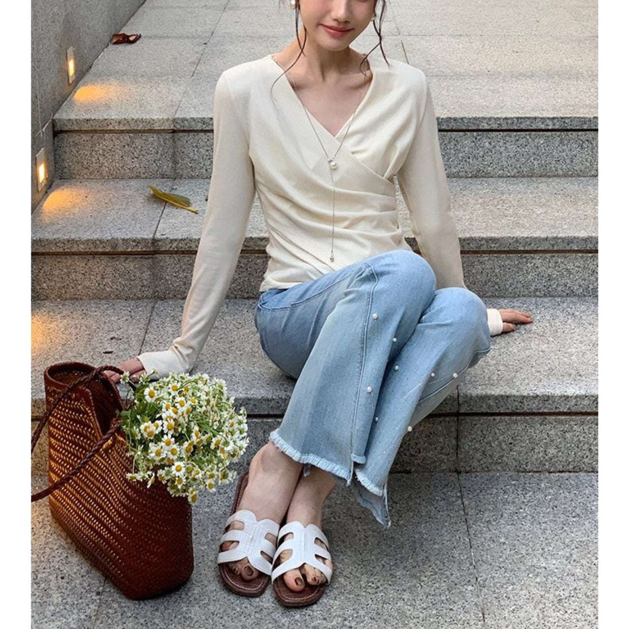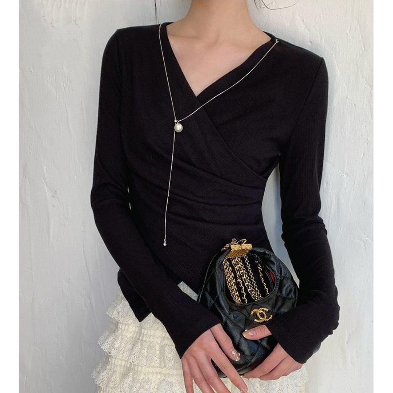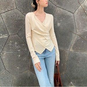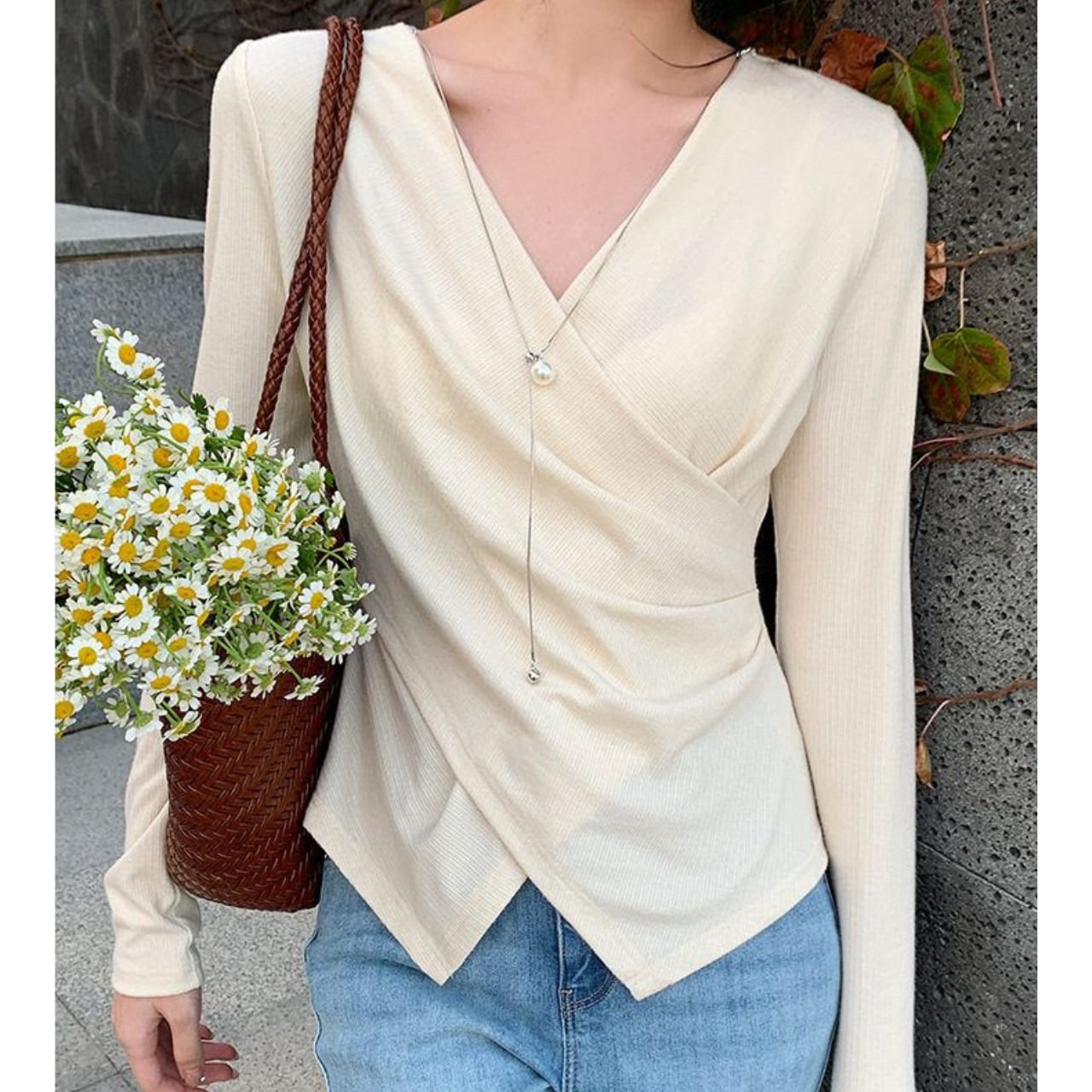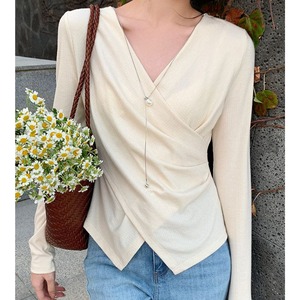 Vネックとカシュクールデザインが女性らしい印象のトップスです。