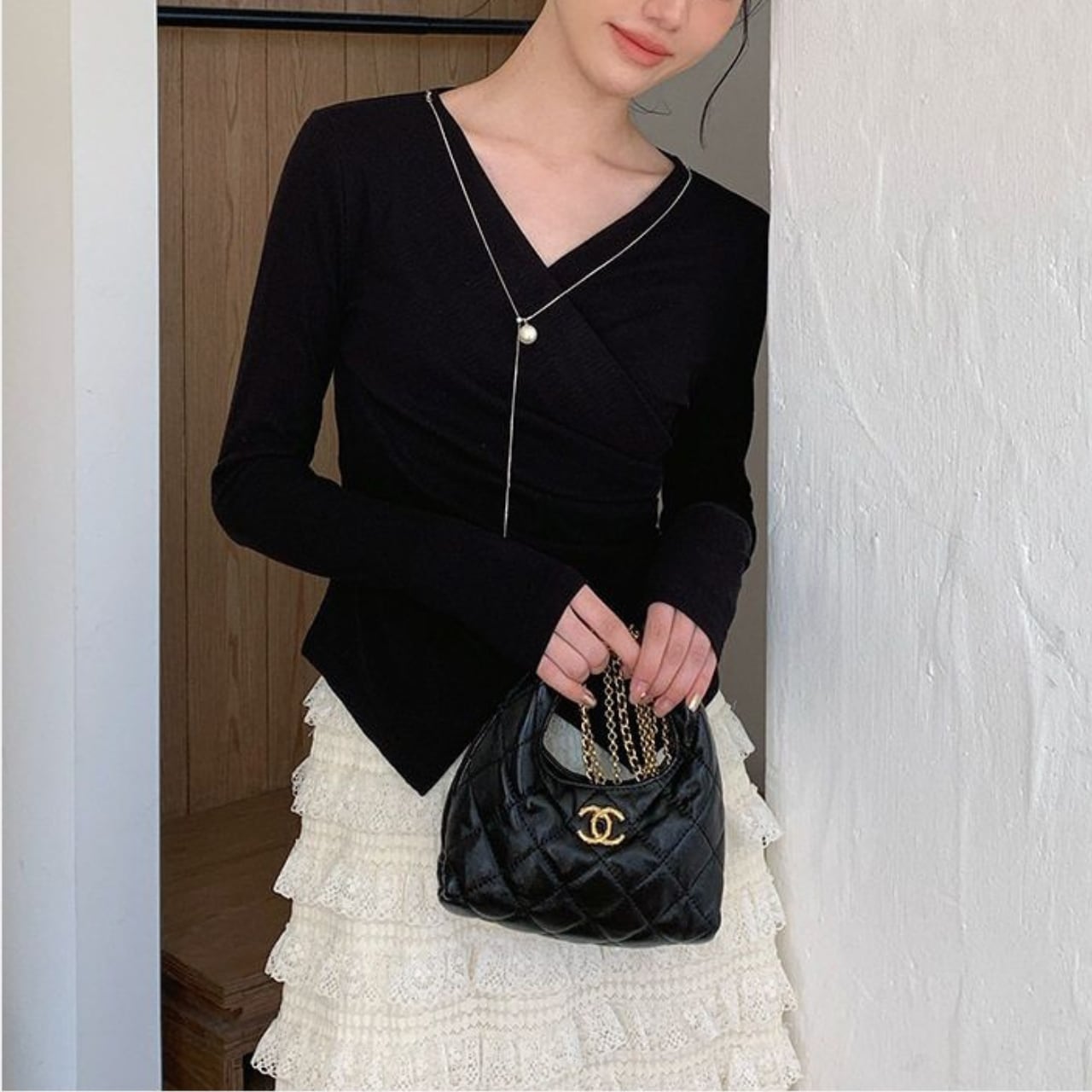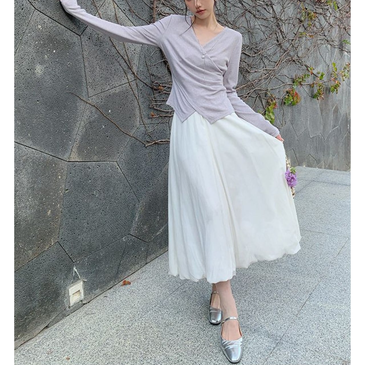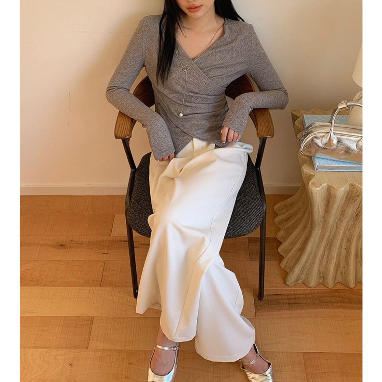 Vネックとカシュクールデザインが女性らしい印象のトップスです。