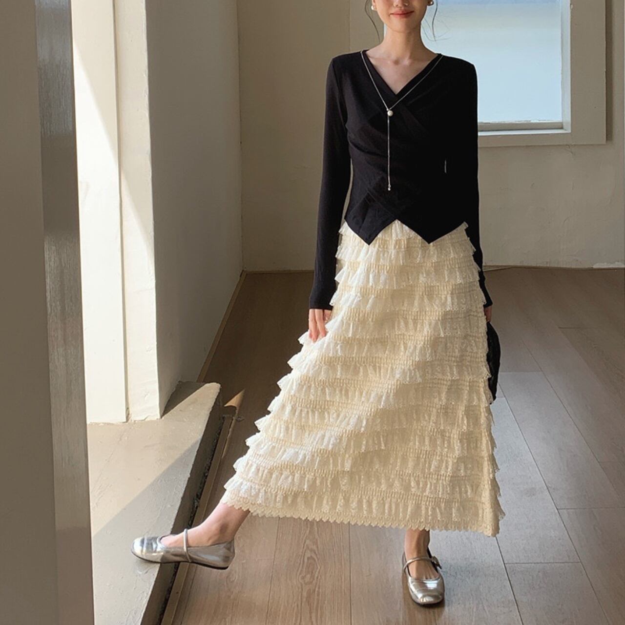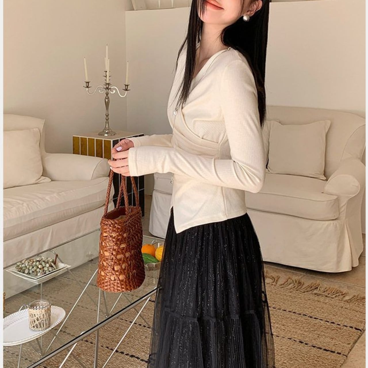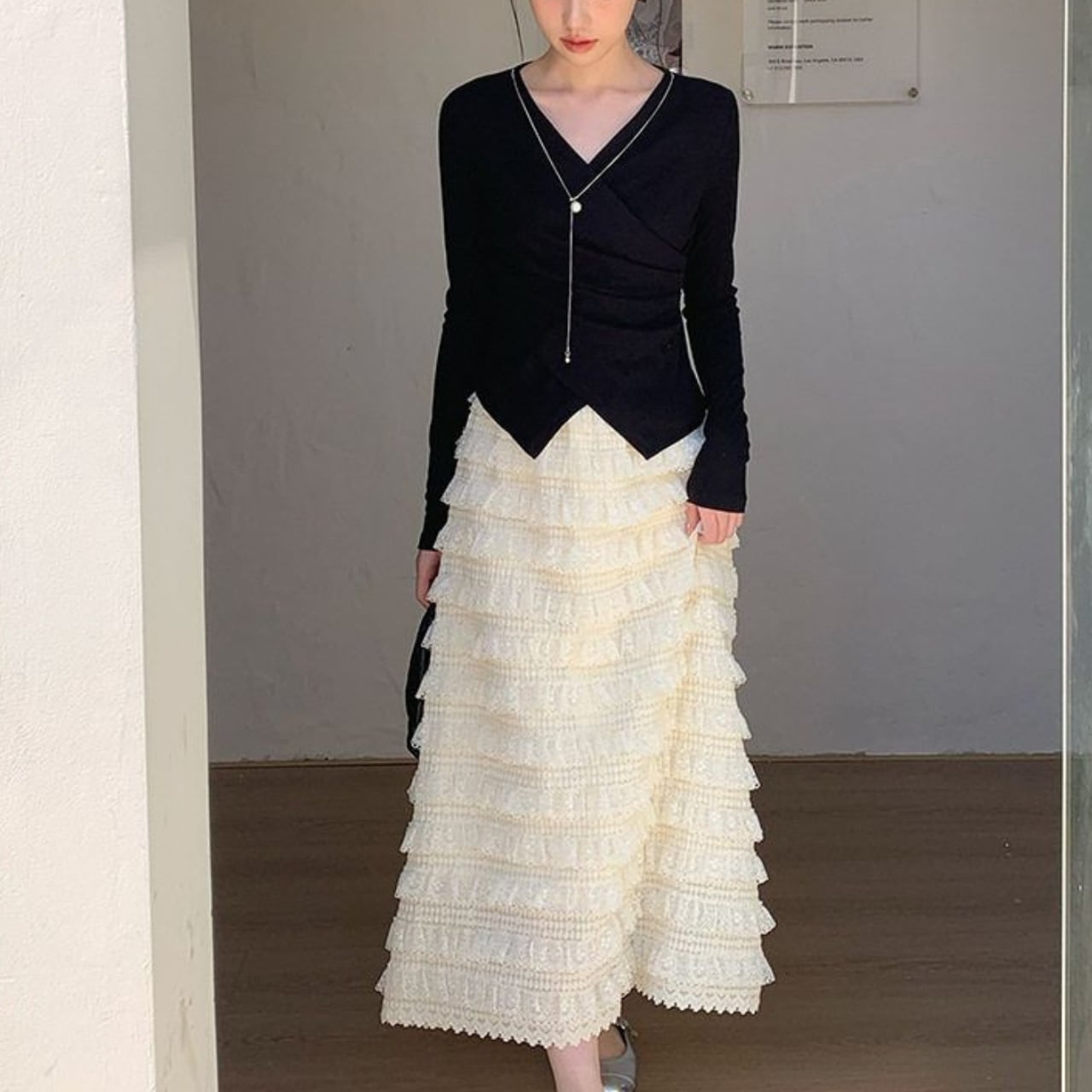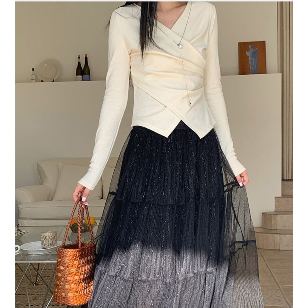 Vネックとカシュクールデザインが女性らしい印象のトップスです。