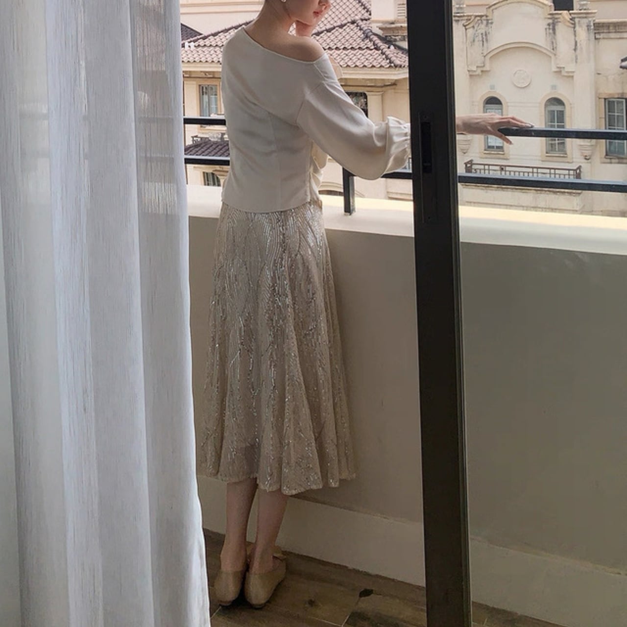 Aラインシルエットが女性らしい優しさを演出。