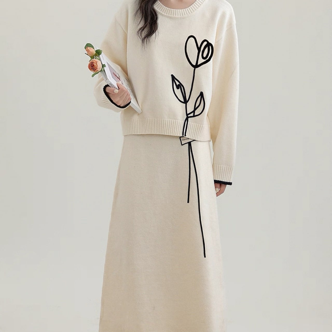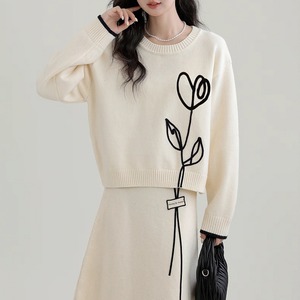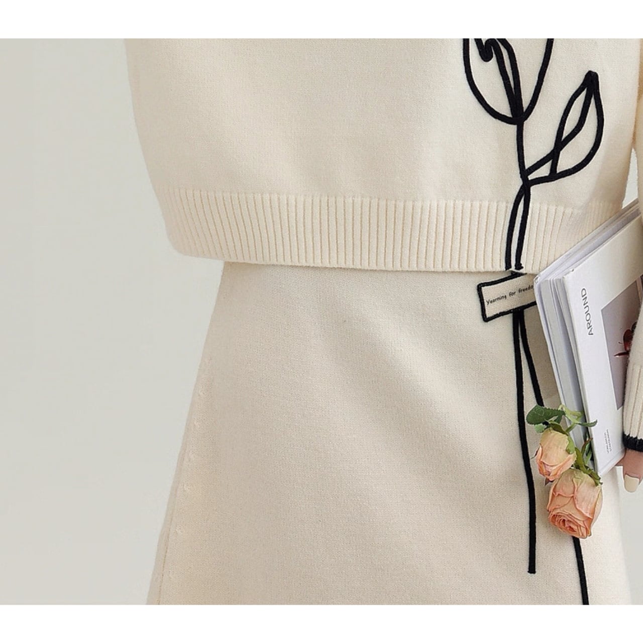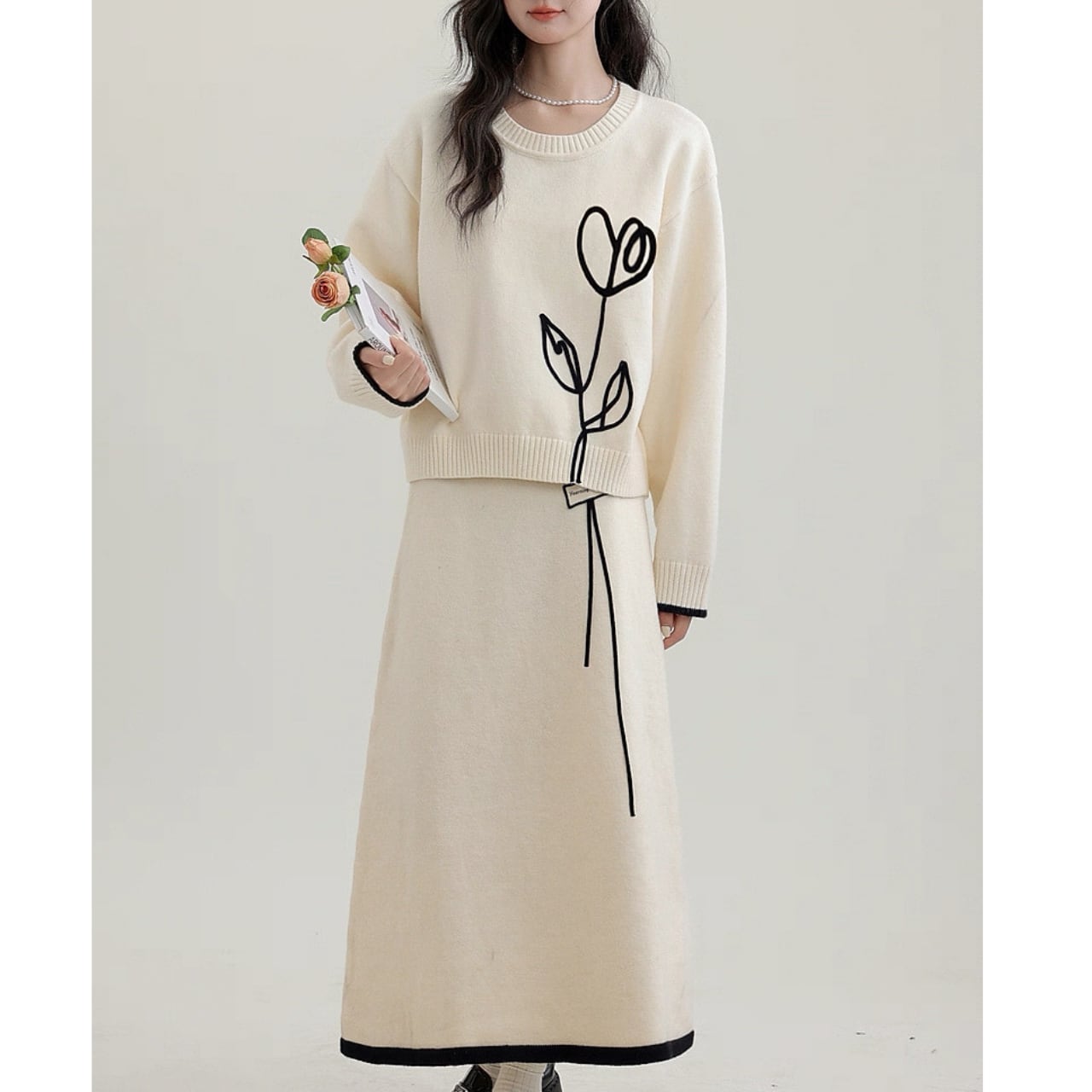 花柄刺繡ラインデザインニット&ロングスカートセットアップ W00188