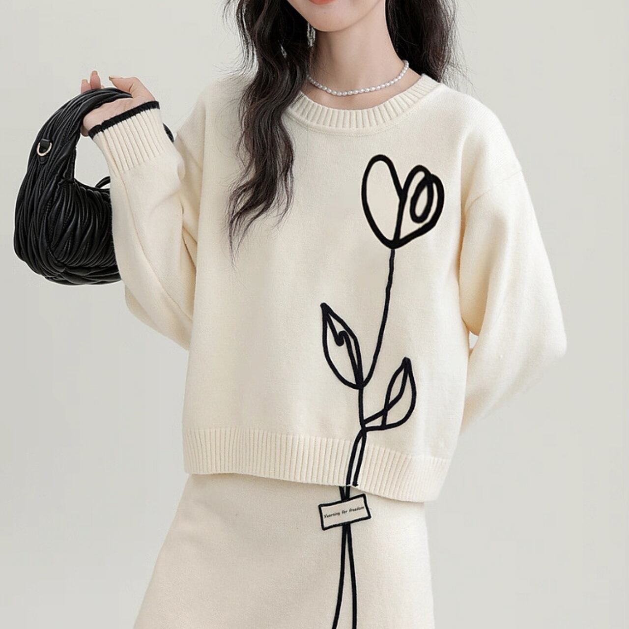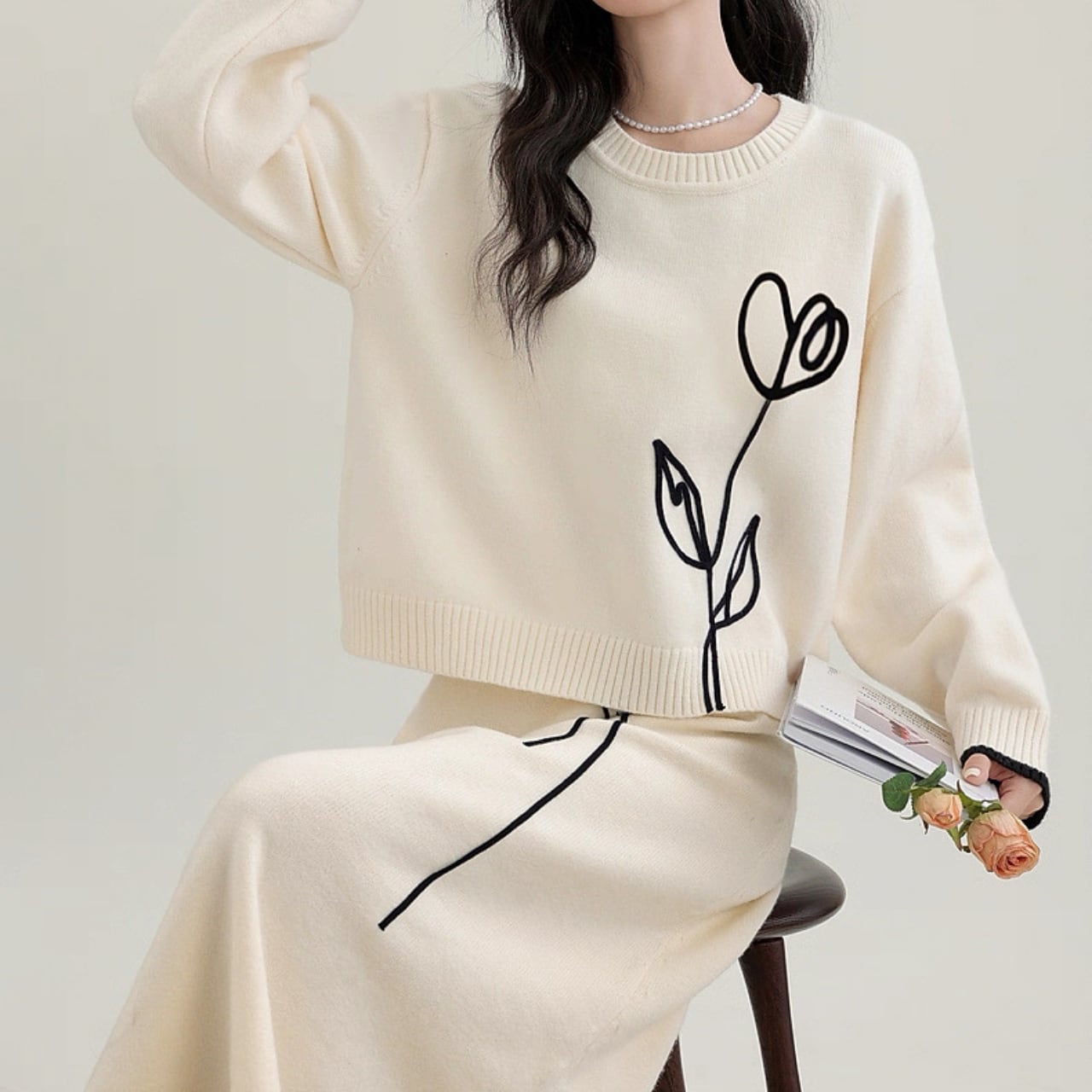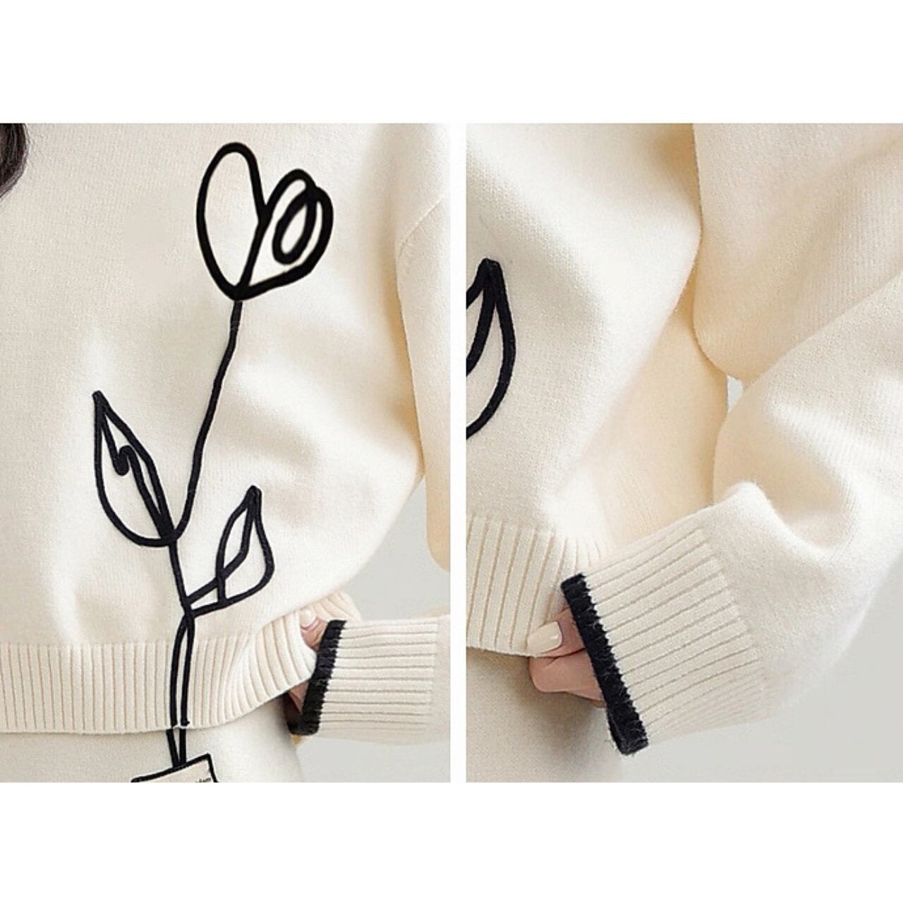 花柄刺繡ラインデザインニット&ロングスカートセットアップ W00188