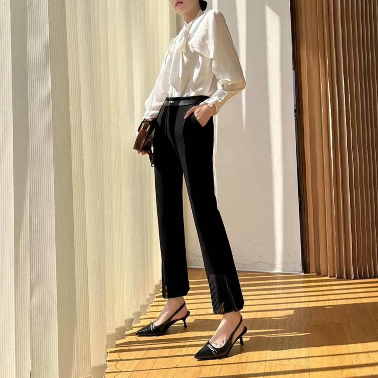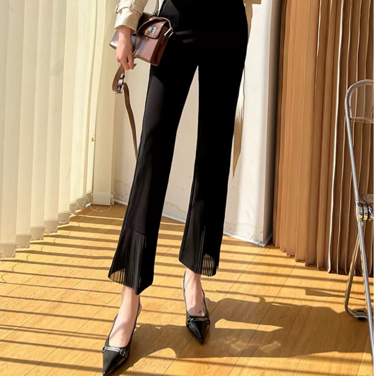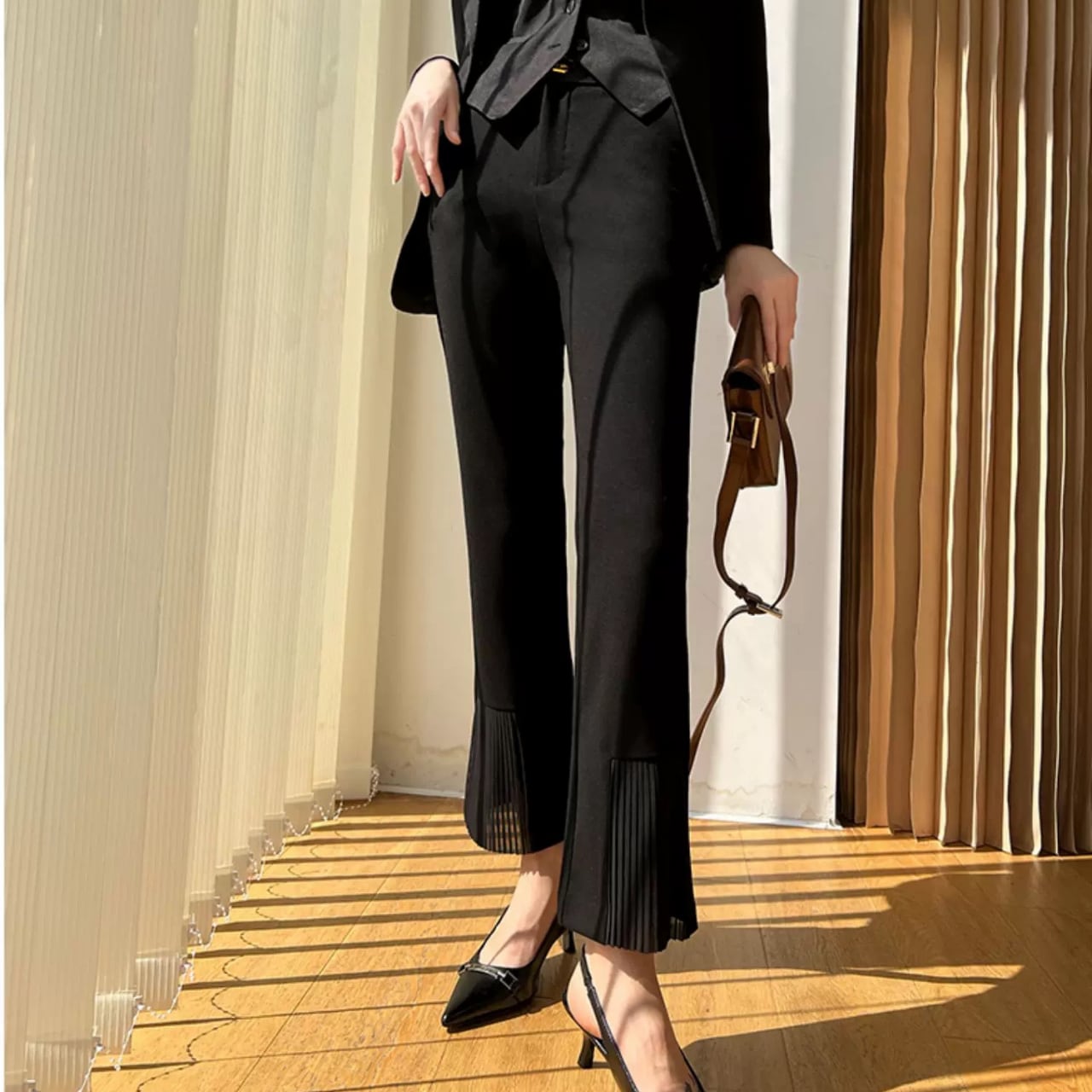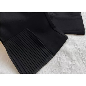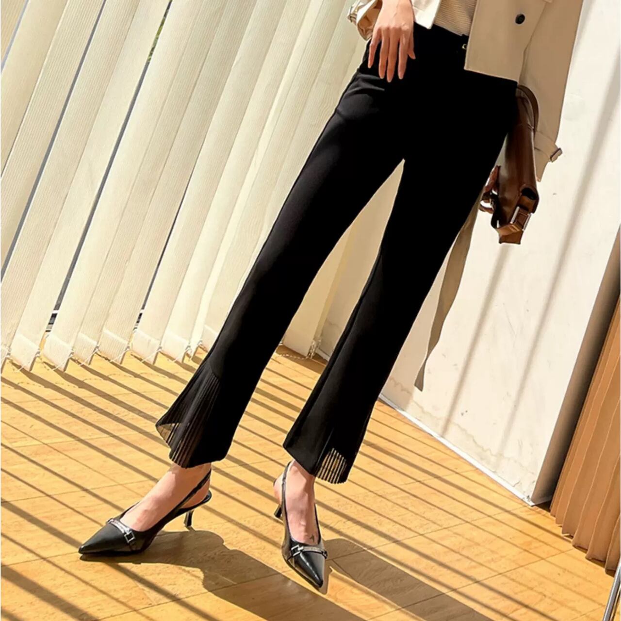裾のプリーツが歩くたびに揺れ動き、女性らしいエレガントさを演出します。
