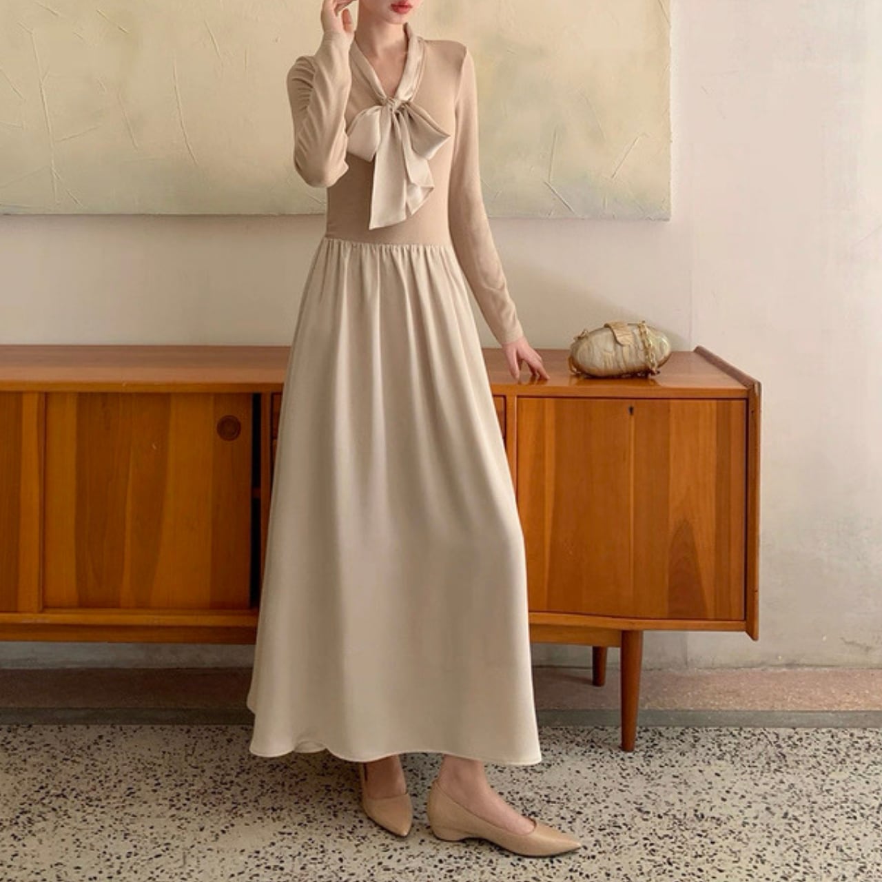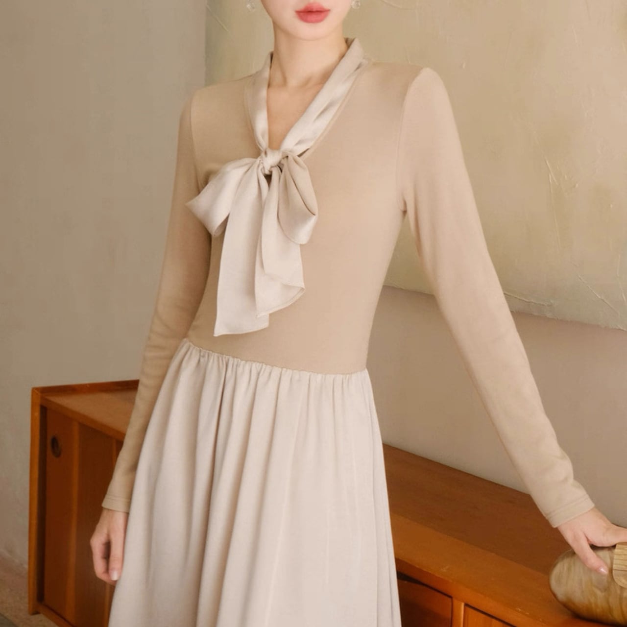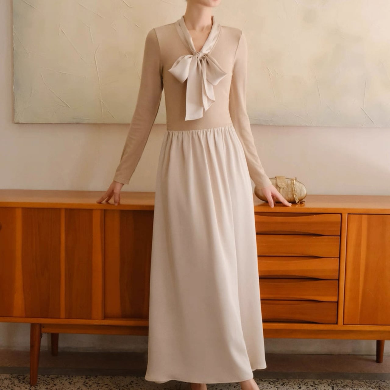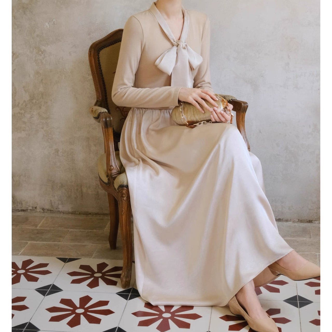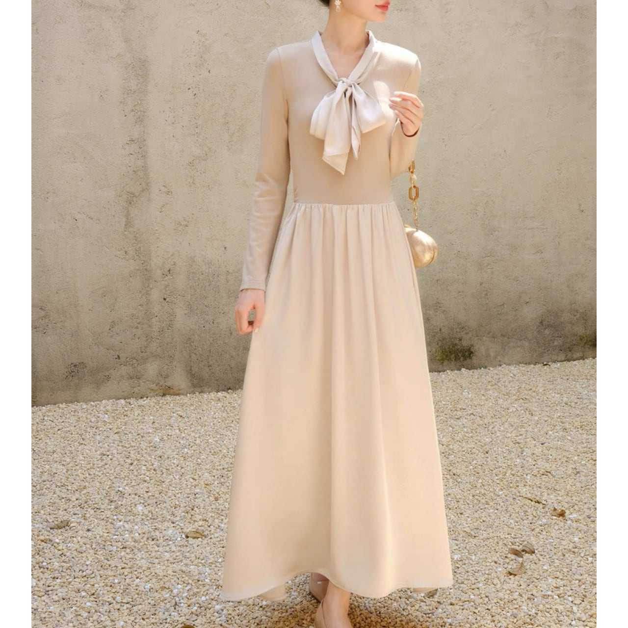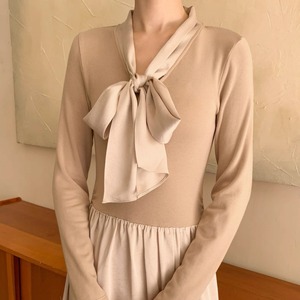 軽やかな揺れ感とリボンタイが上品なアクセントになるロングワンピース。