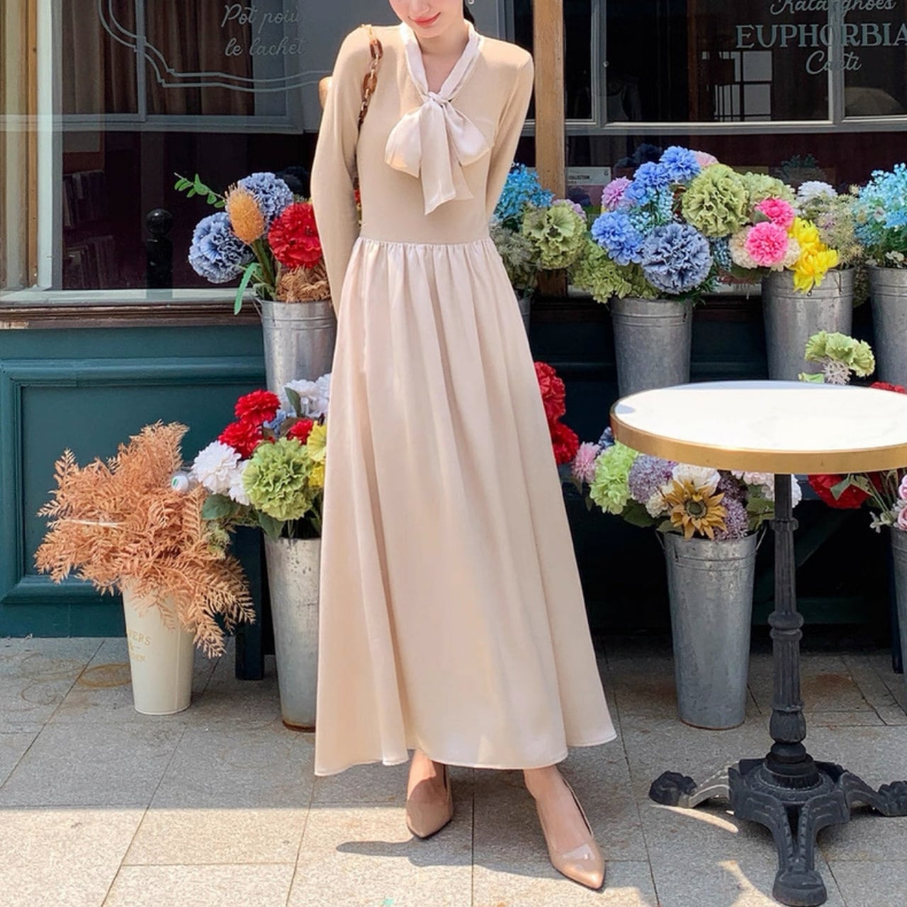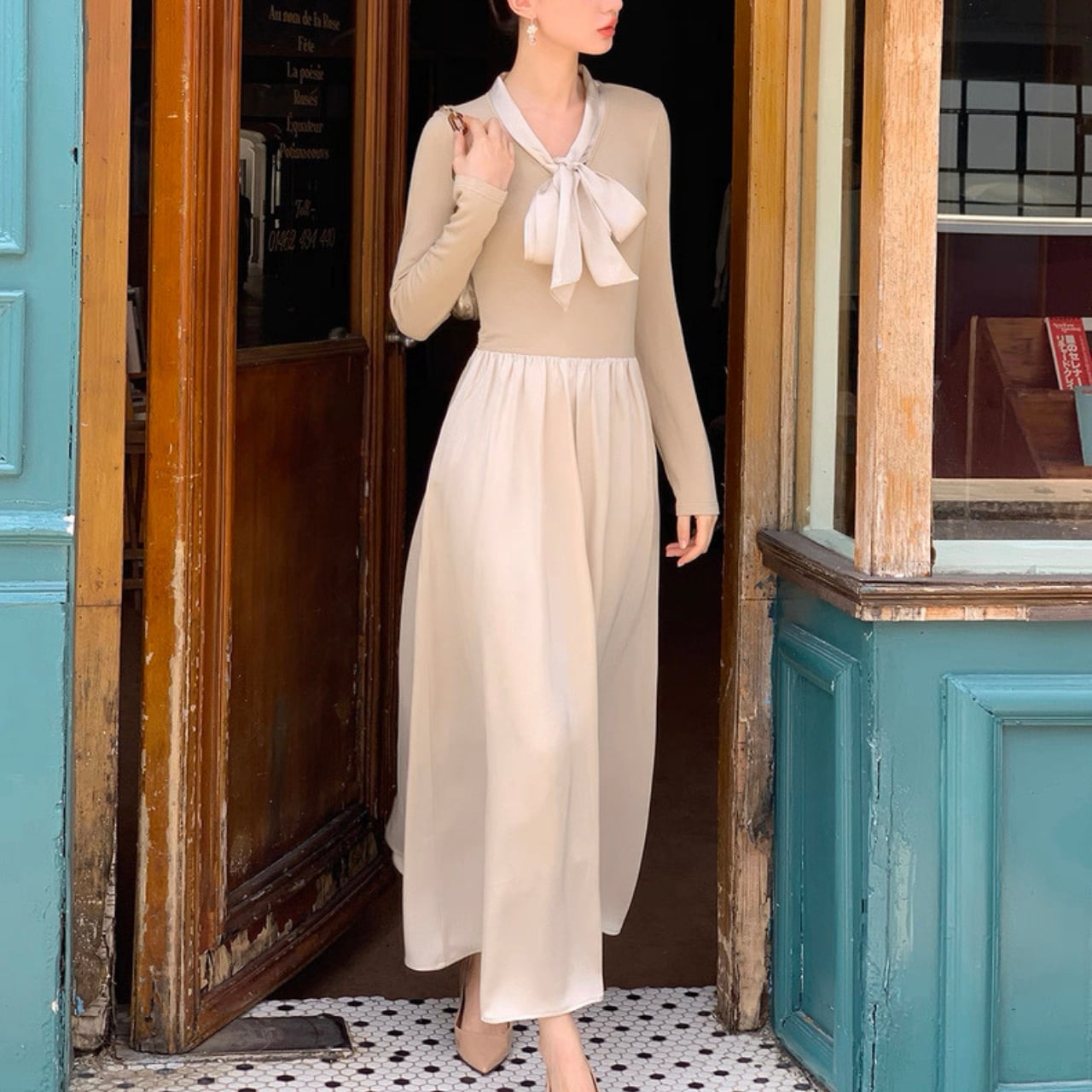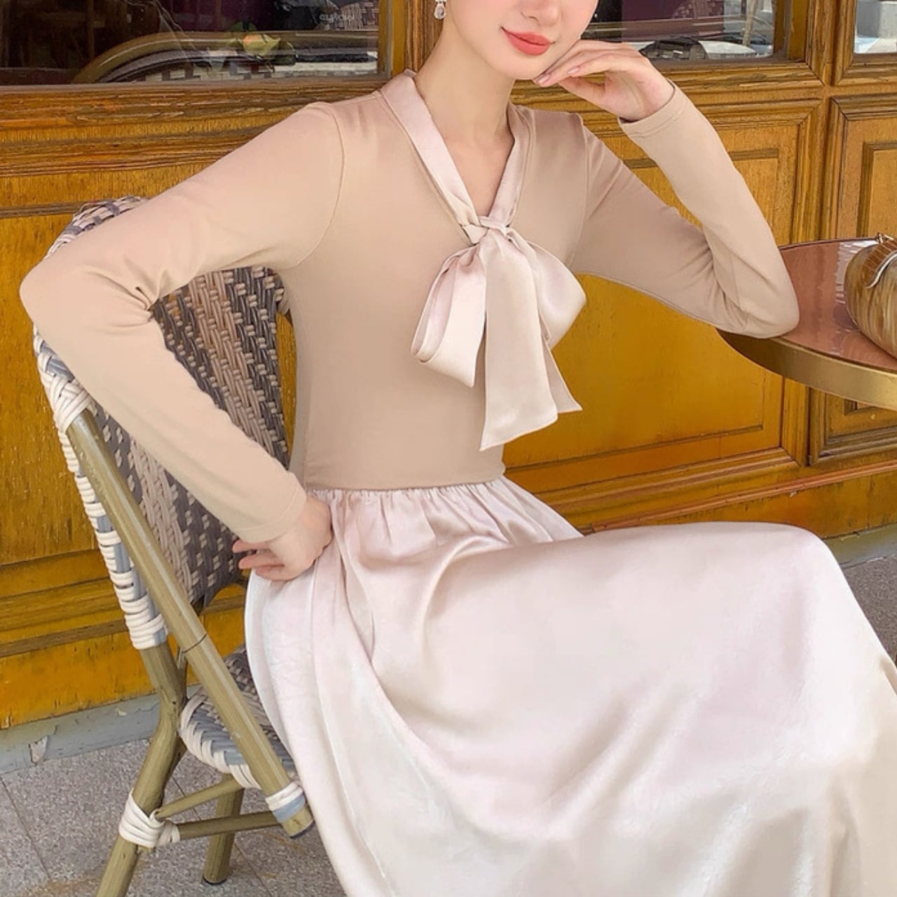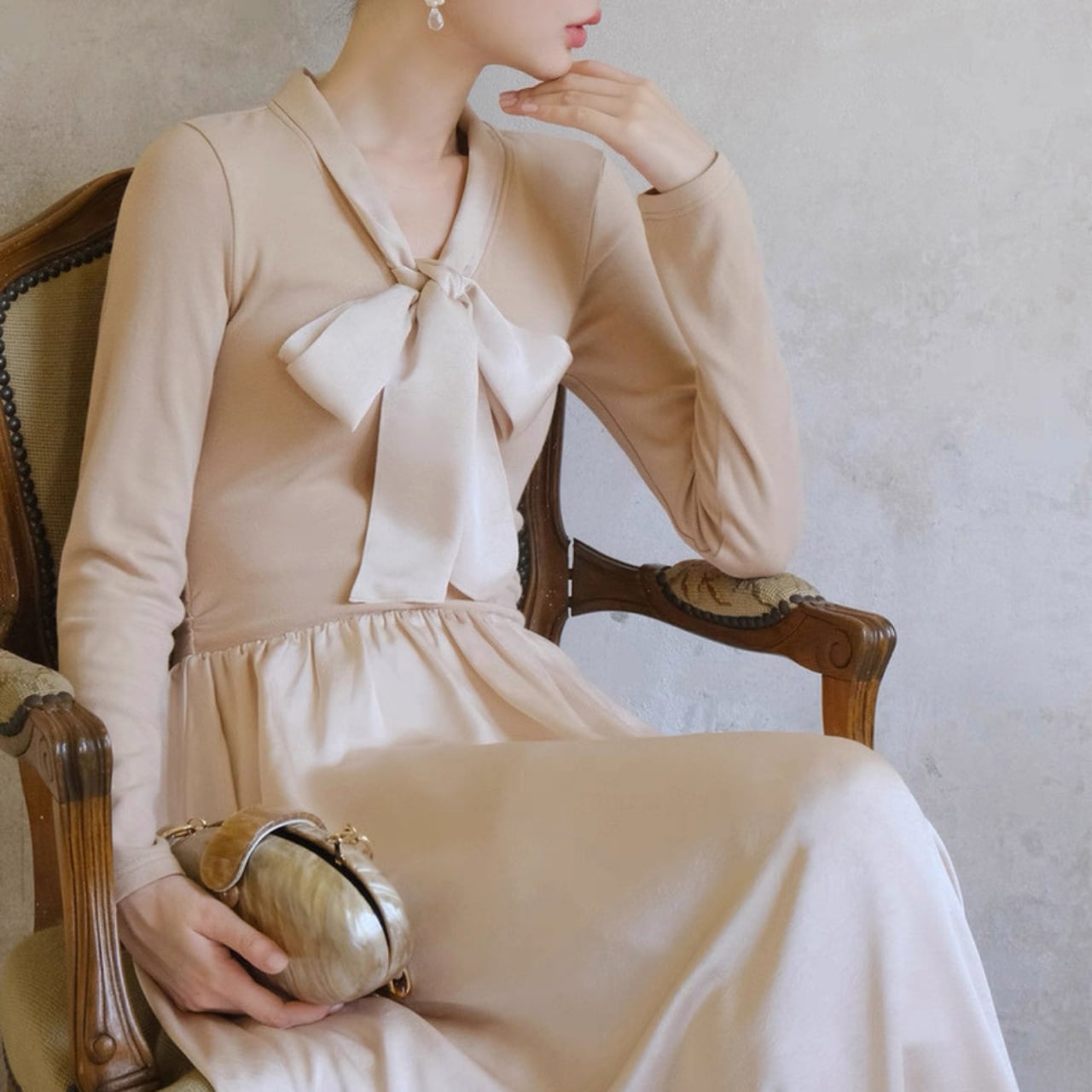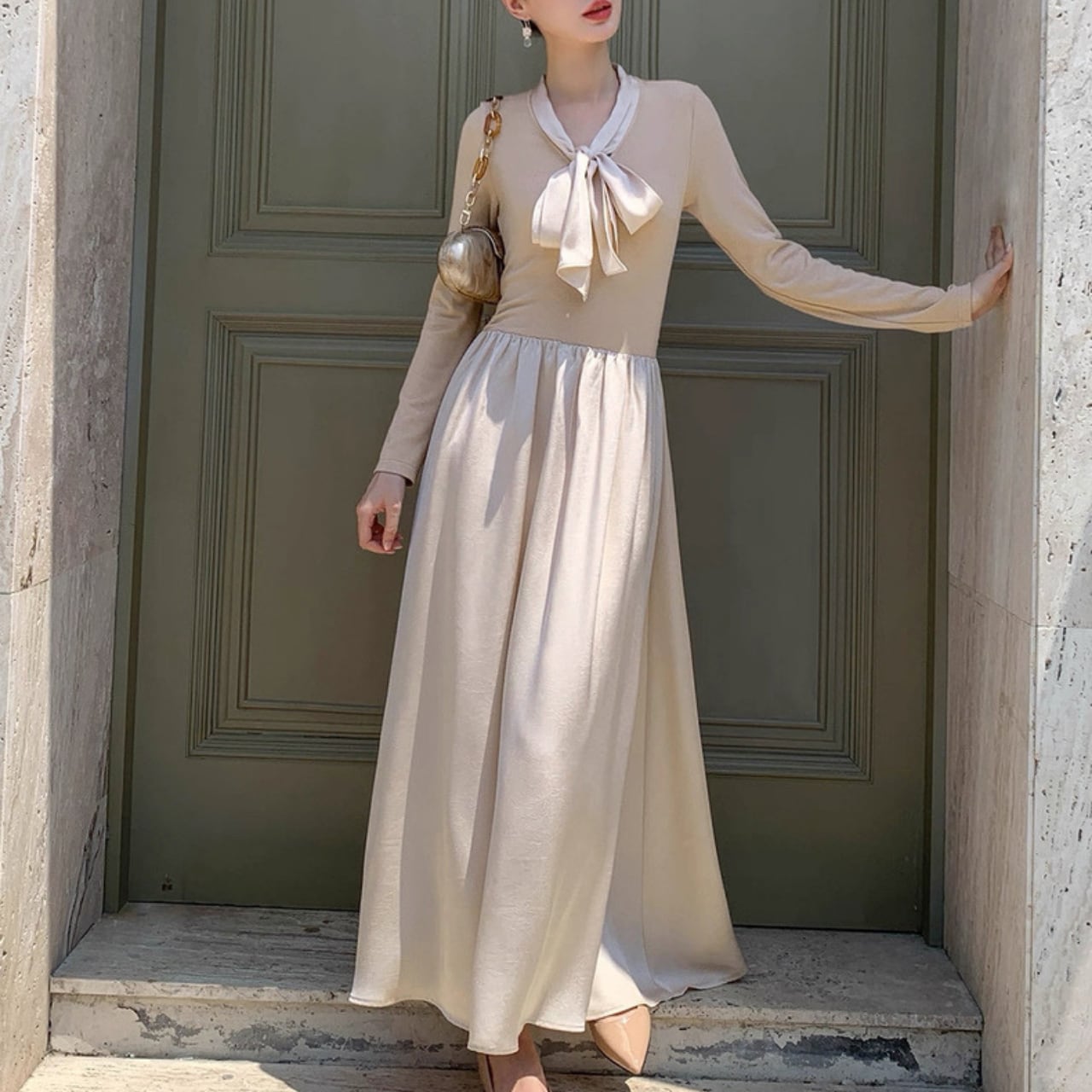 軽やかな揺れ感とリボンタイが上品なアクセントになるロングワンピース。
