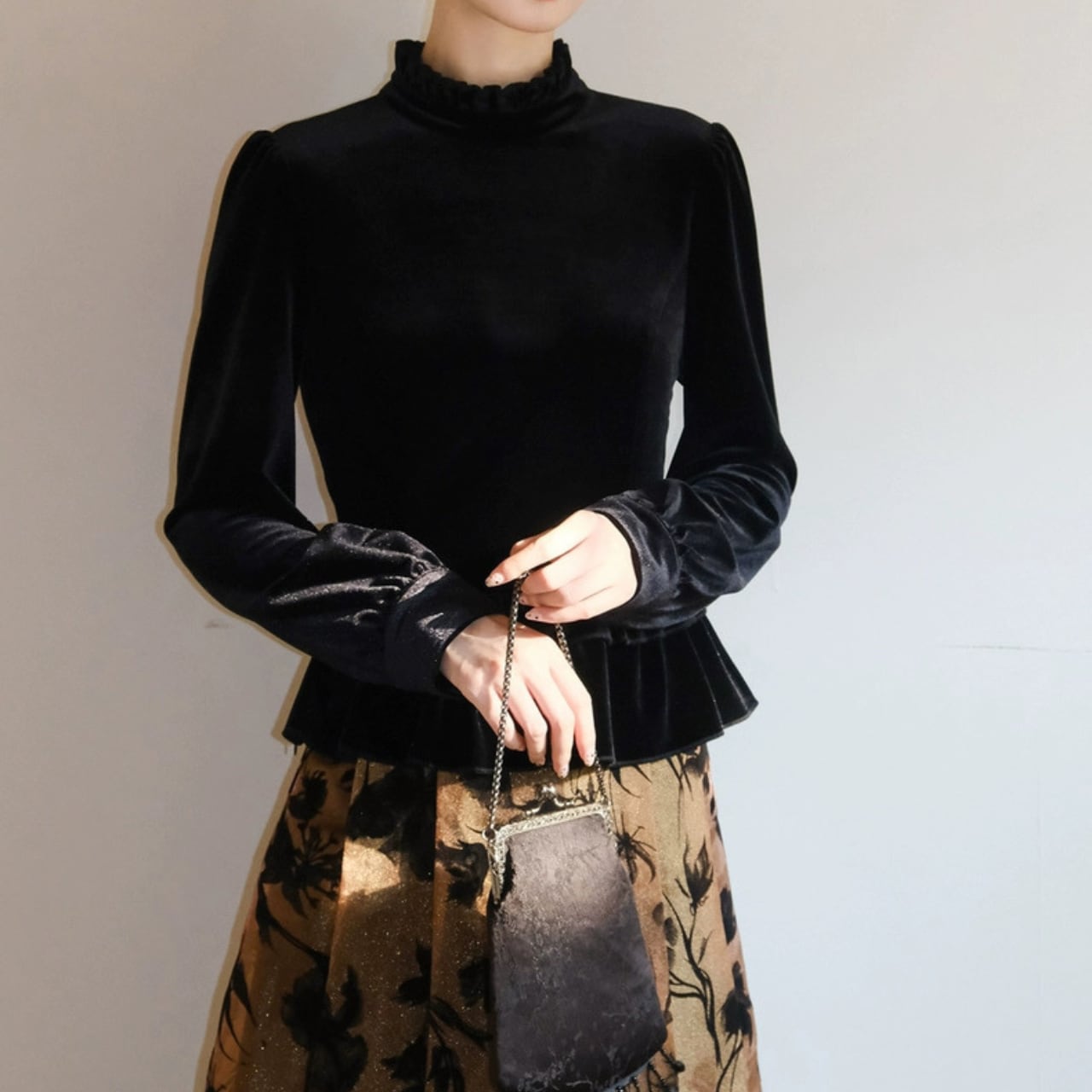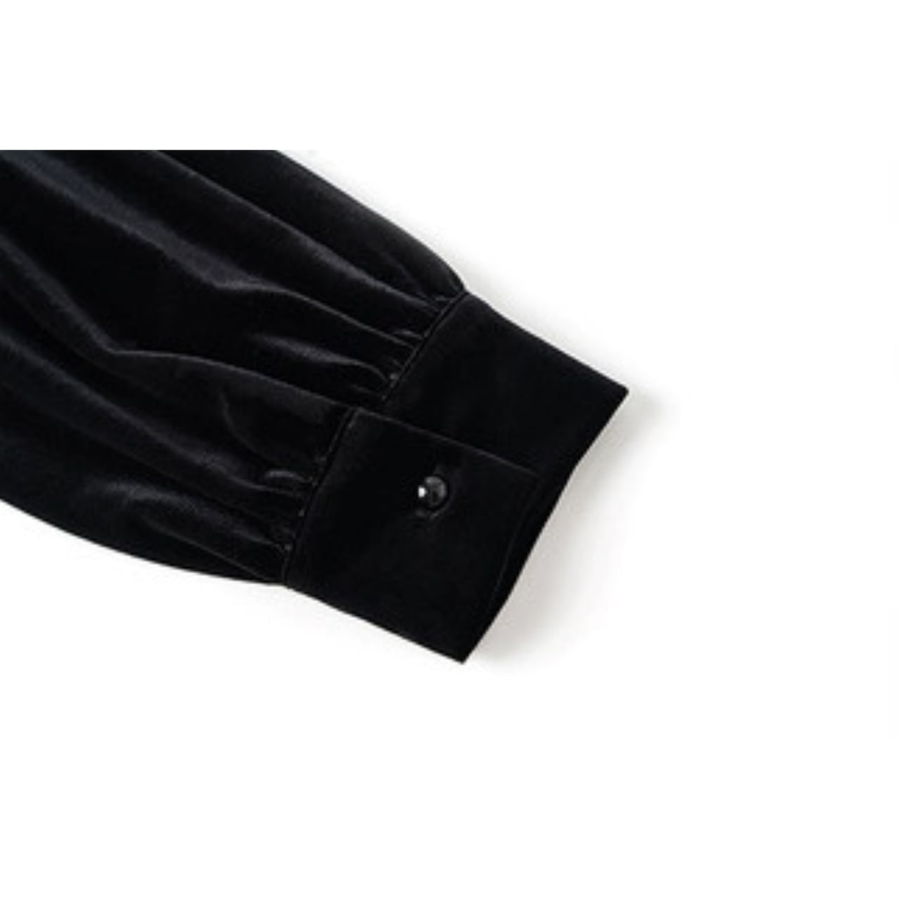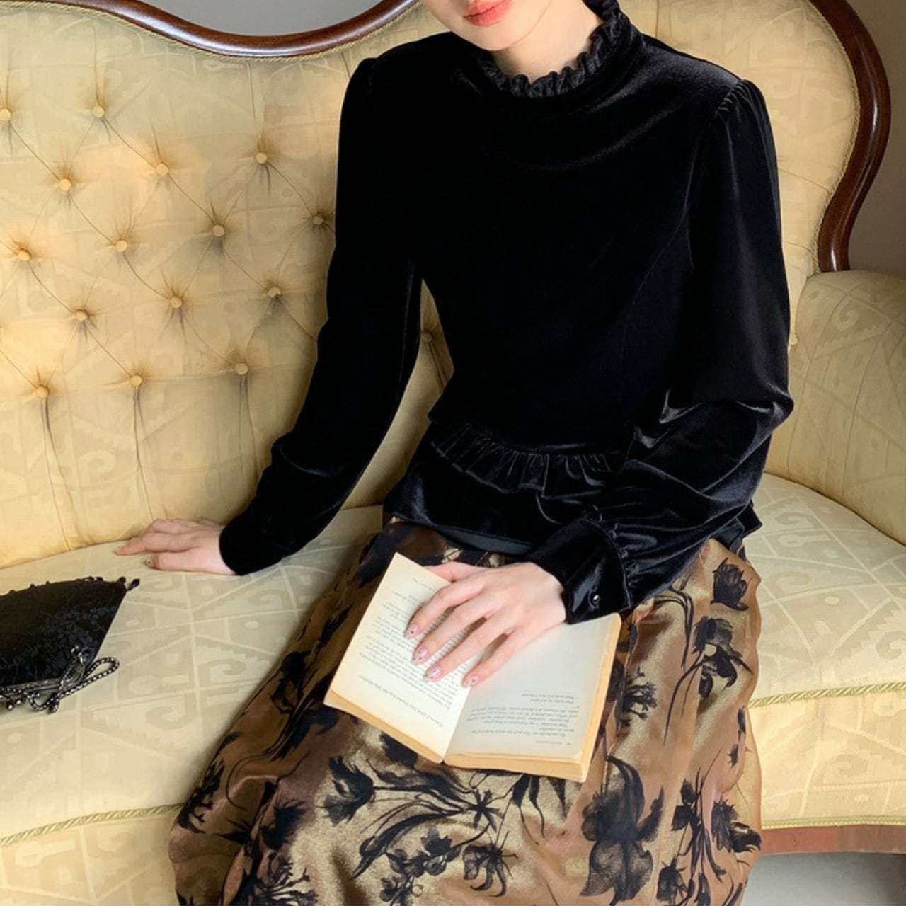 上品な光沢を放つベルベット素材に、首元と裾にあしらわれたフリルが