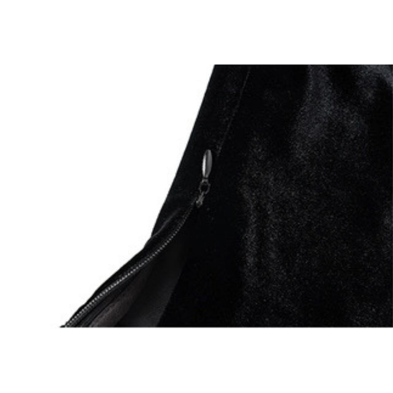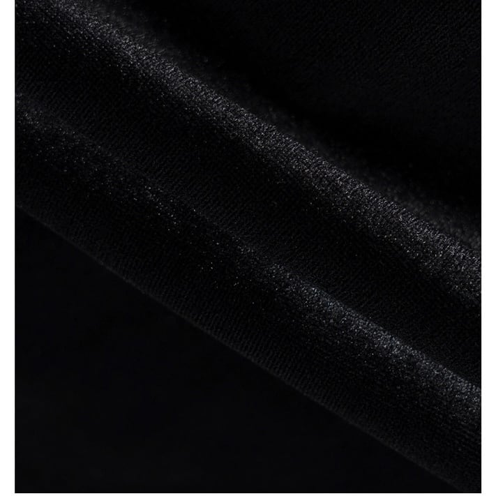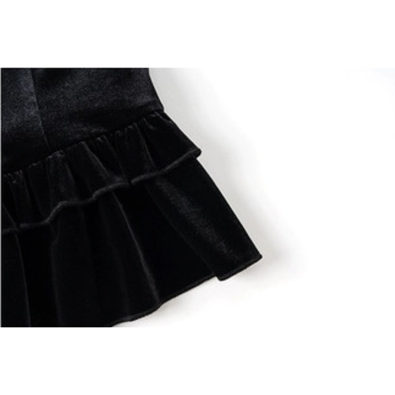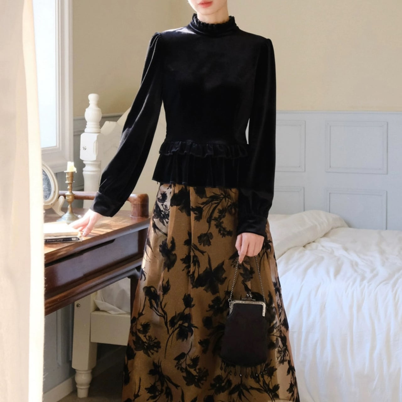 上品な光沢を放つベルベット素材に、首元と裾にあしらわれたフリルが