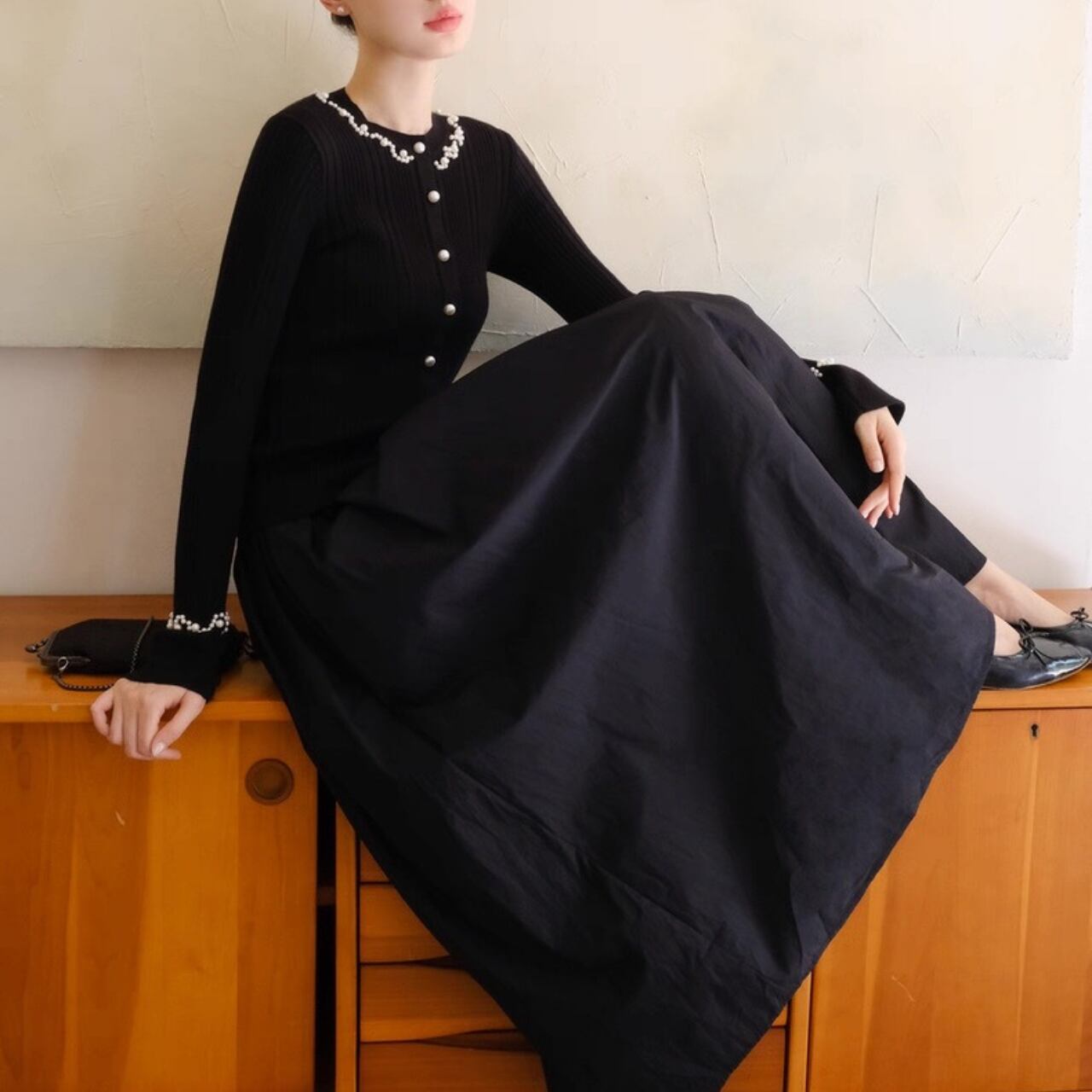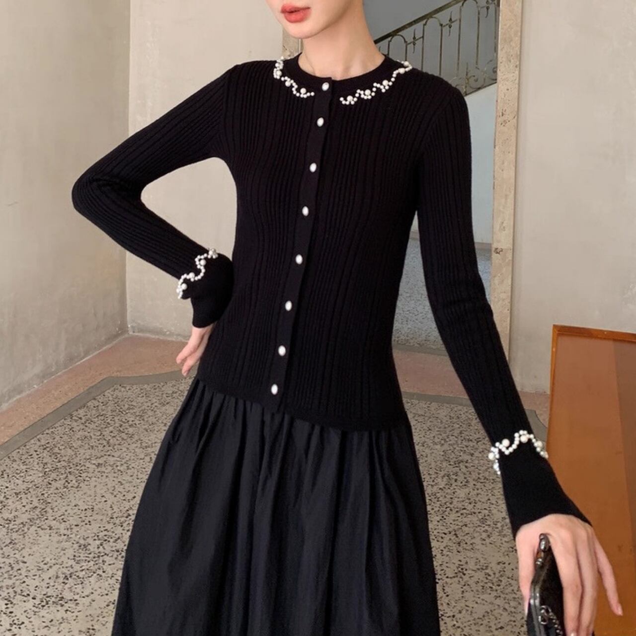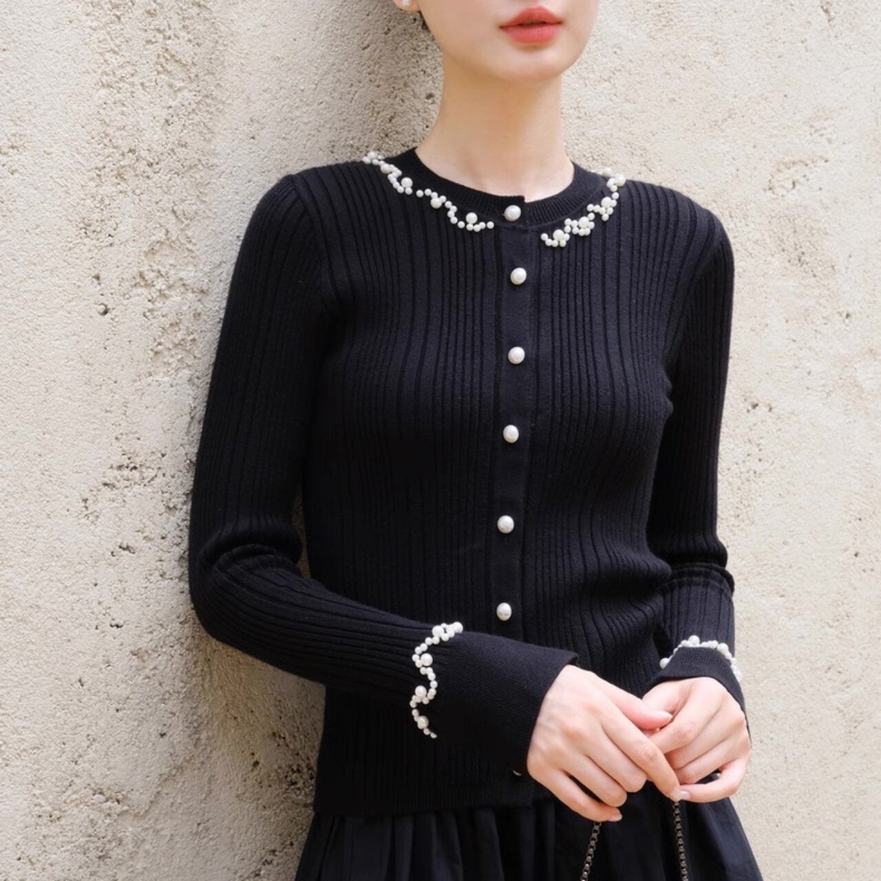上品な光沢を放つパールが襟元と袖口を彩り、