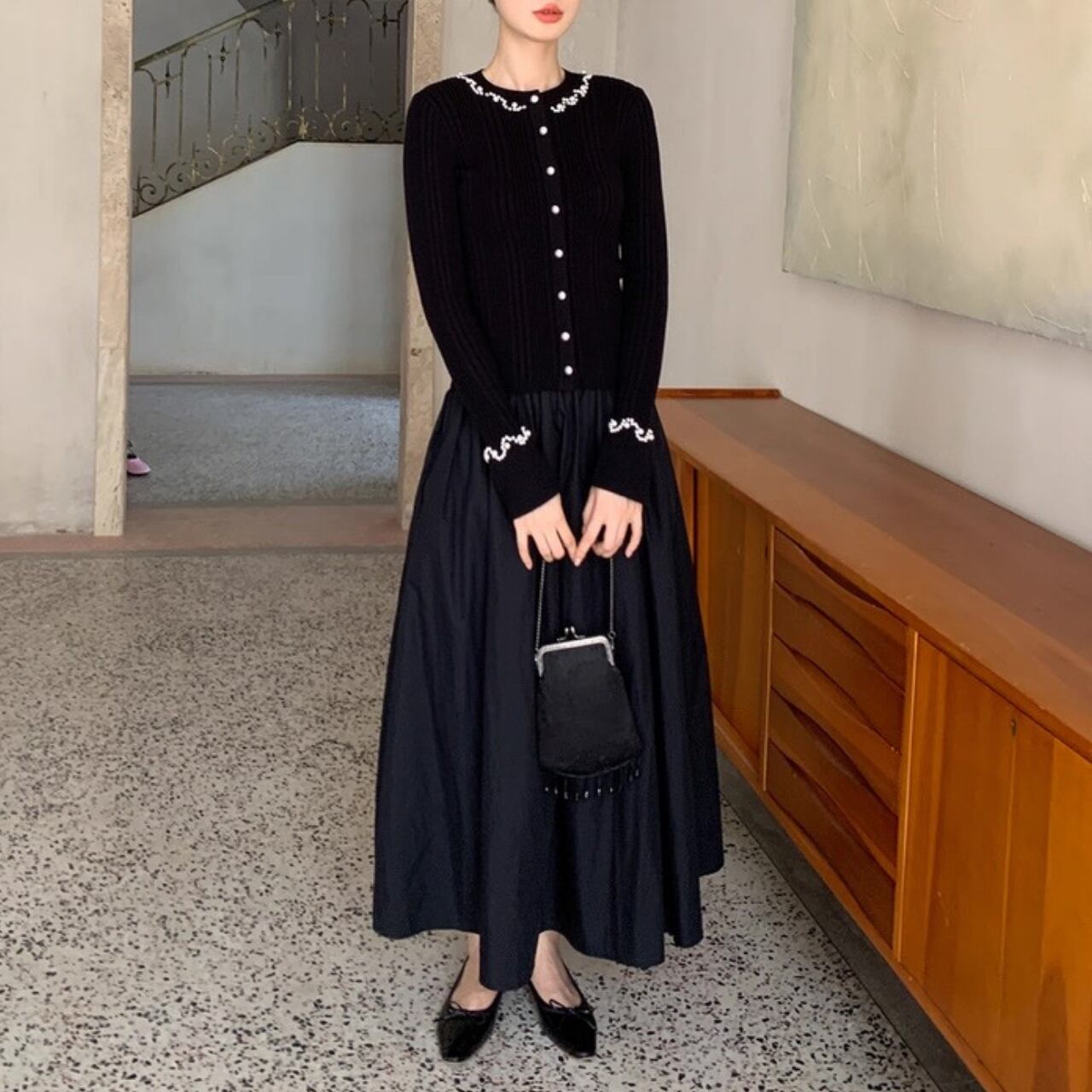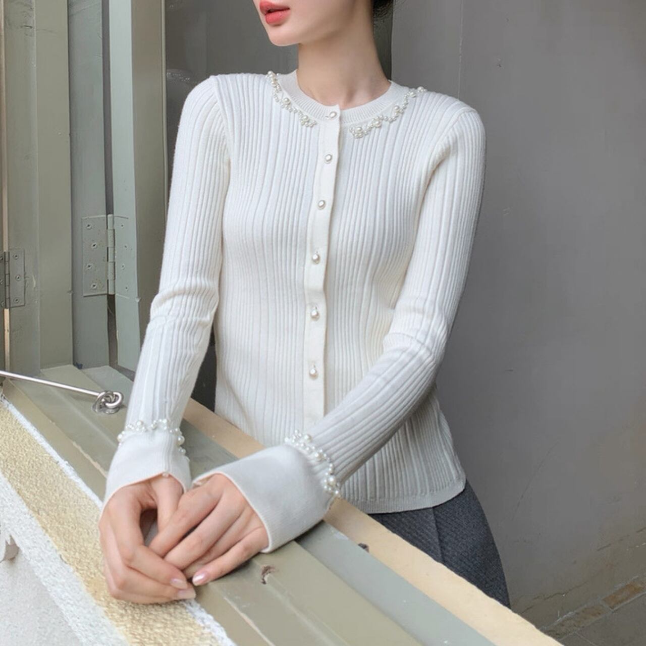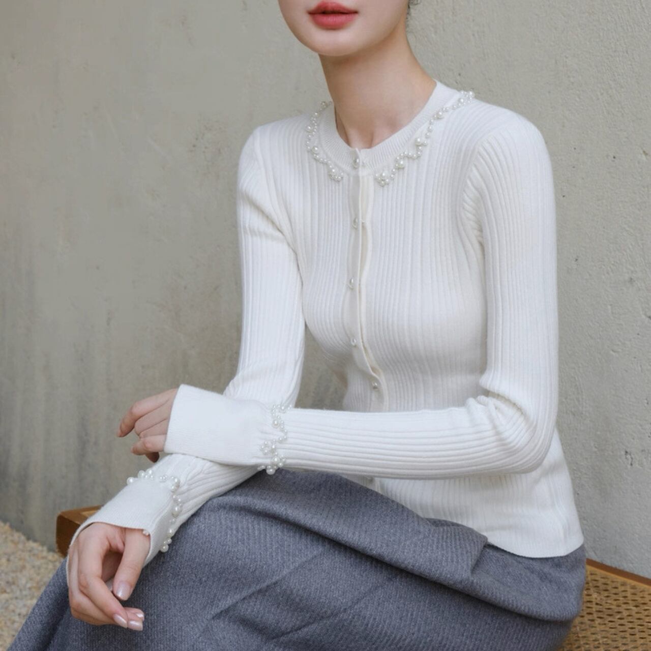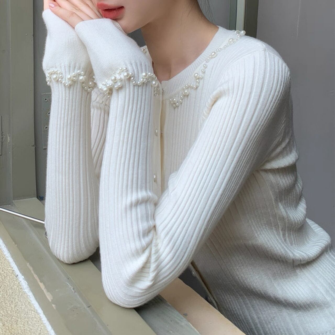上品な光沢を放つパールが襟元と袖口を彩り、