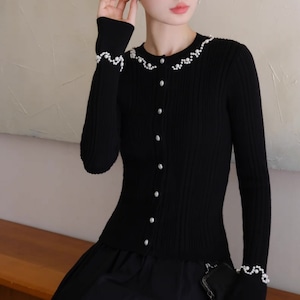 クラシカルな女性らしさを引き立てるニットカーディガン。