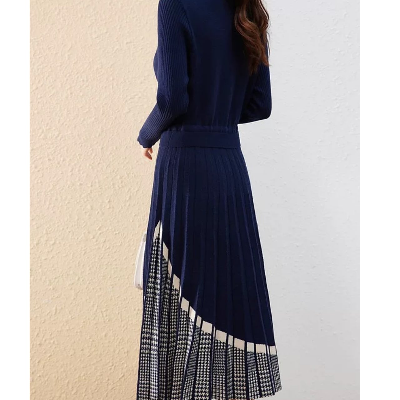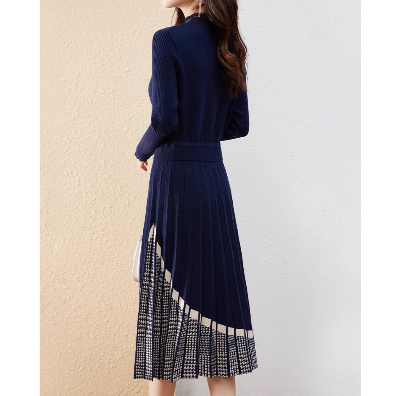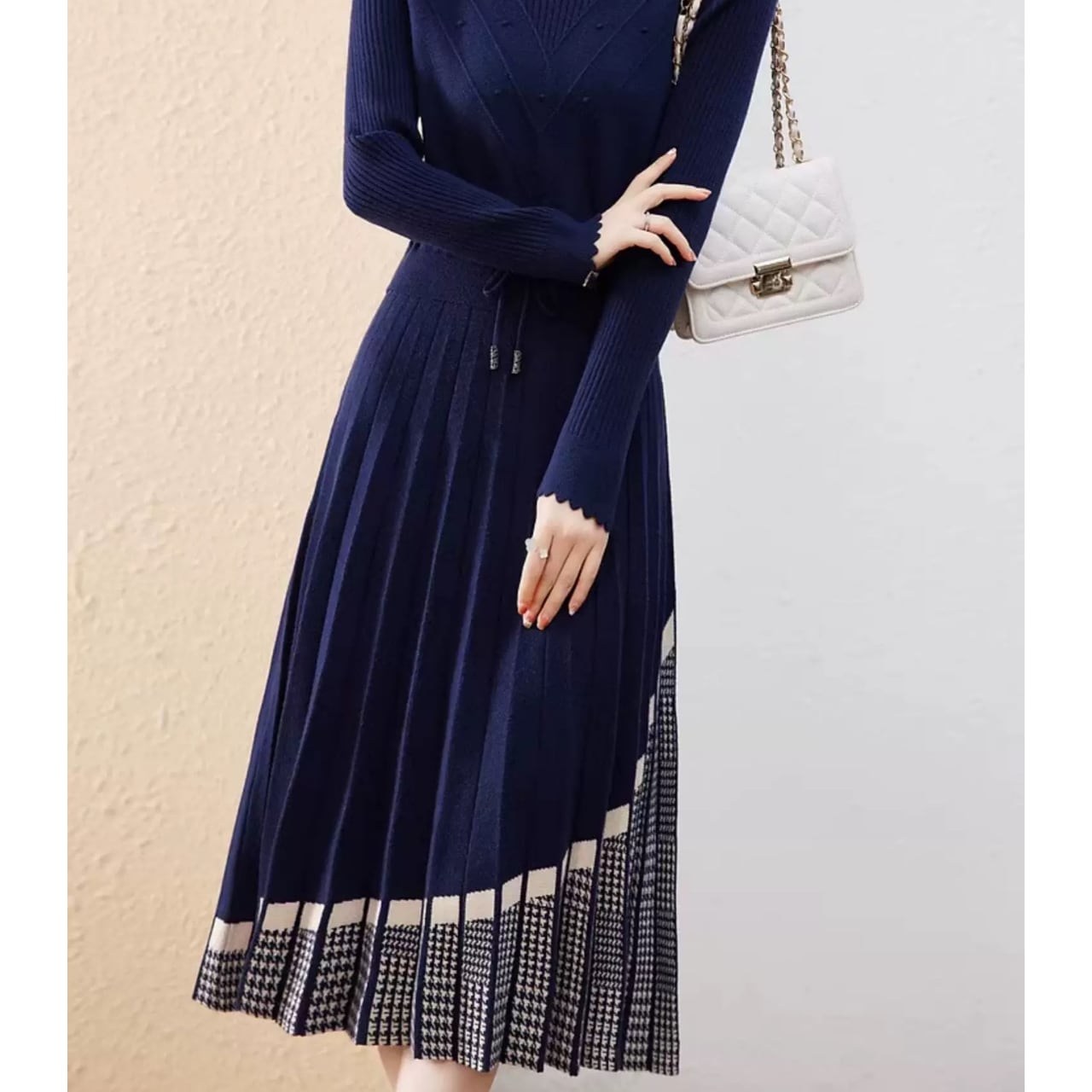 落ち着きのあるネイビーにプリーツスカートが映える上品なニットワンピース。