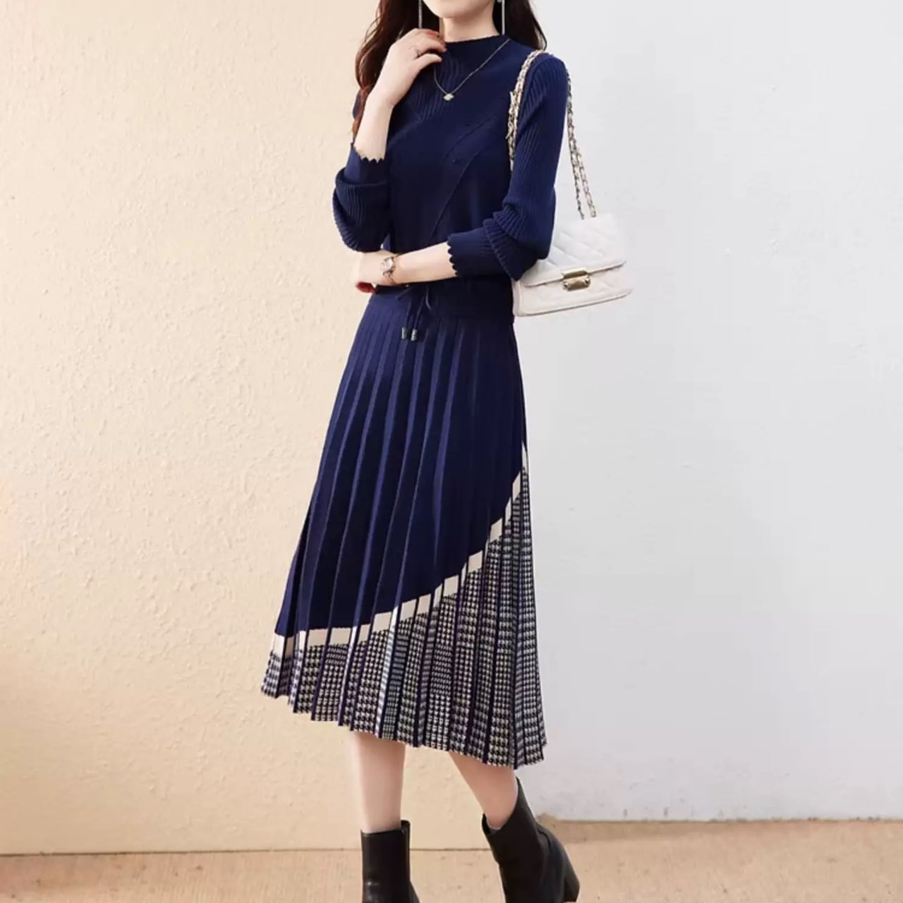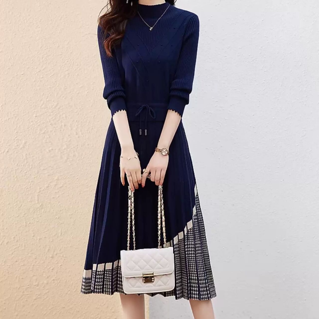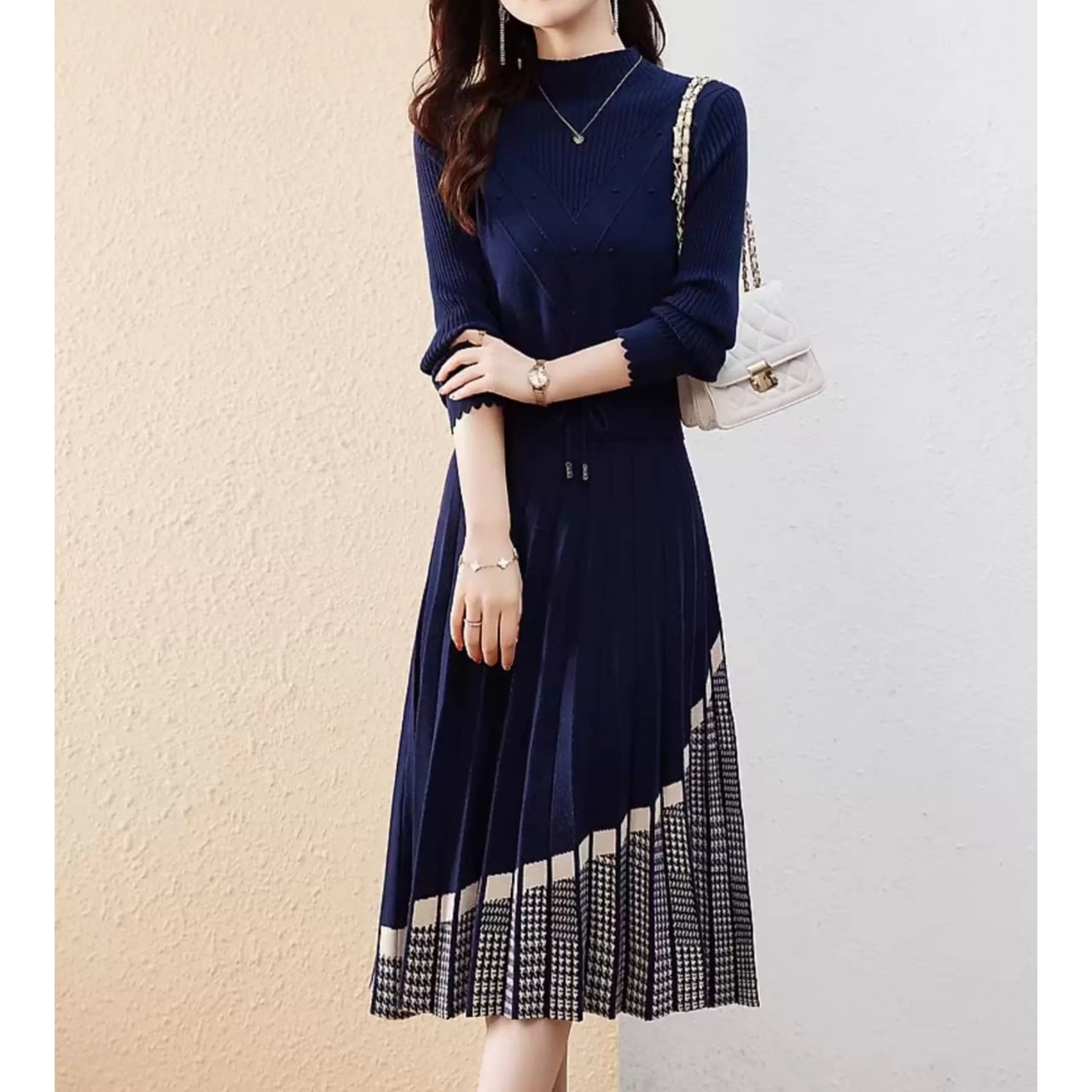 落ち着きのあるネイビーにプリーツスカートが映える上品なニットワンピース。