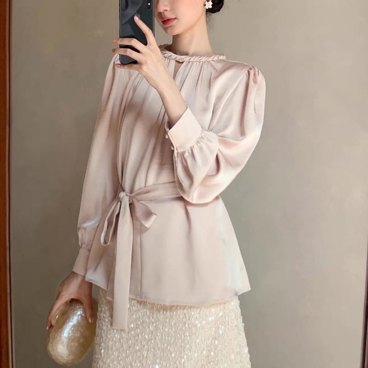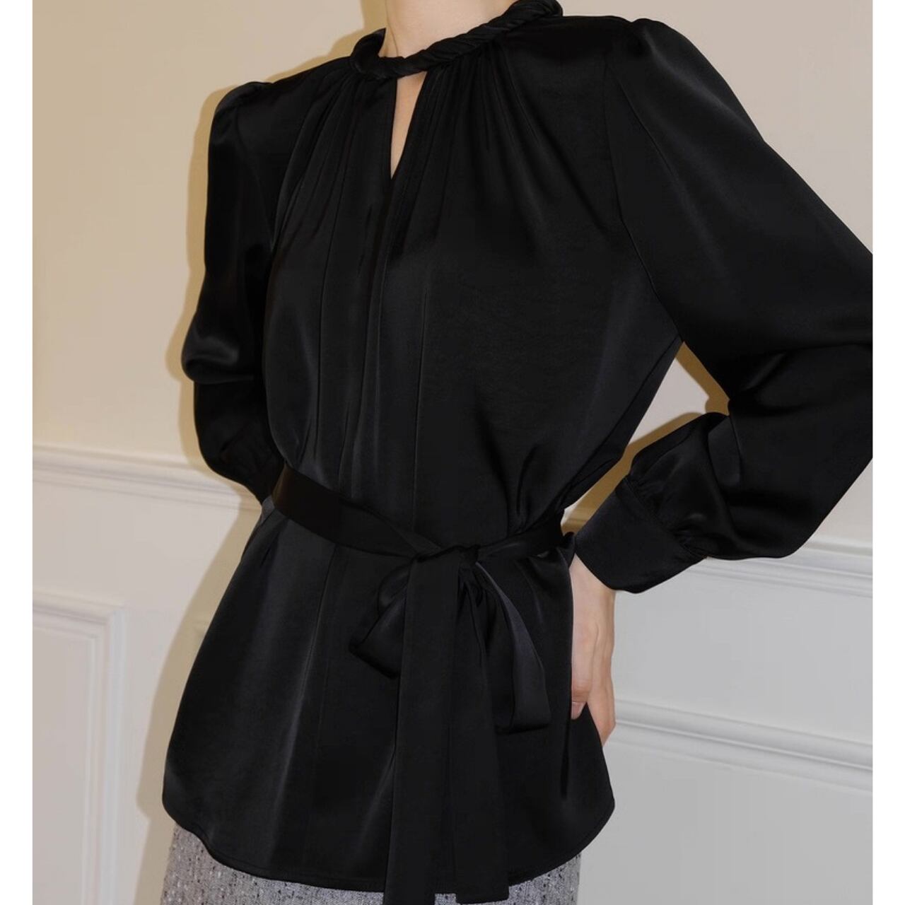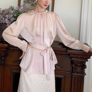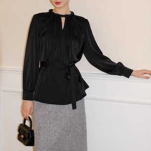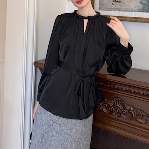 上品な光沢を放つサテン調素材が、大人の女性らしさを際立たせるフレンチブラウス。