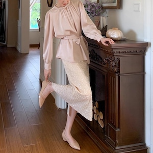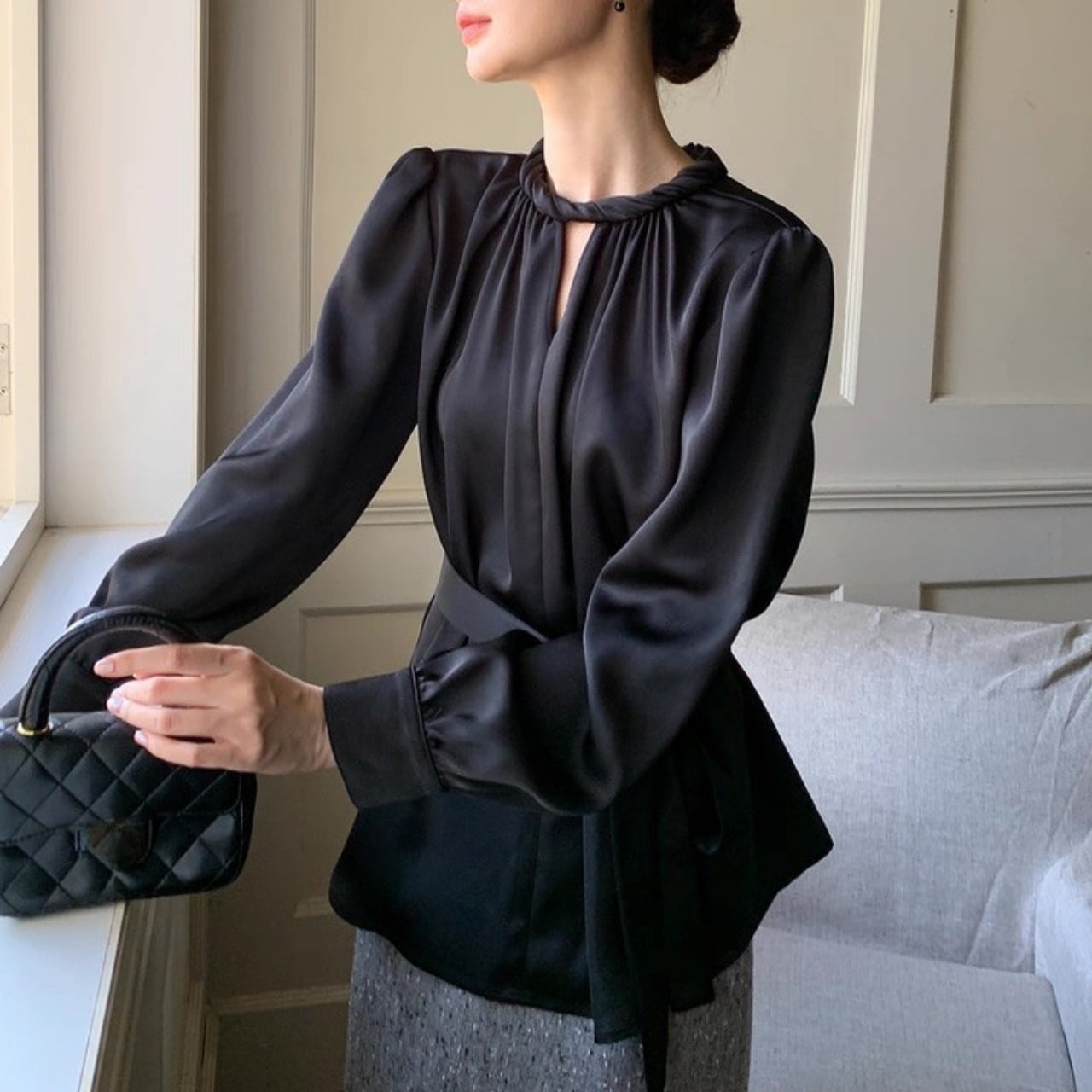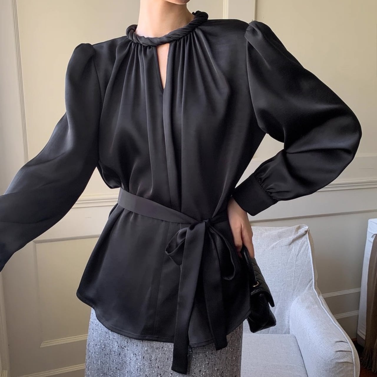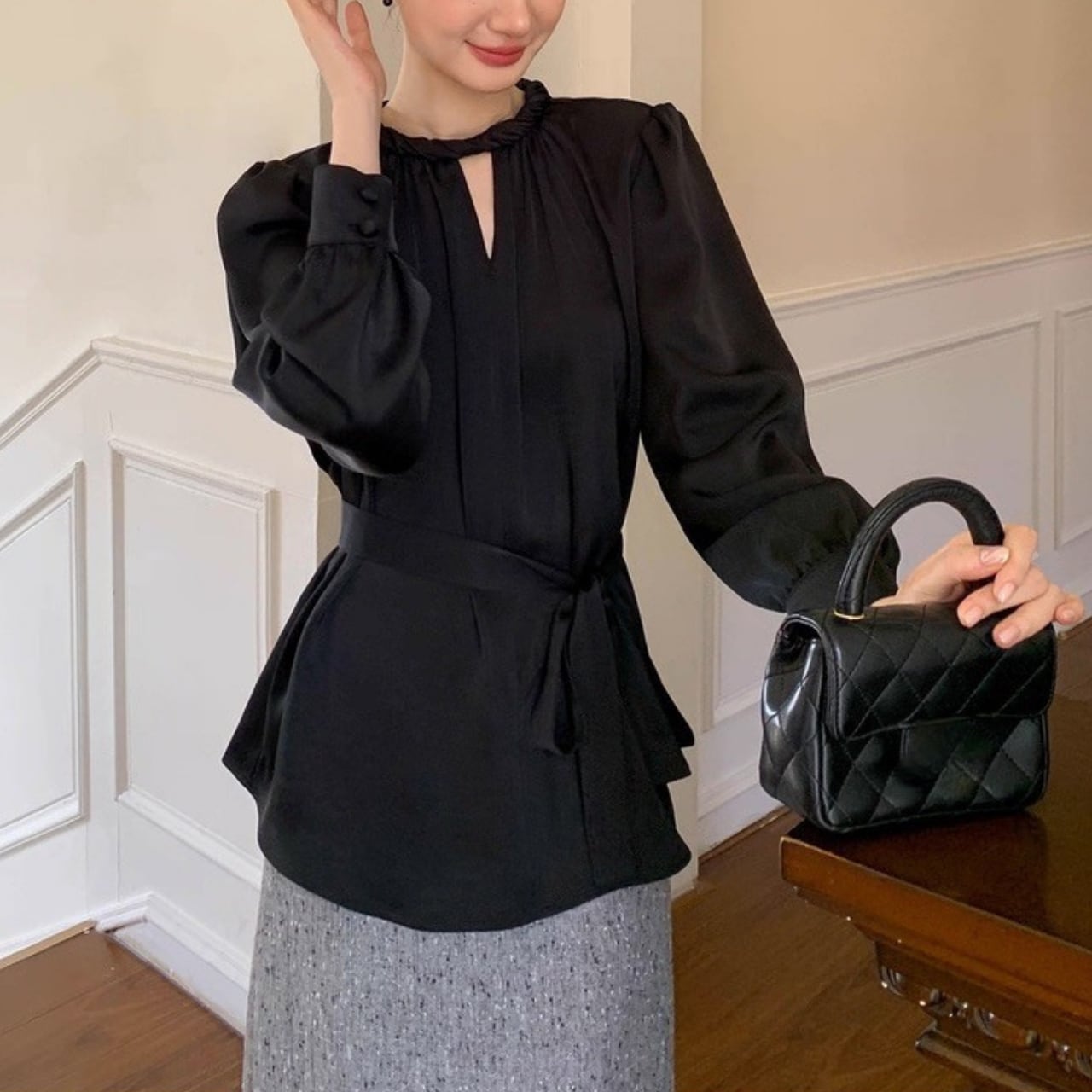 上品な光沢を放つサテン調素材が、大人の女性らしさを際立たせるフレンチブラウス。