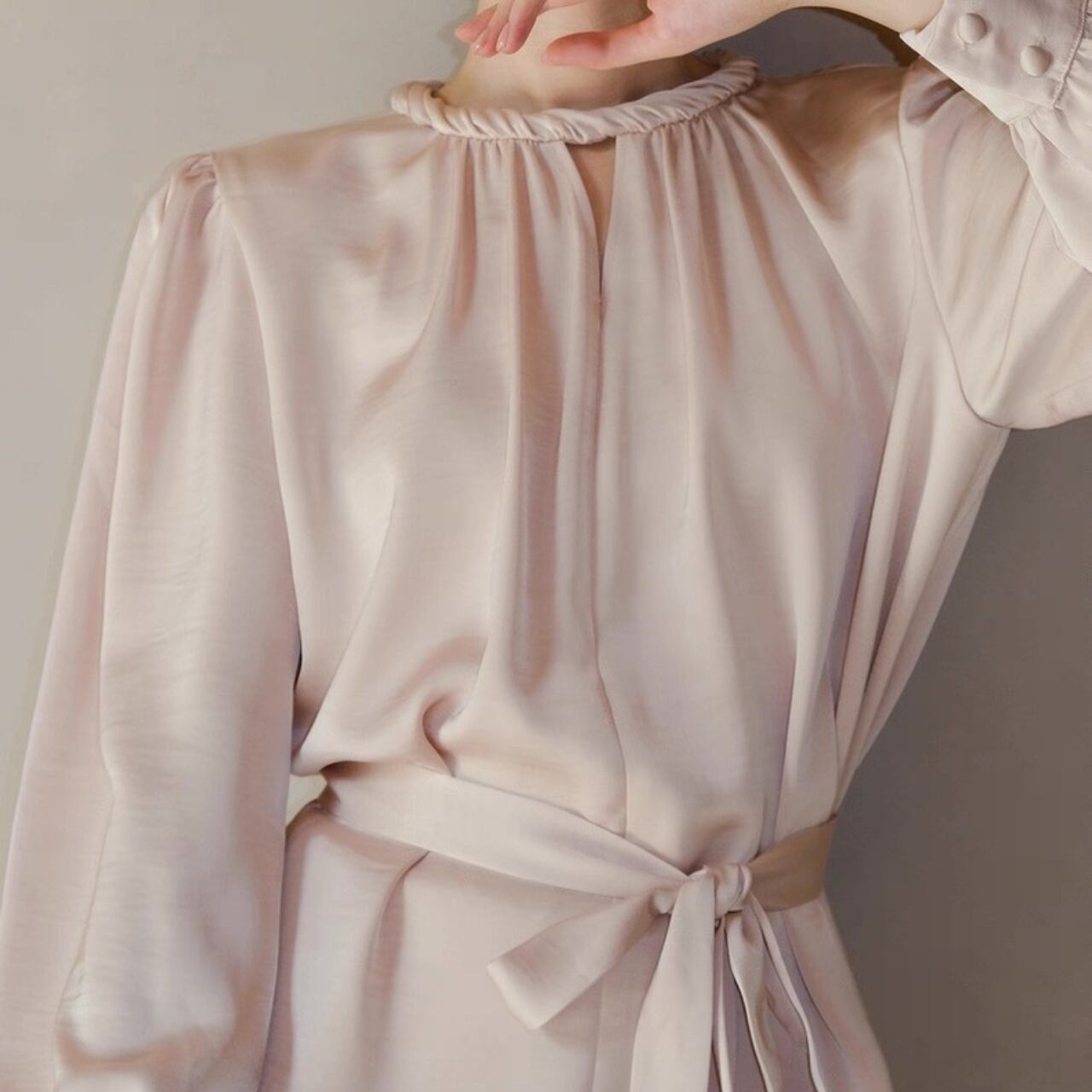 ネックラインのさりげないツイストとウエストリボンで、