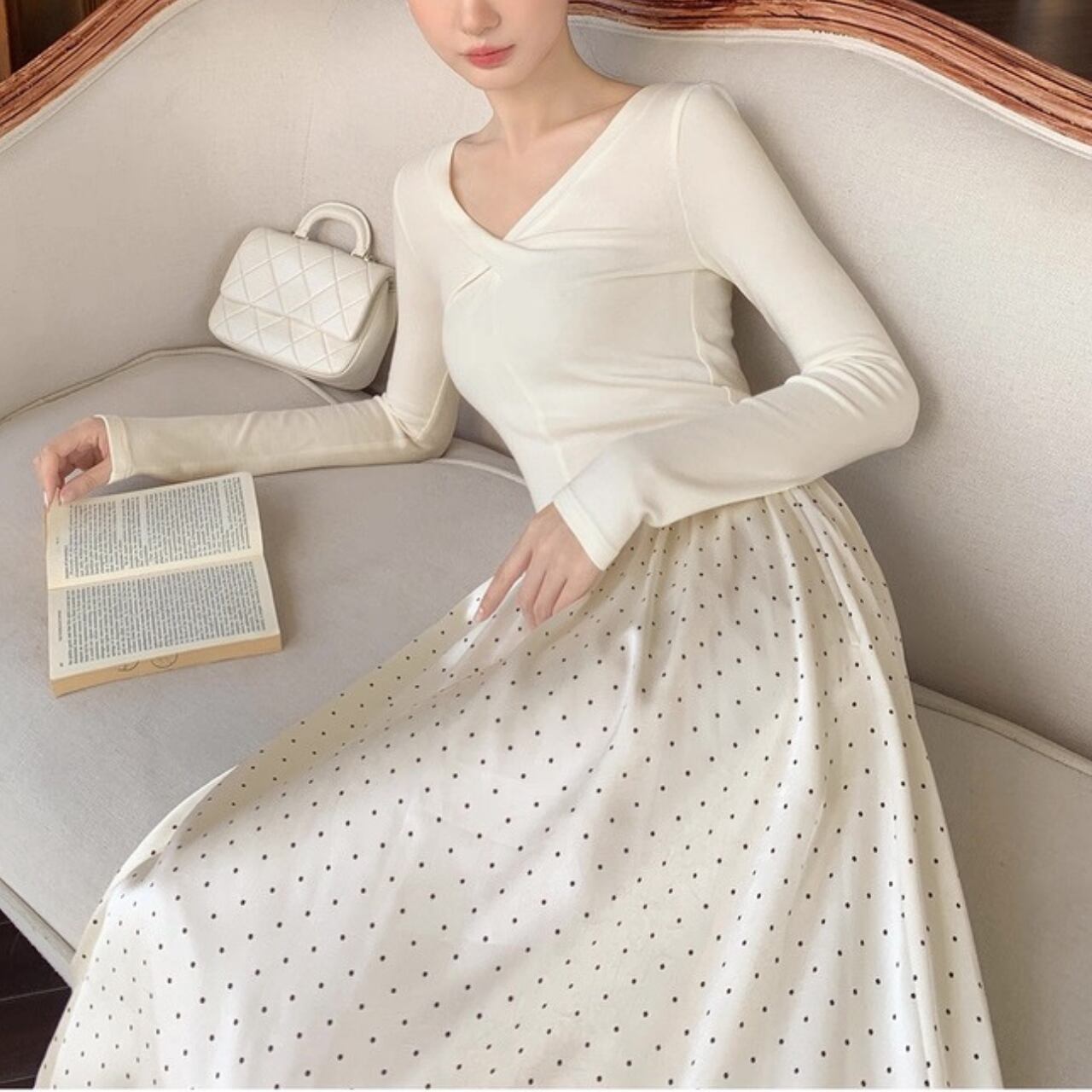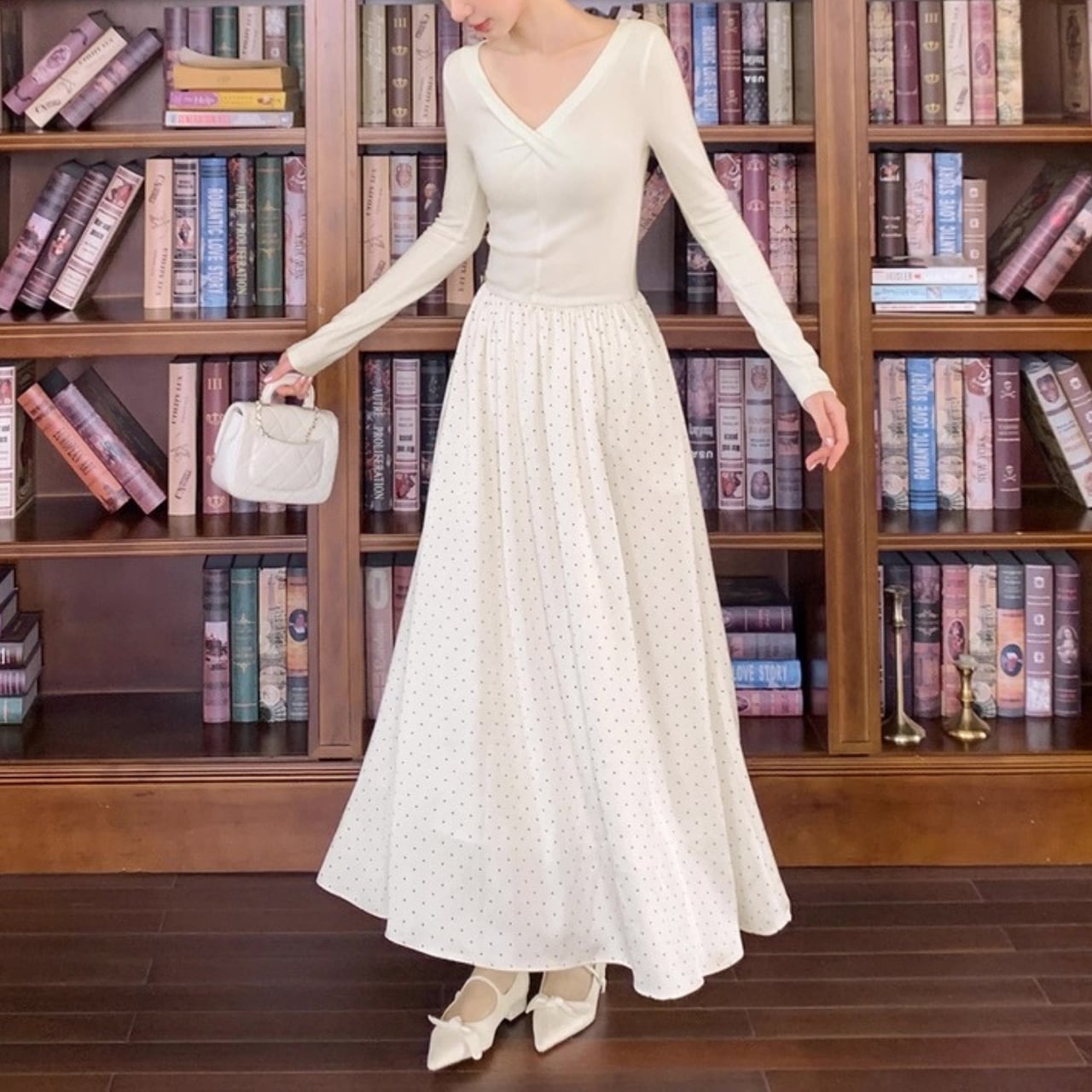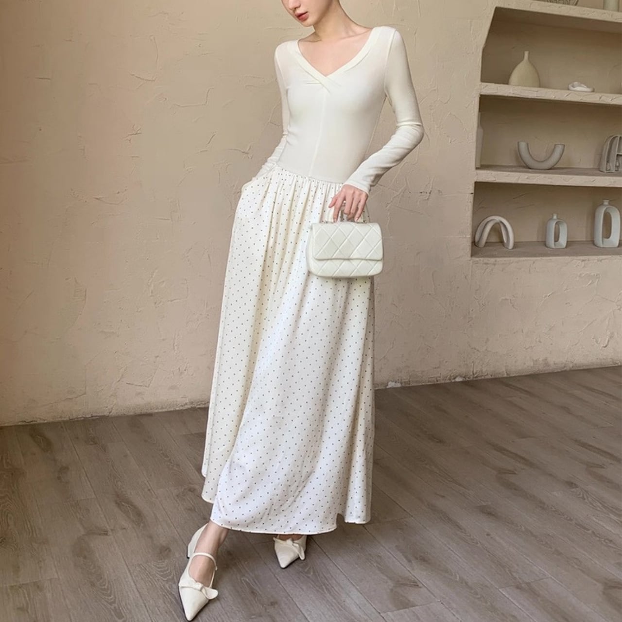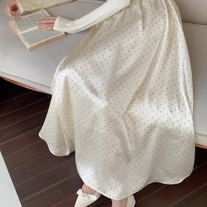 軽やかなドット柄スカートが歩くたびに揺れ、優雅で女性らしい雰囲気を演出します。