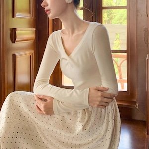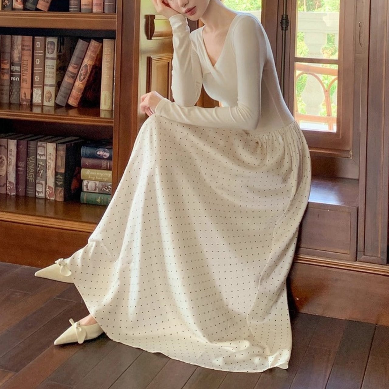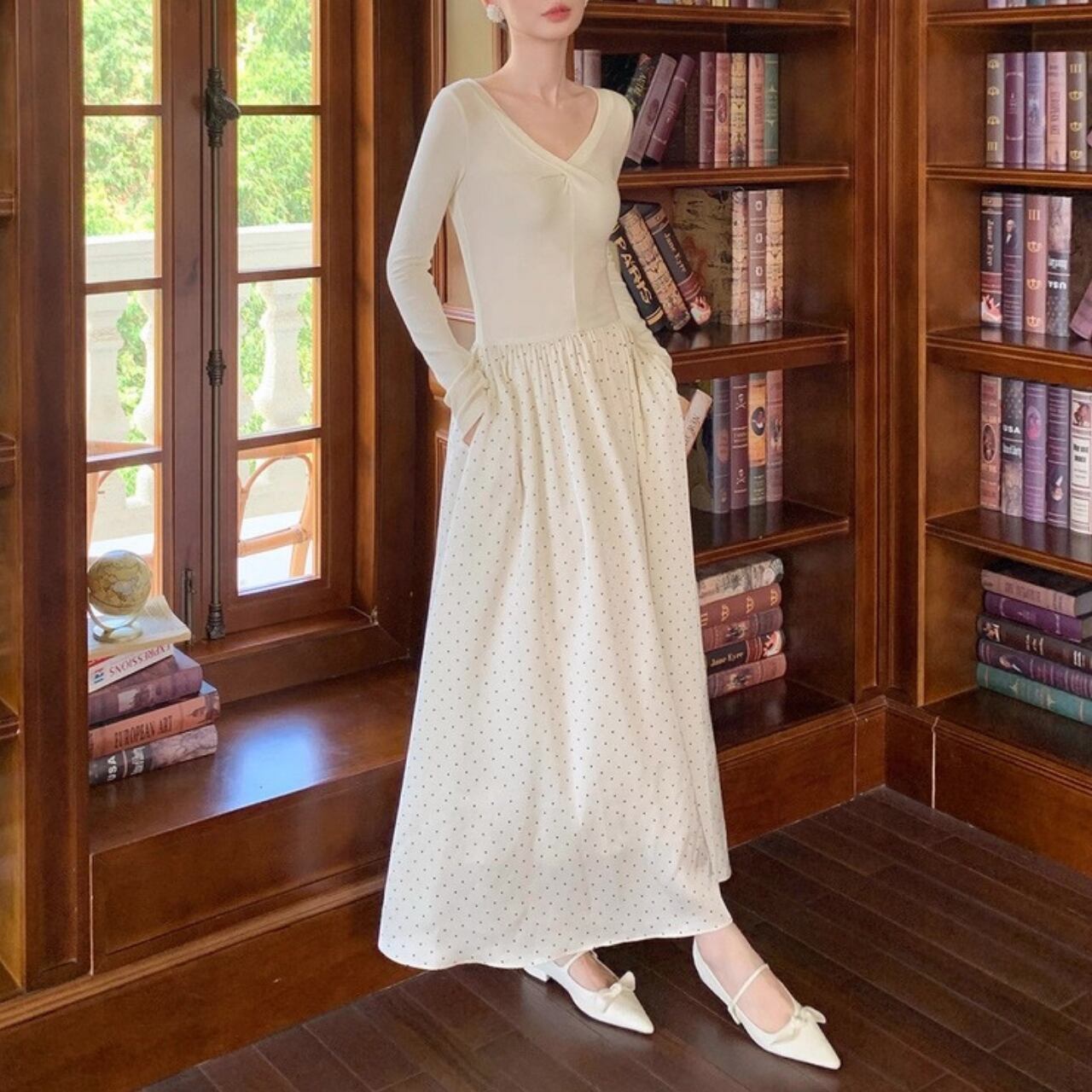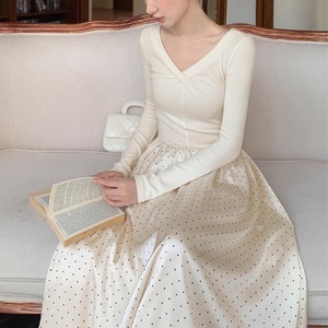 軽やかなドット柄スカートが歩くたびに揺れ、優雅で女性らしい雰囲気を演出します。
