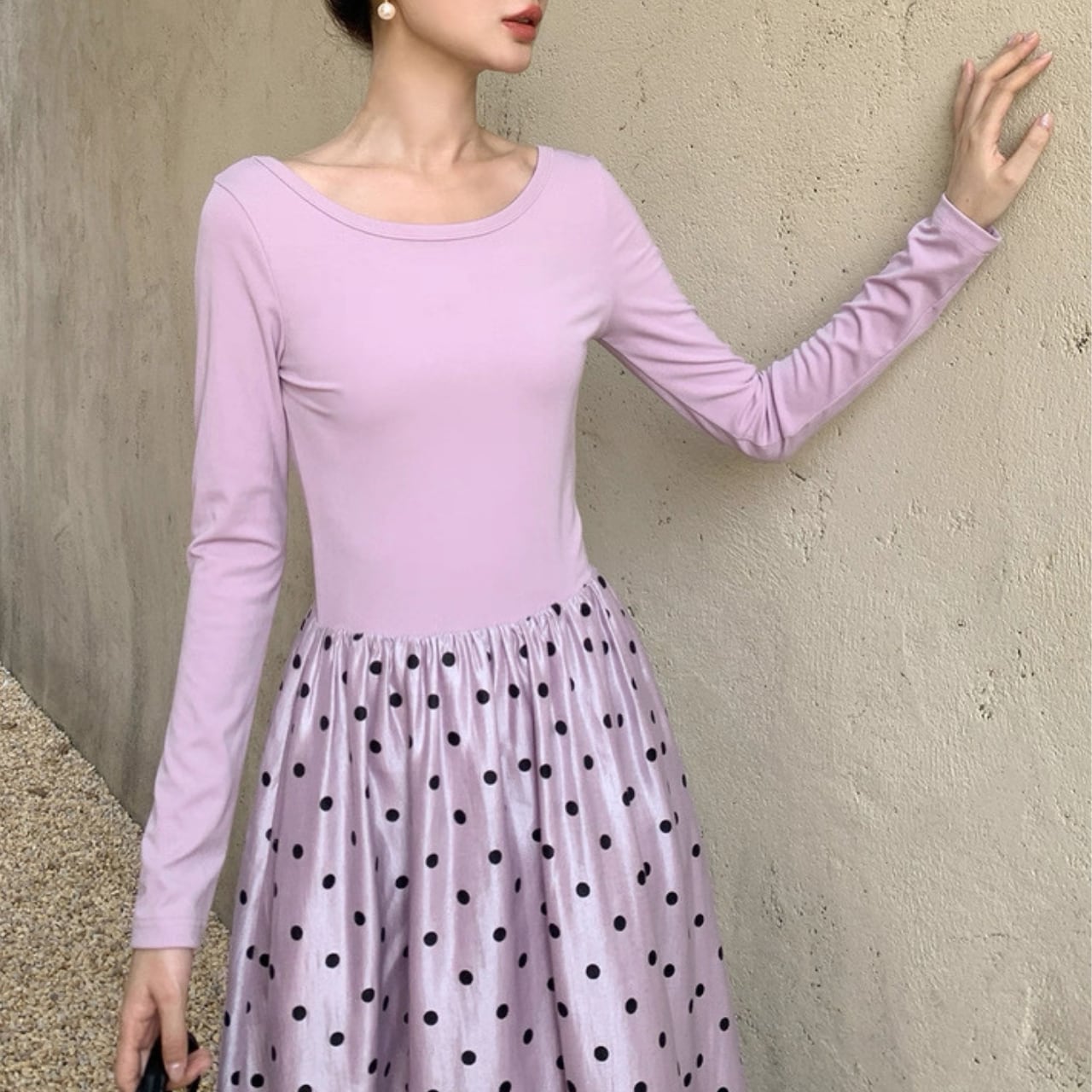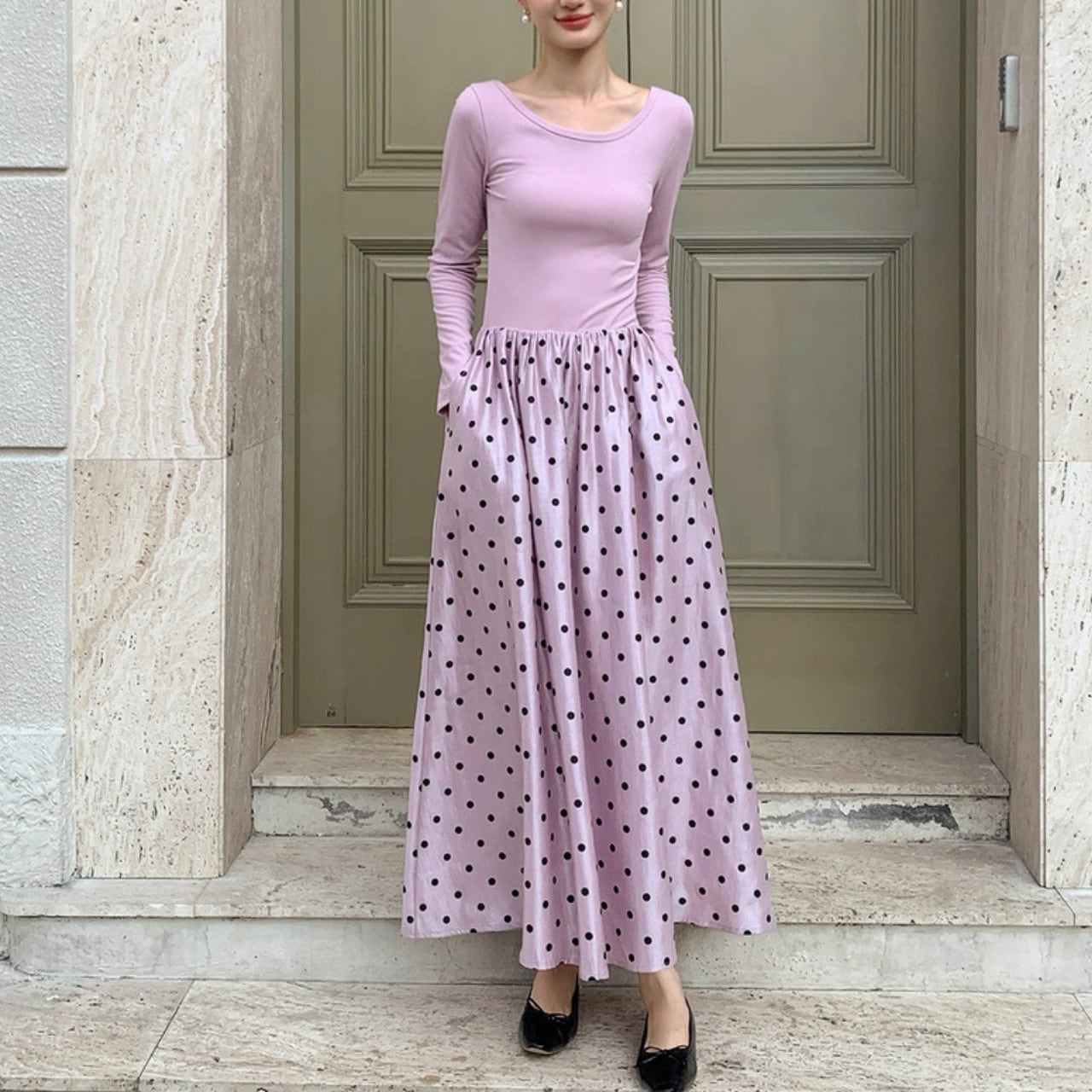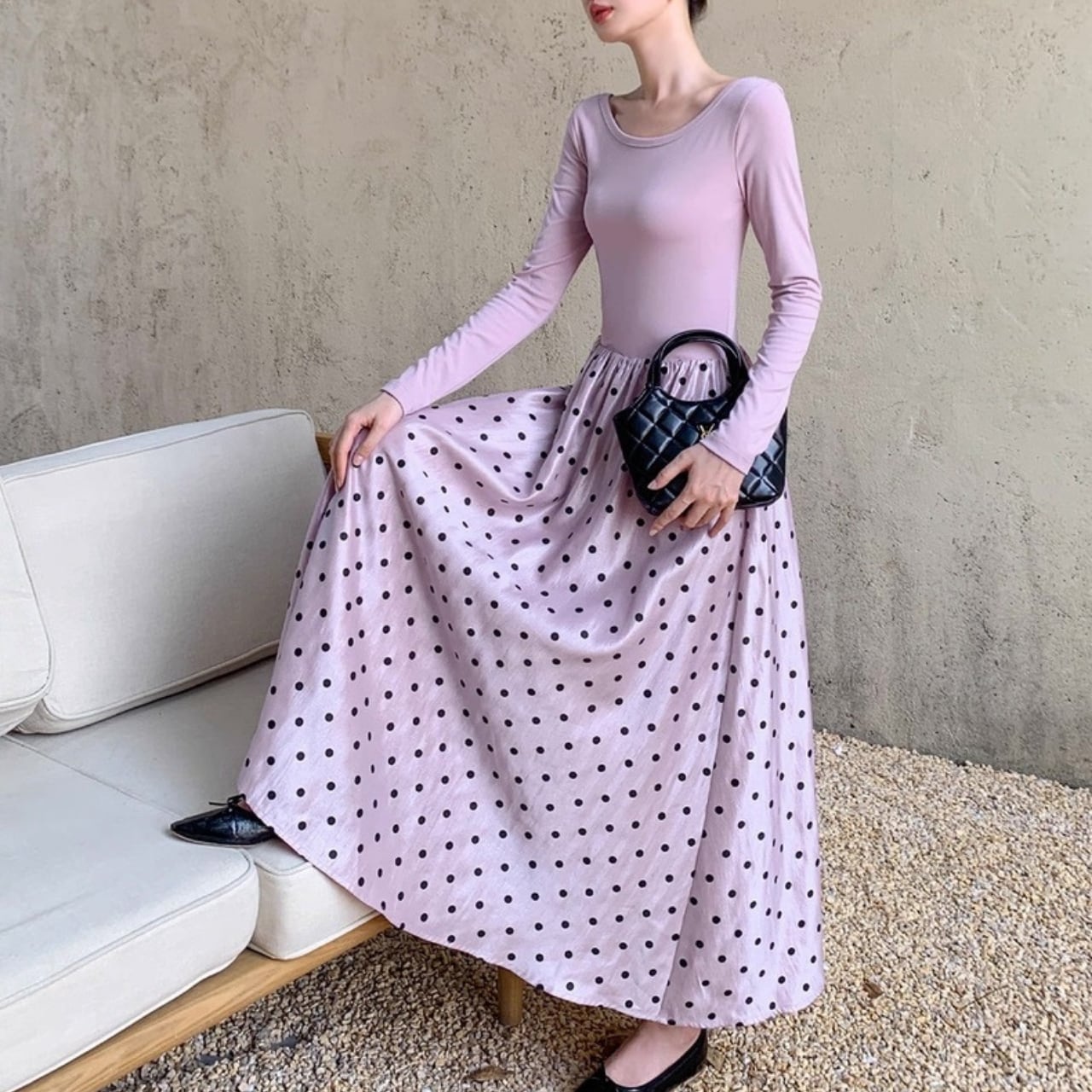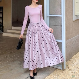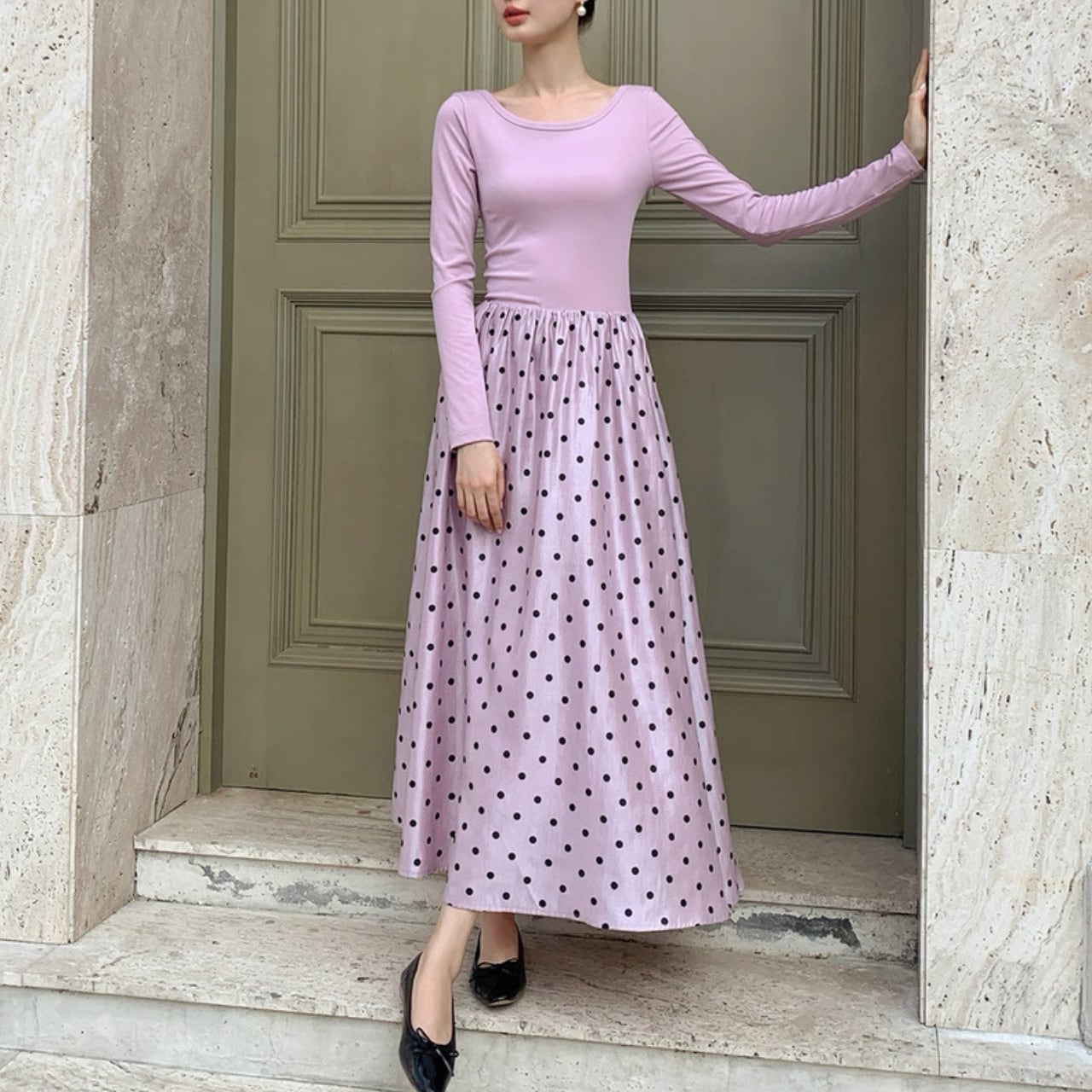 軽やかなドット柄スカートを組み合わせたフレンチムード漂うワンピース。
