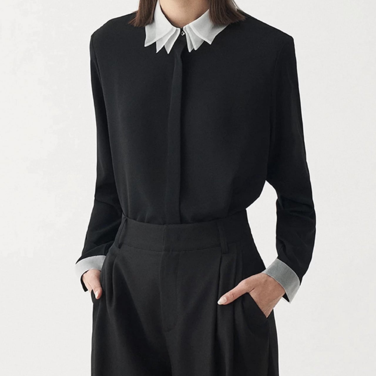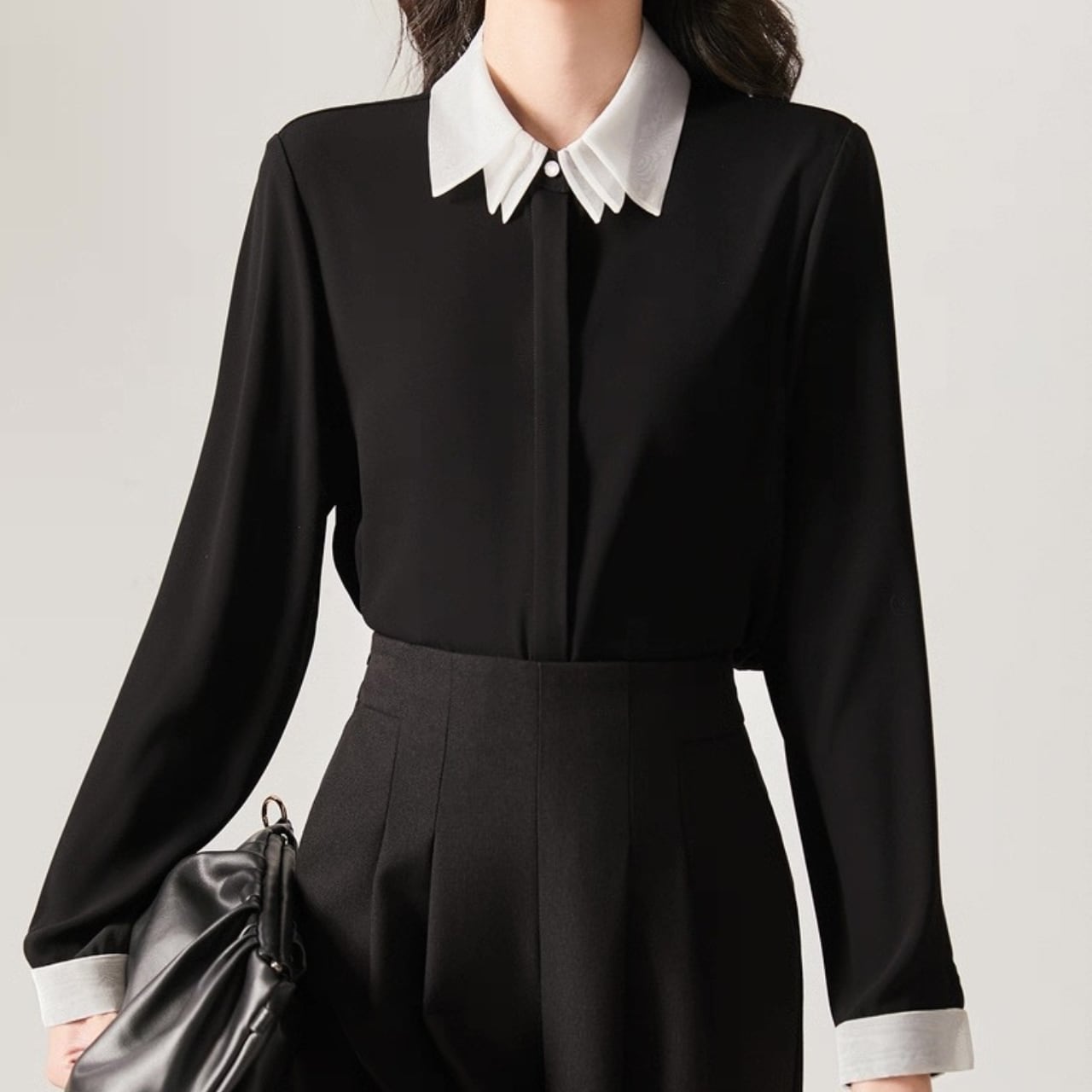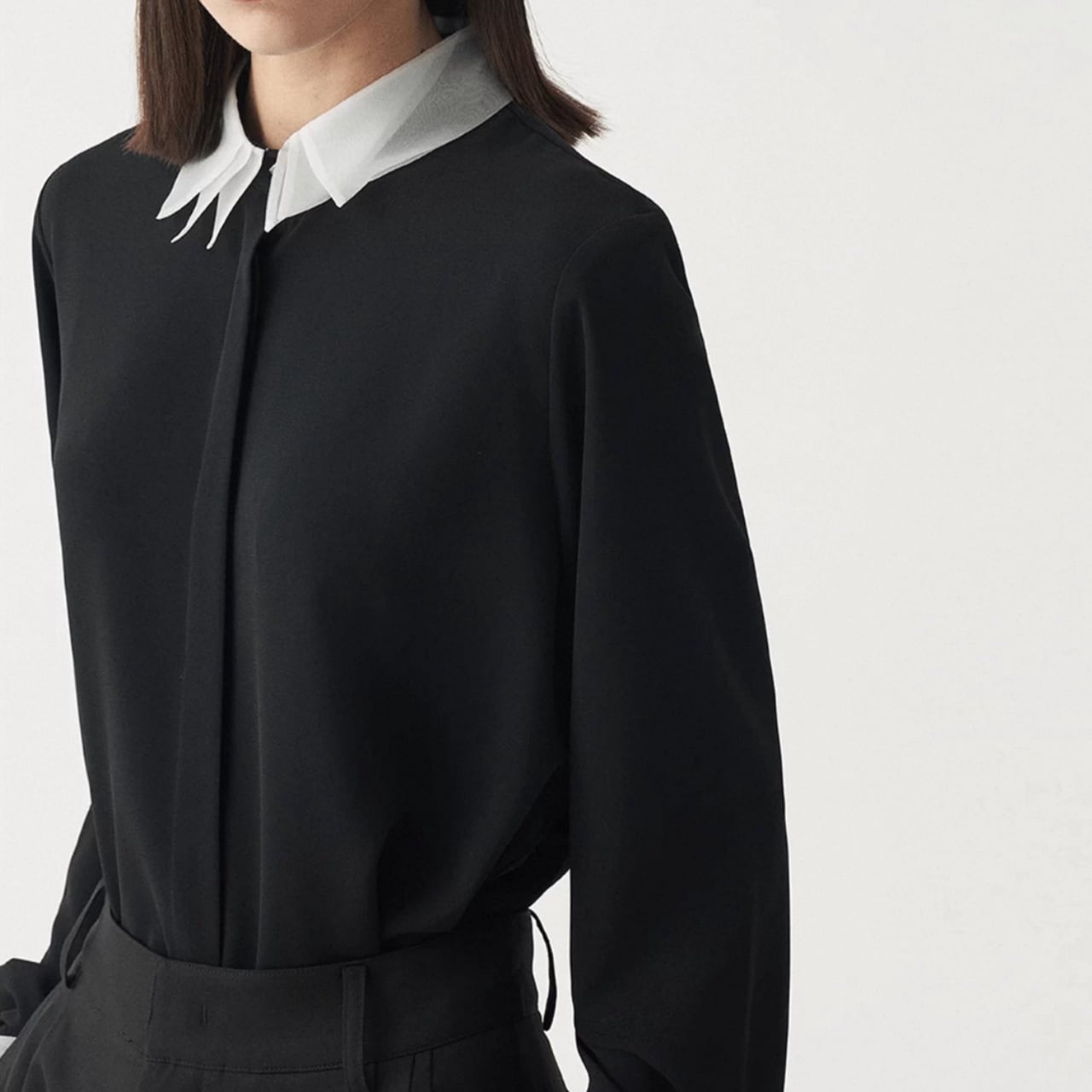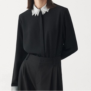 コントラストカラーの襟がアクセントになった長袖トップス。