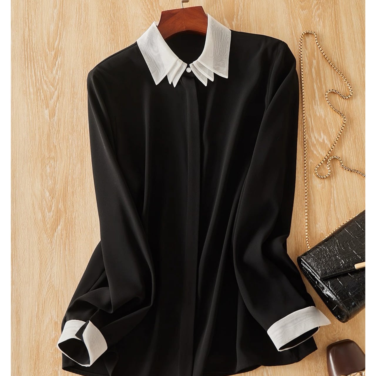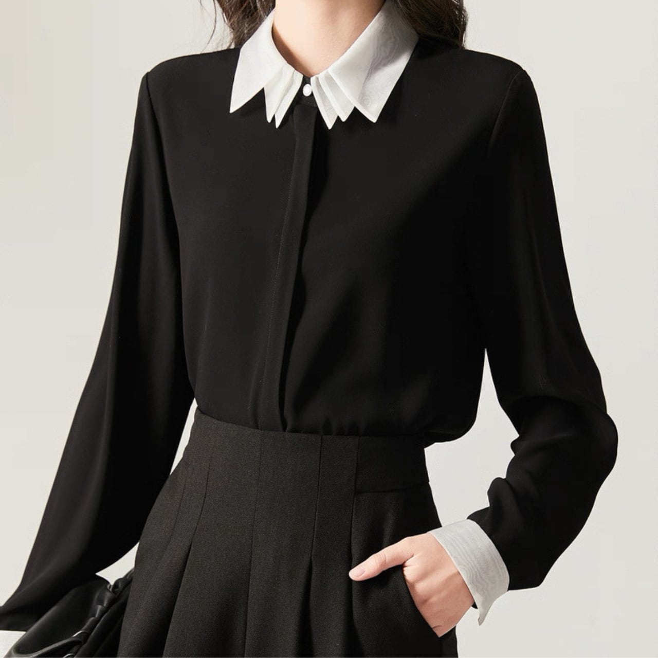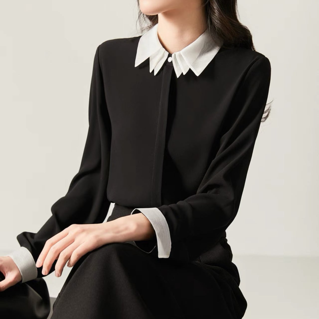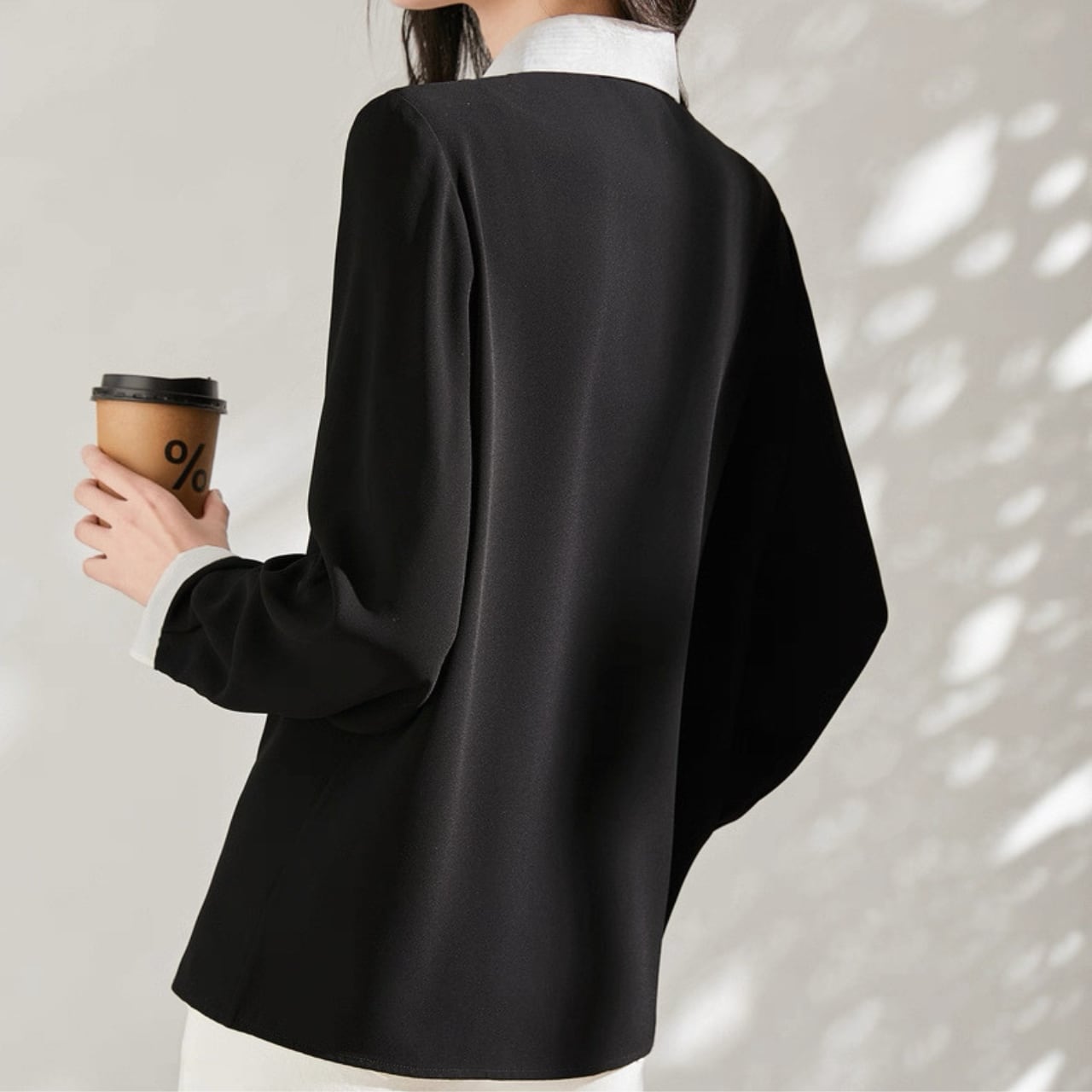 コントラストカラーの襟がアクセントになった長袖トップス。