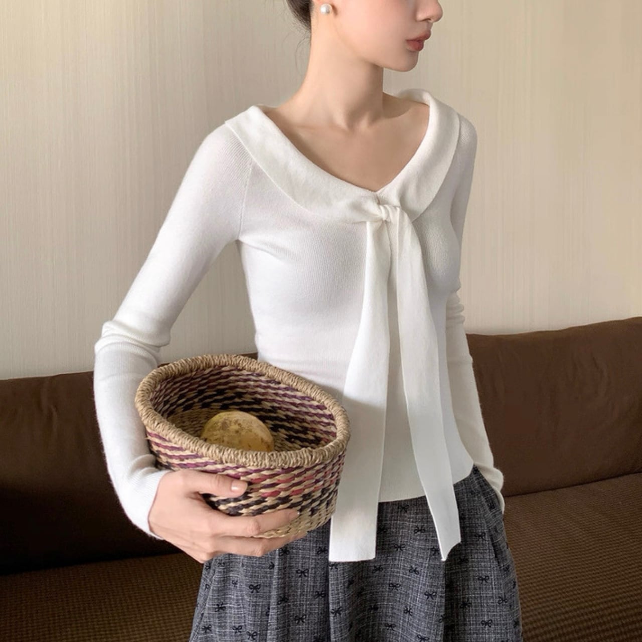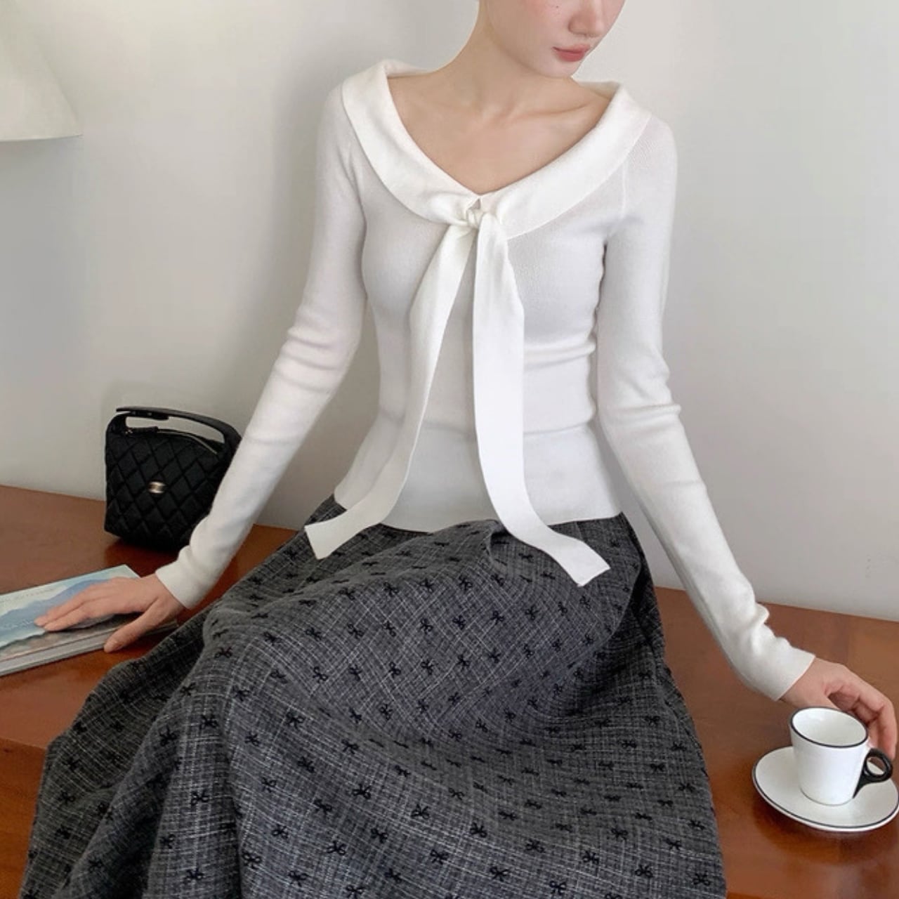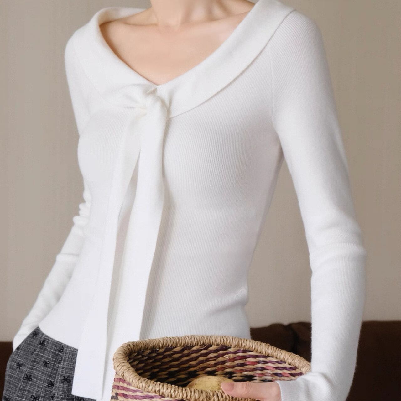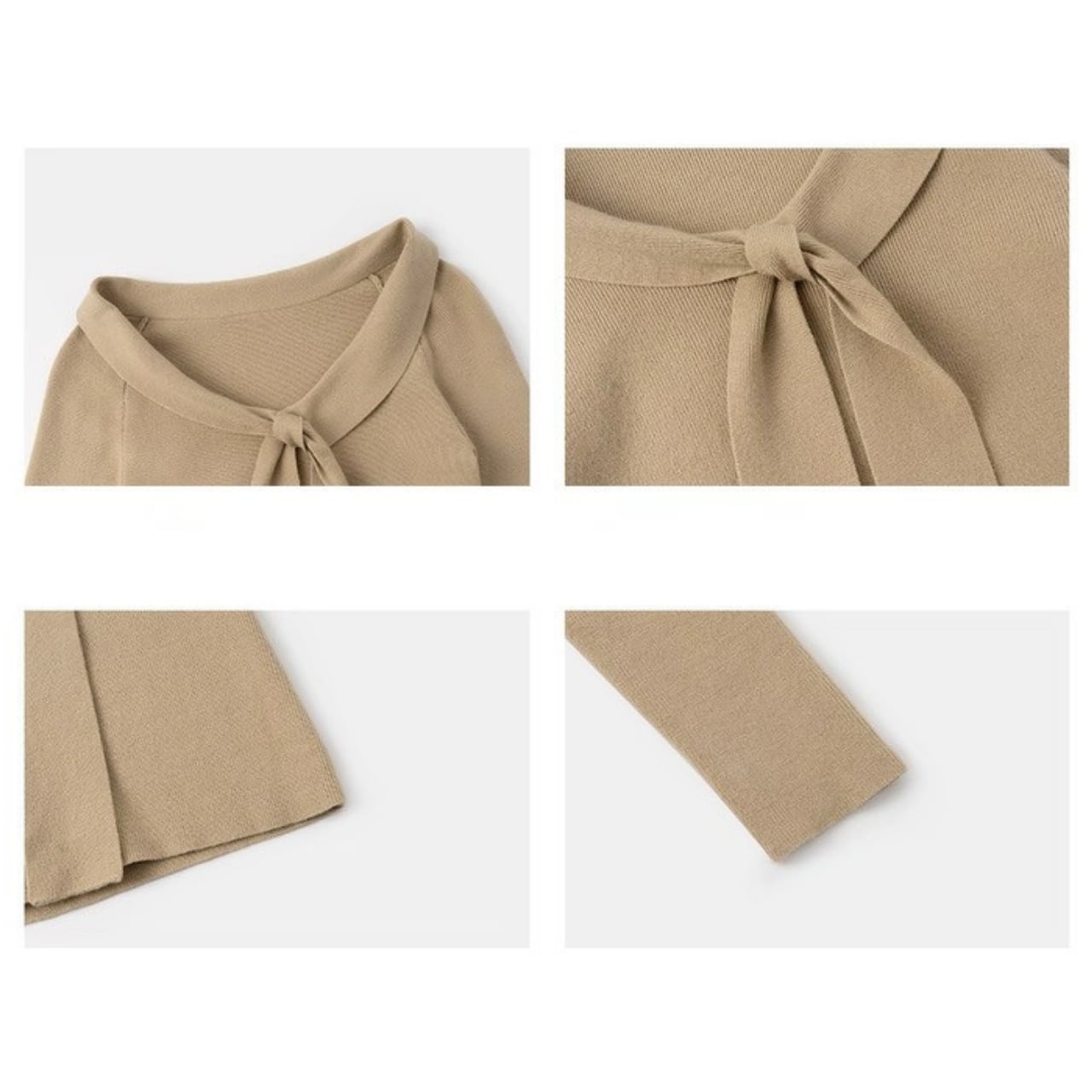 襟元にあしらわれたリボン風デザインが、顔まわりを華やかに演出するニットトップス。