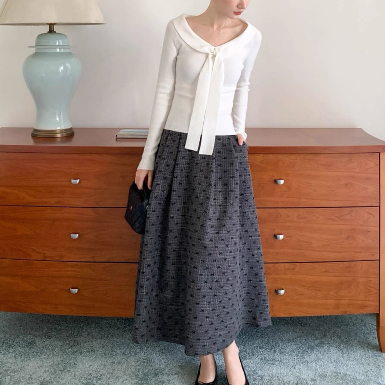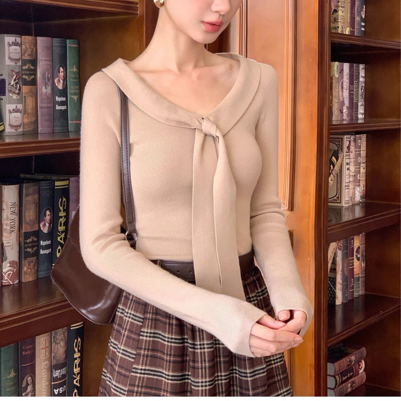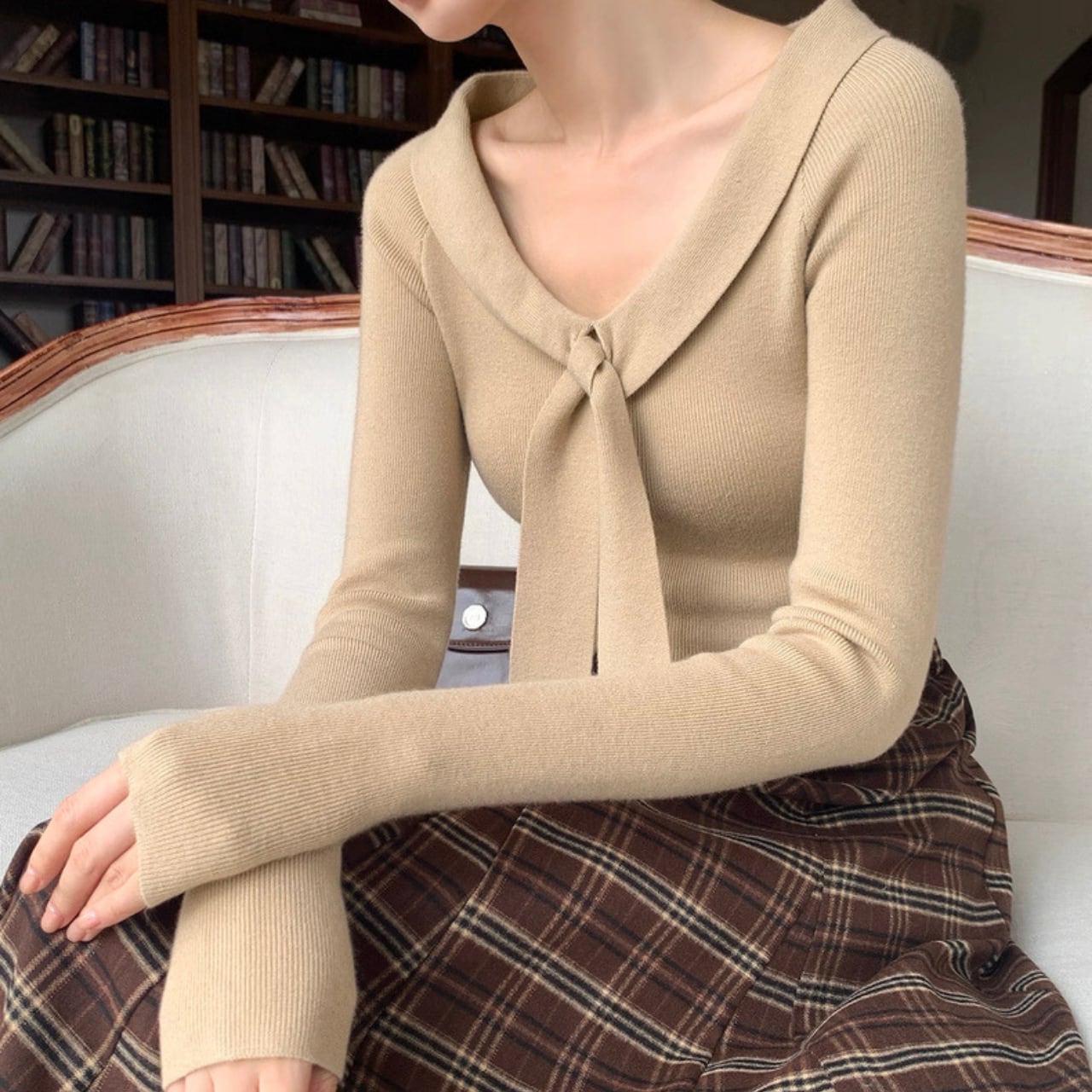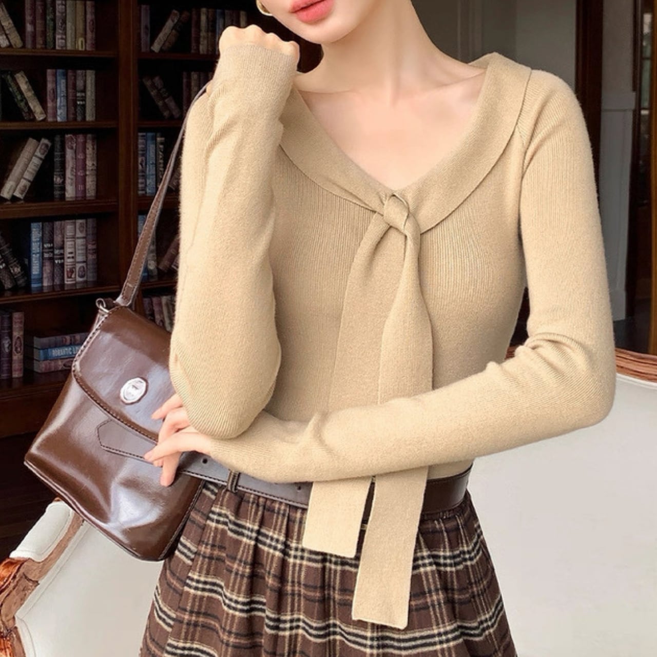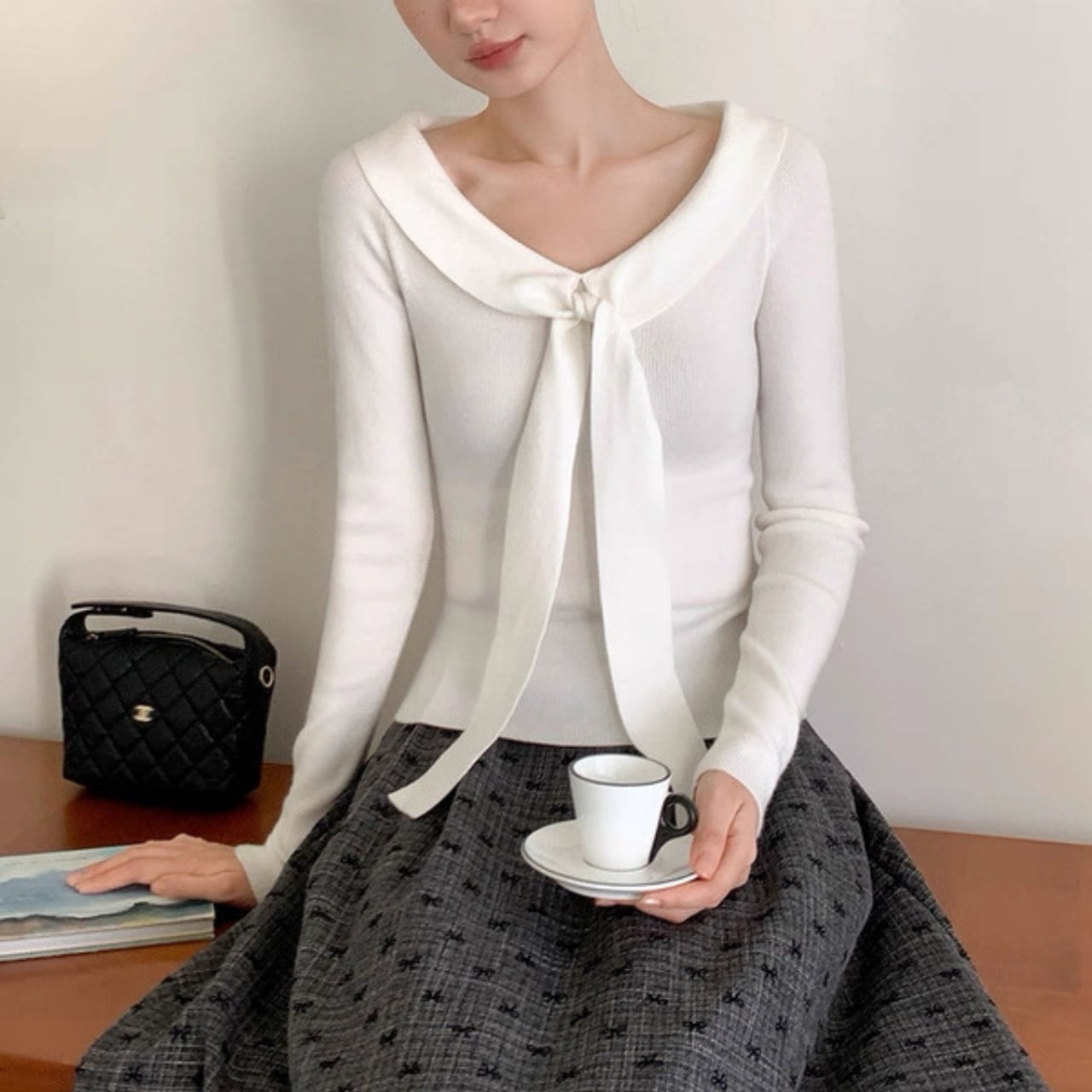 襟元にあしらわれたリボン風デザインが、顔まわりを華やかに演出するニットトップス。