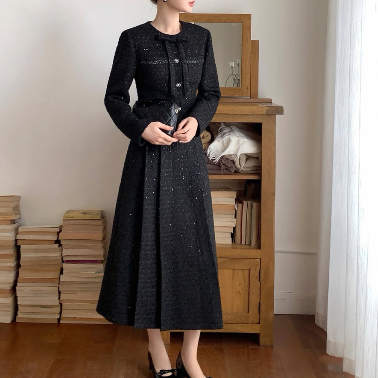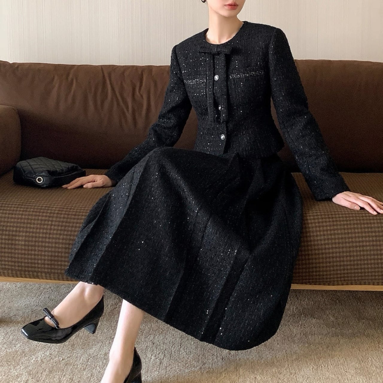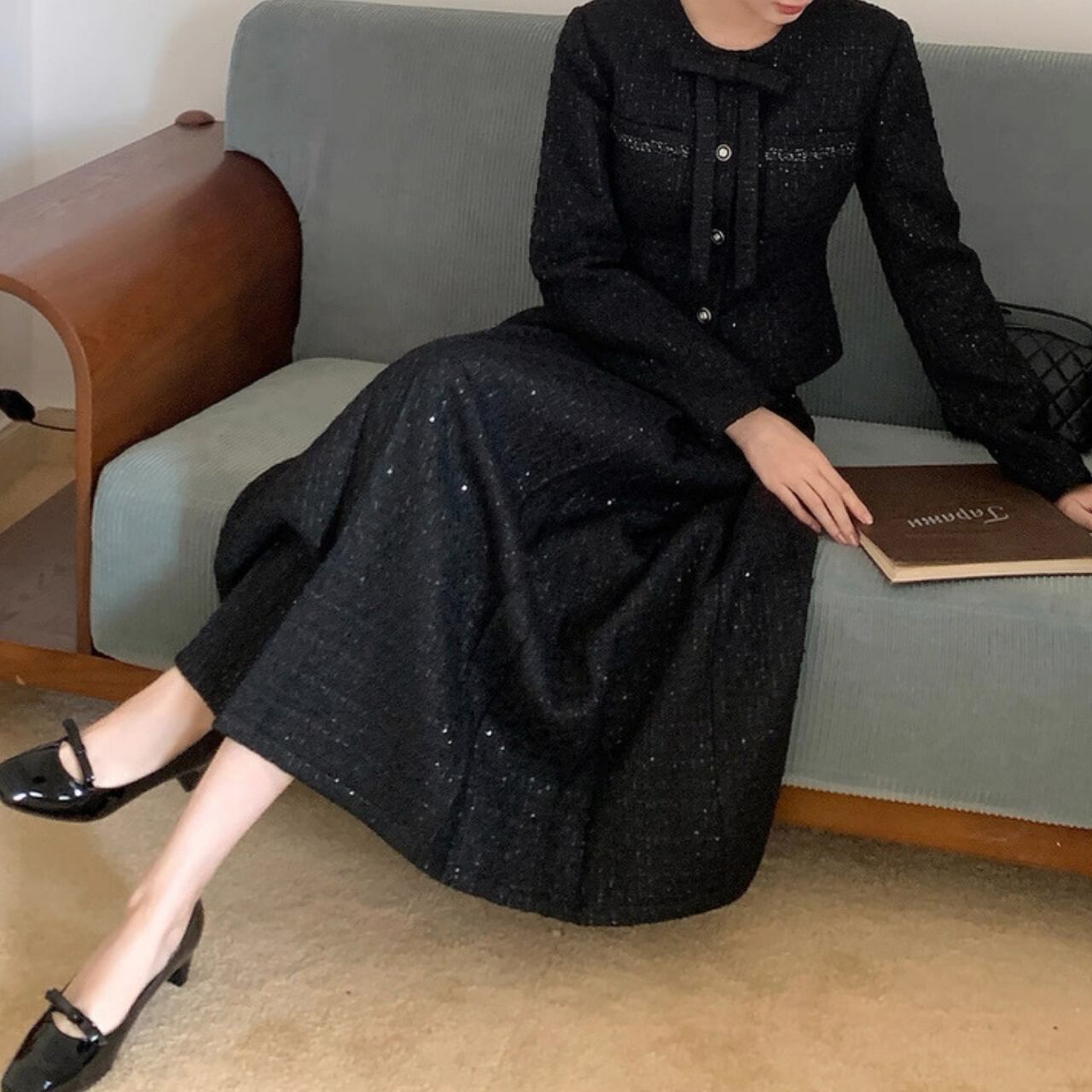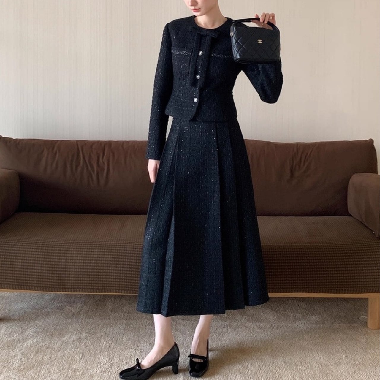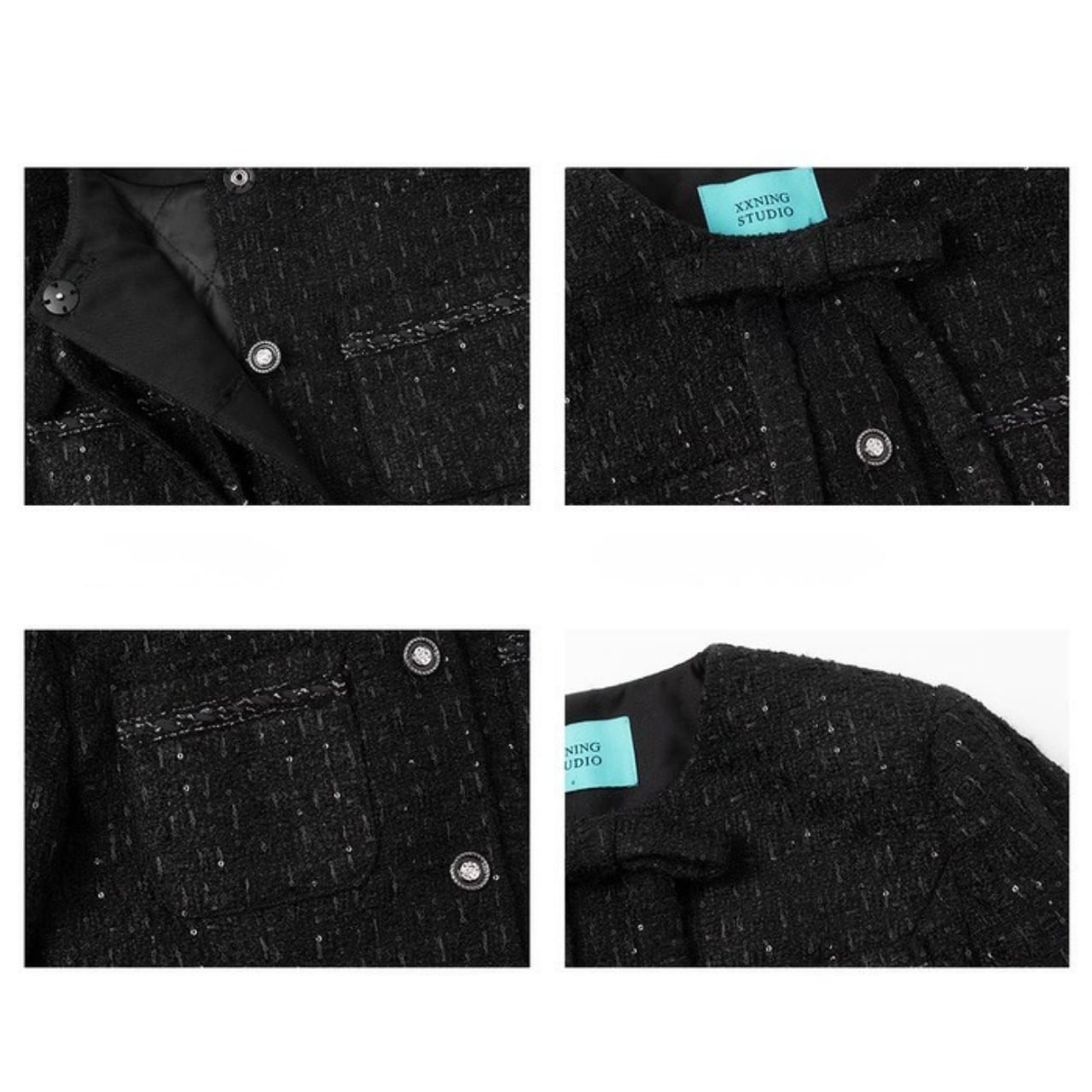 上品なきらめきを纏うラメ入りツイード調のジャケット。