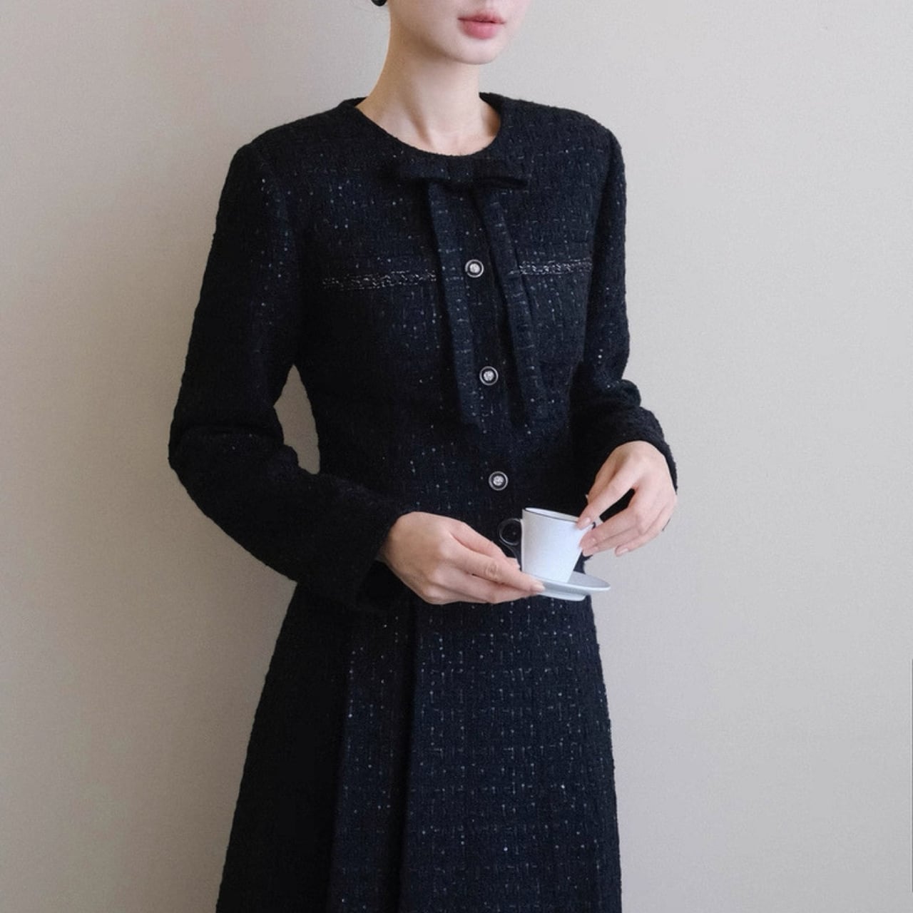 ノーカラーのすっきりとしたデザインで、シンプルながらも女性らしい気品を引き立てます。