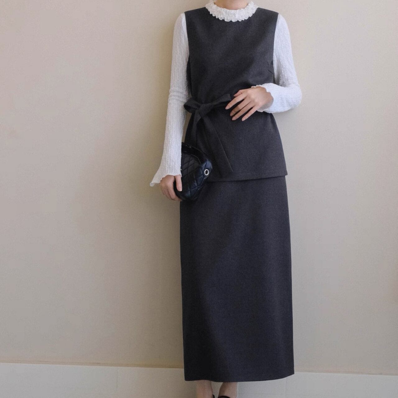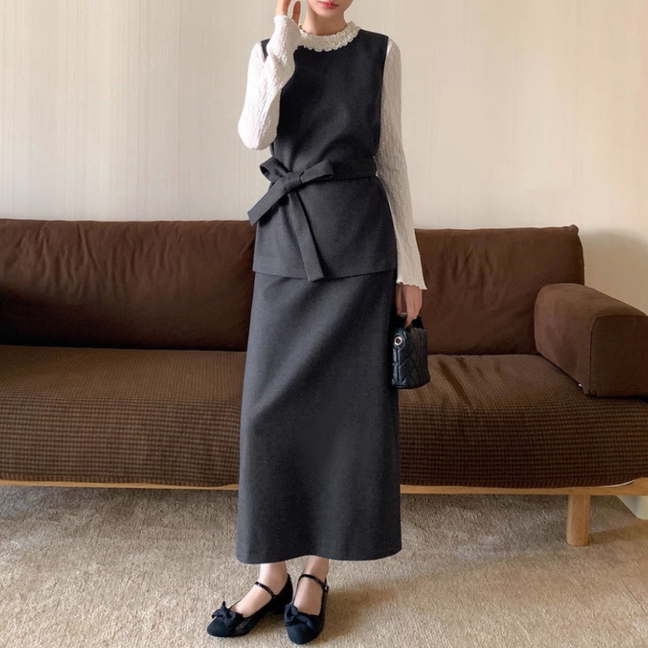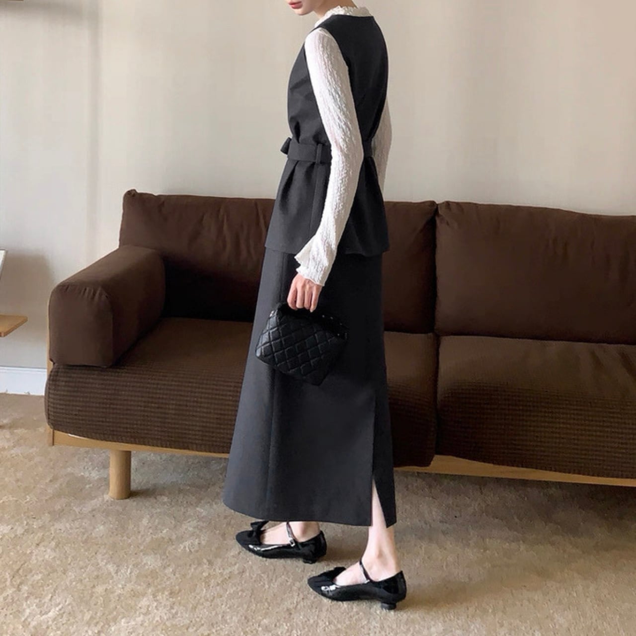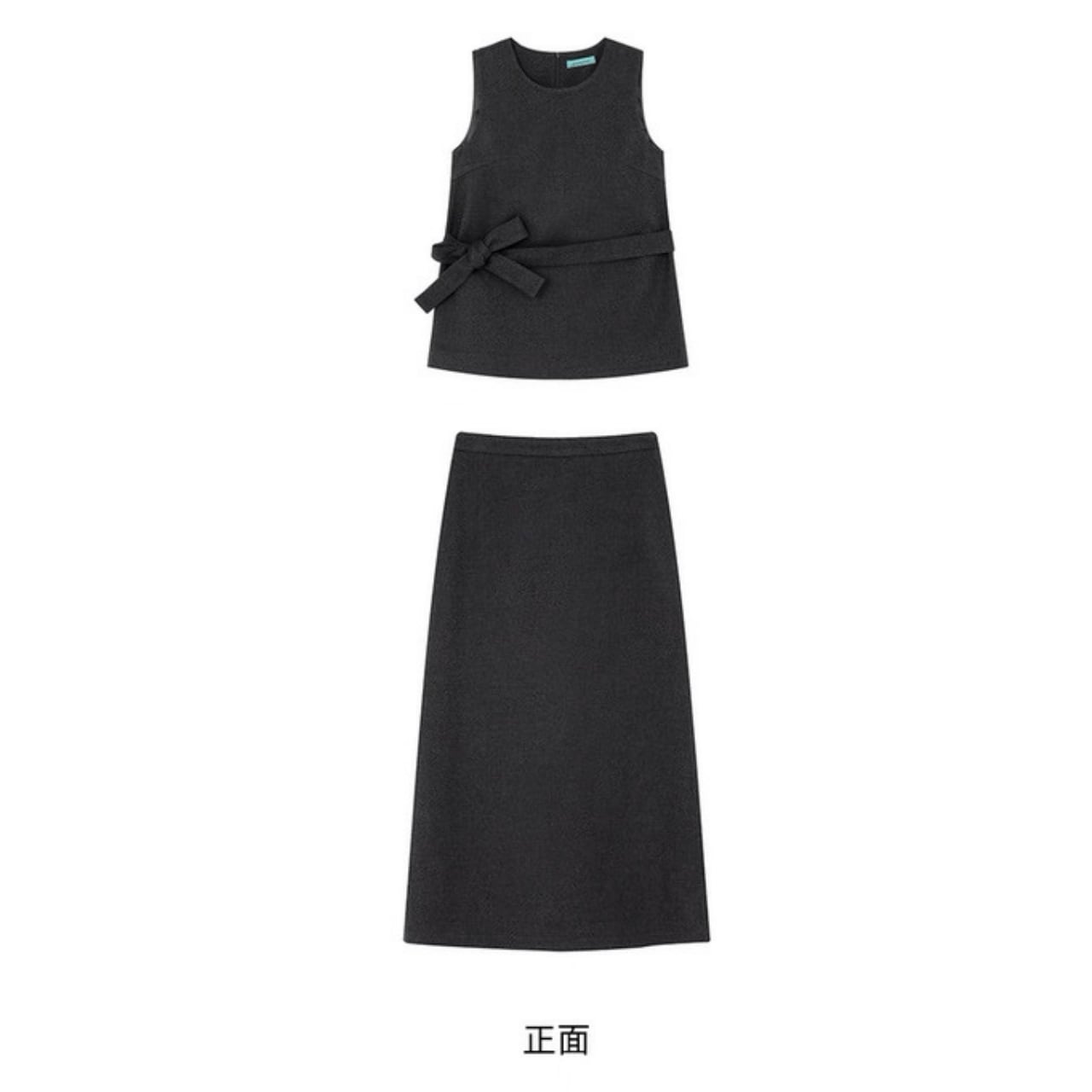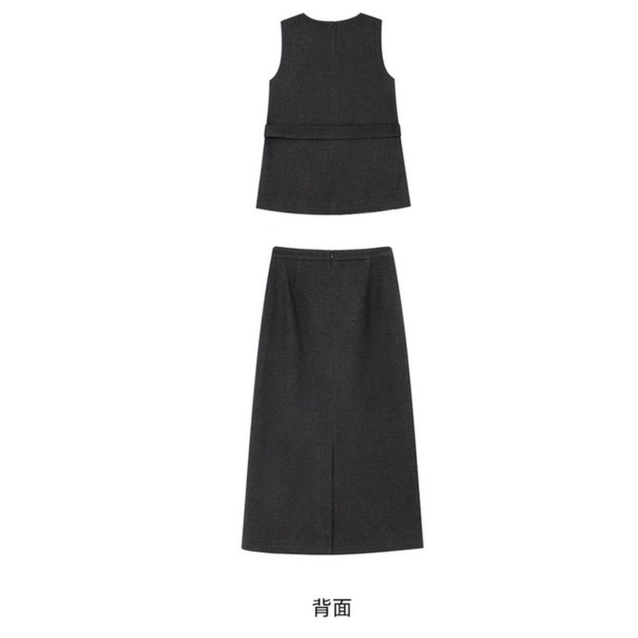 シンプルで洗練された印象を与えるベストとスカートのセットアップ。