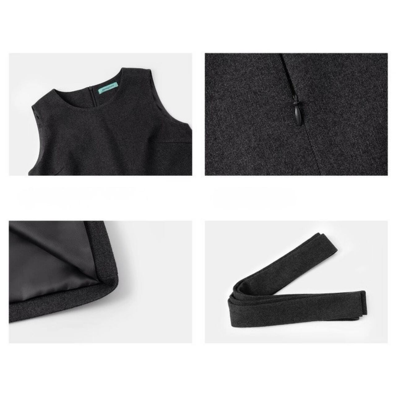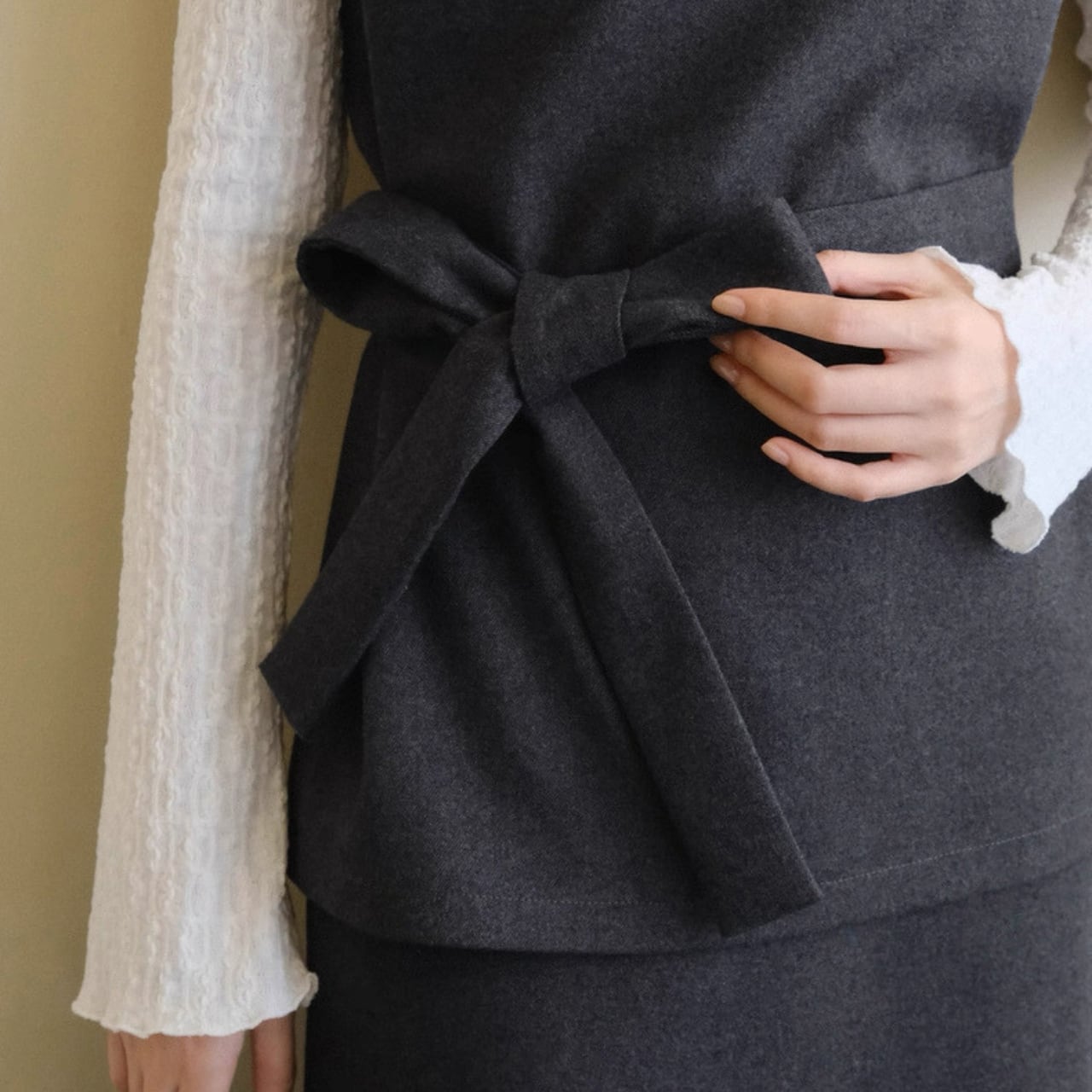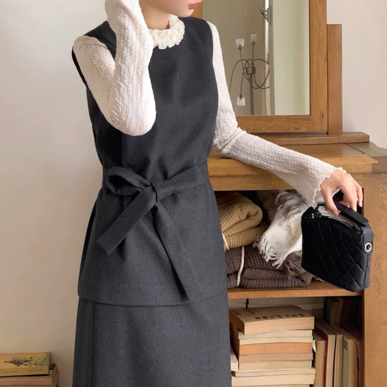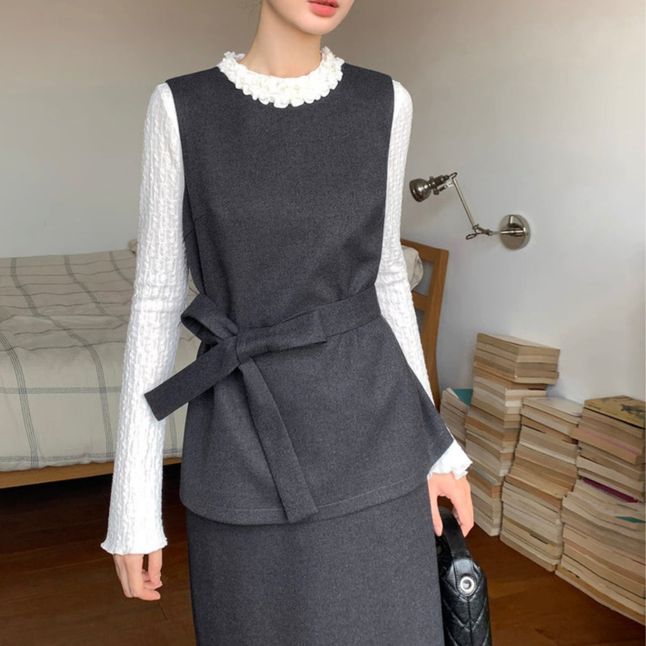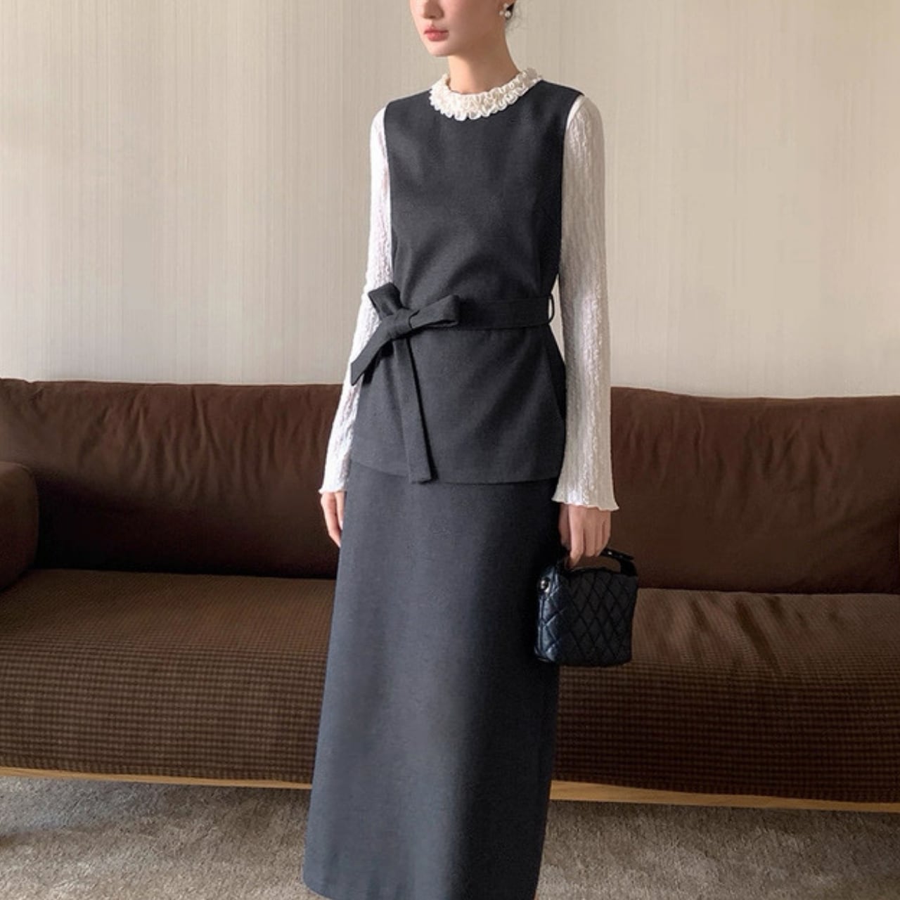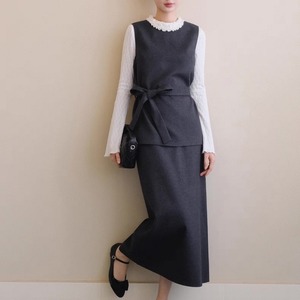 シンプルで洗練された印象を与えるベストとスカートのセットアップ。
