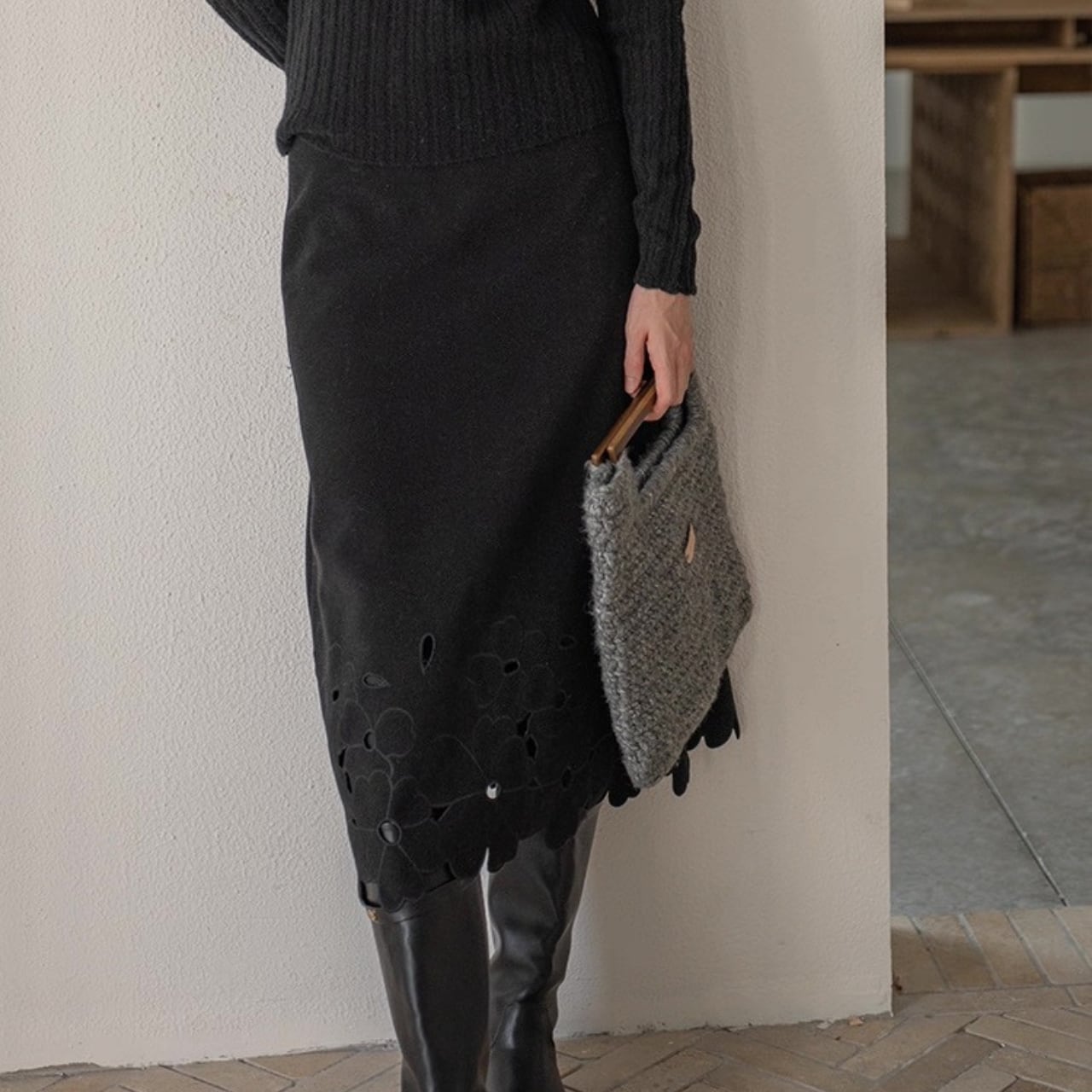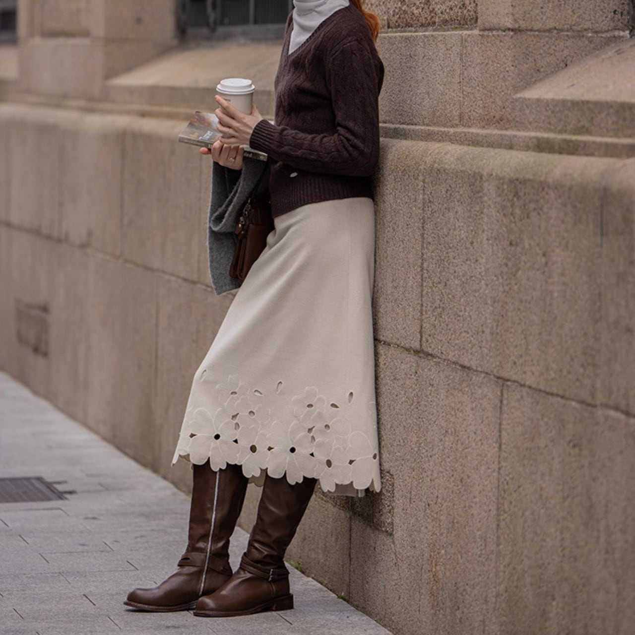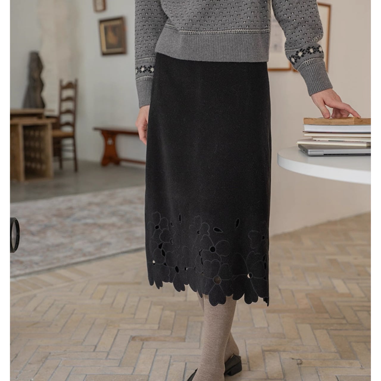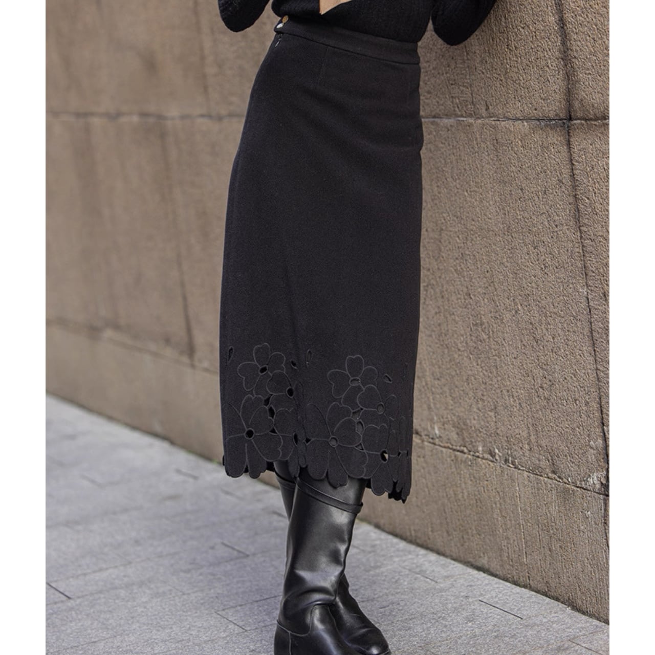 繊細なレーザーカットのフラワーデザインが裾を華やかに彩る、上品なミディ丈スカート。