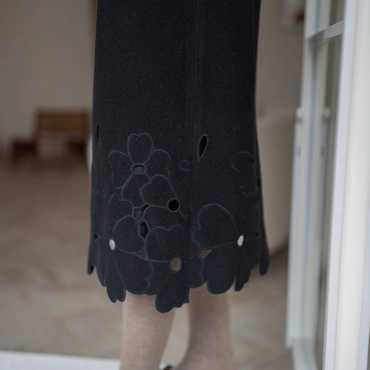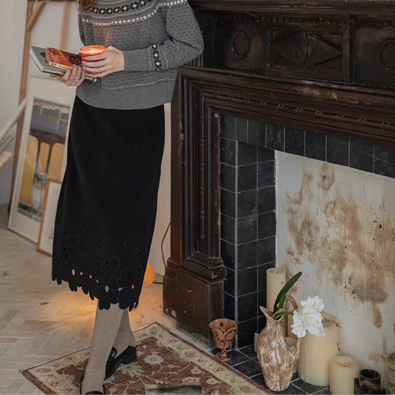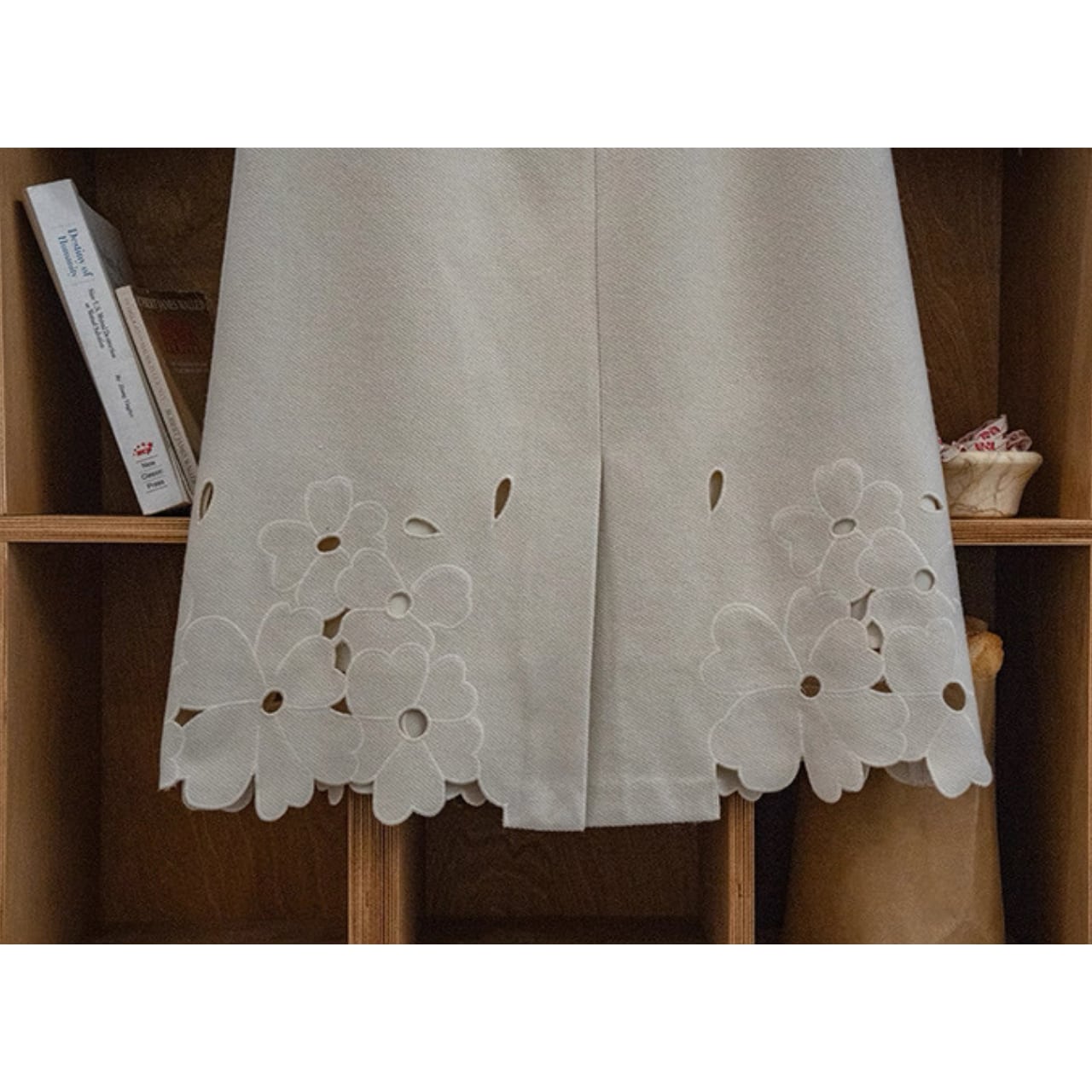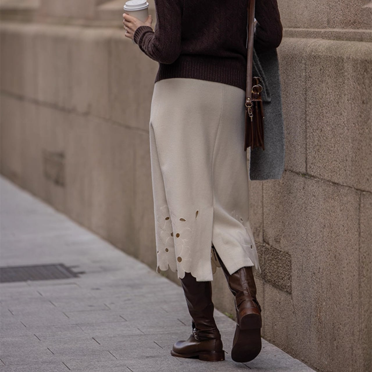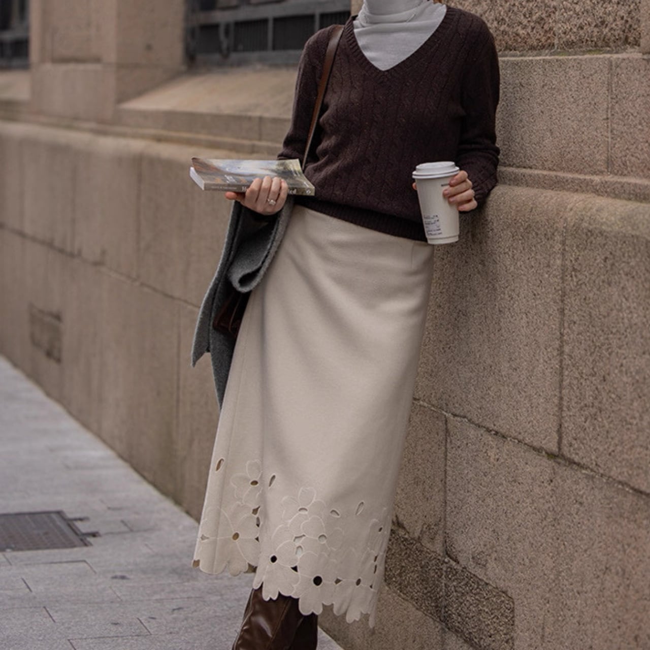 繊細なレーザーカットのフラワーデザインが裾を華やかに彩る、上品なミディ丈スカート。