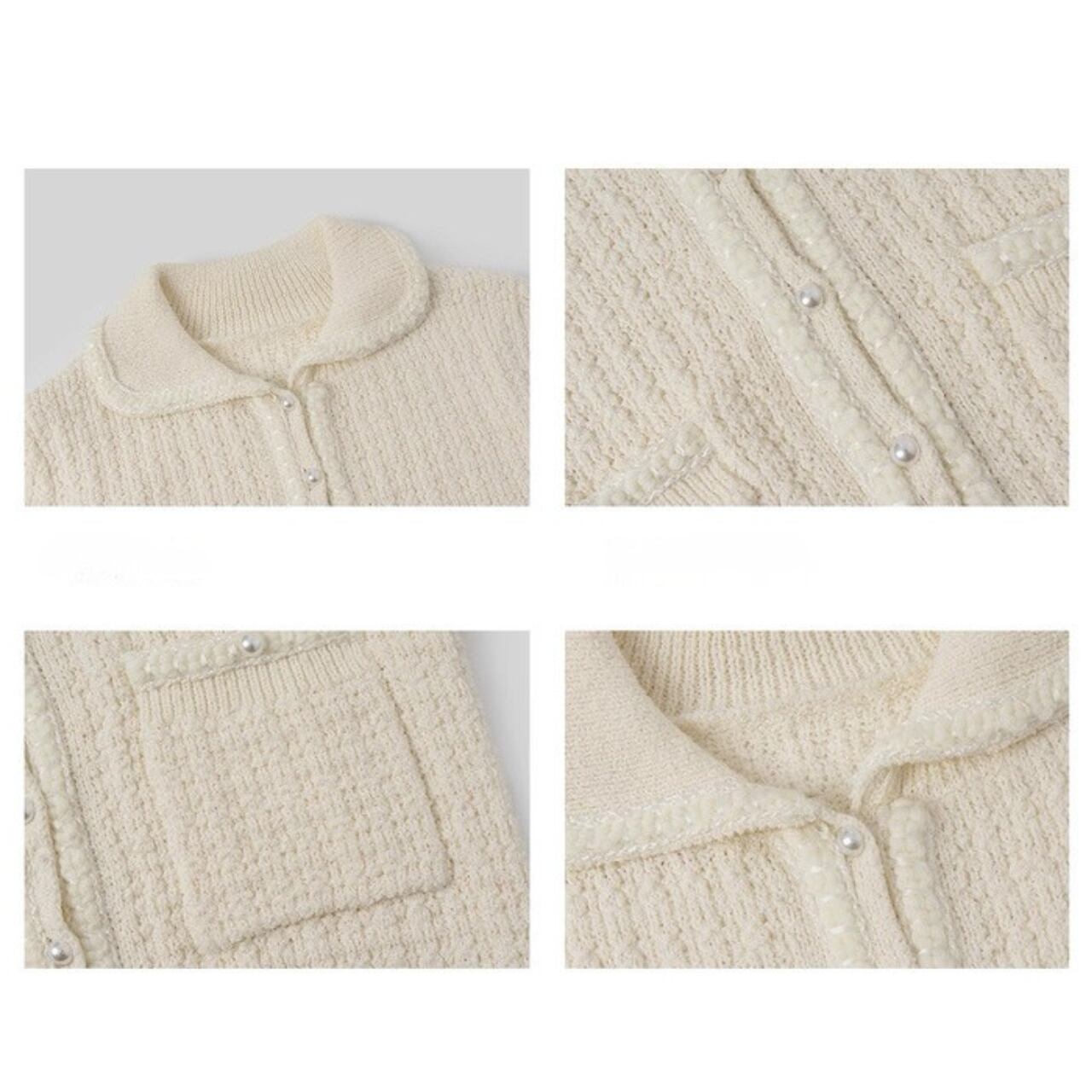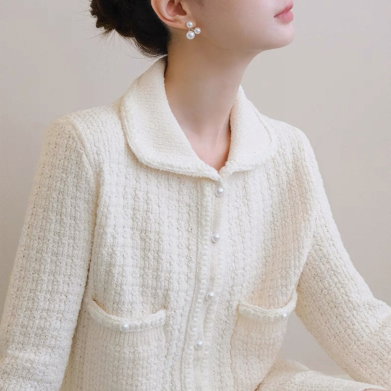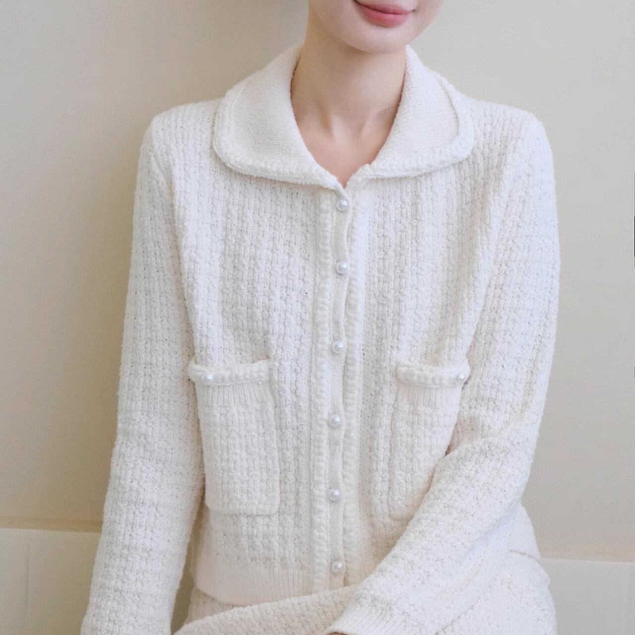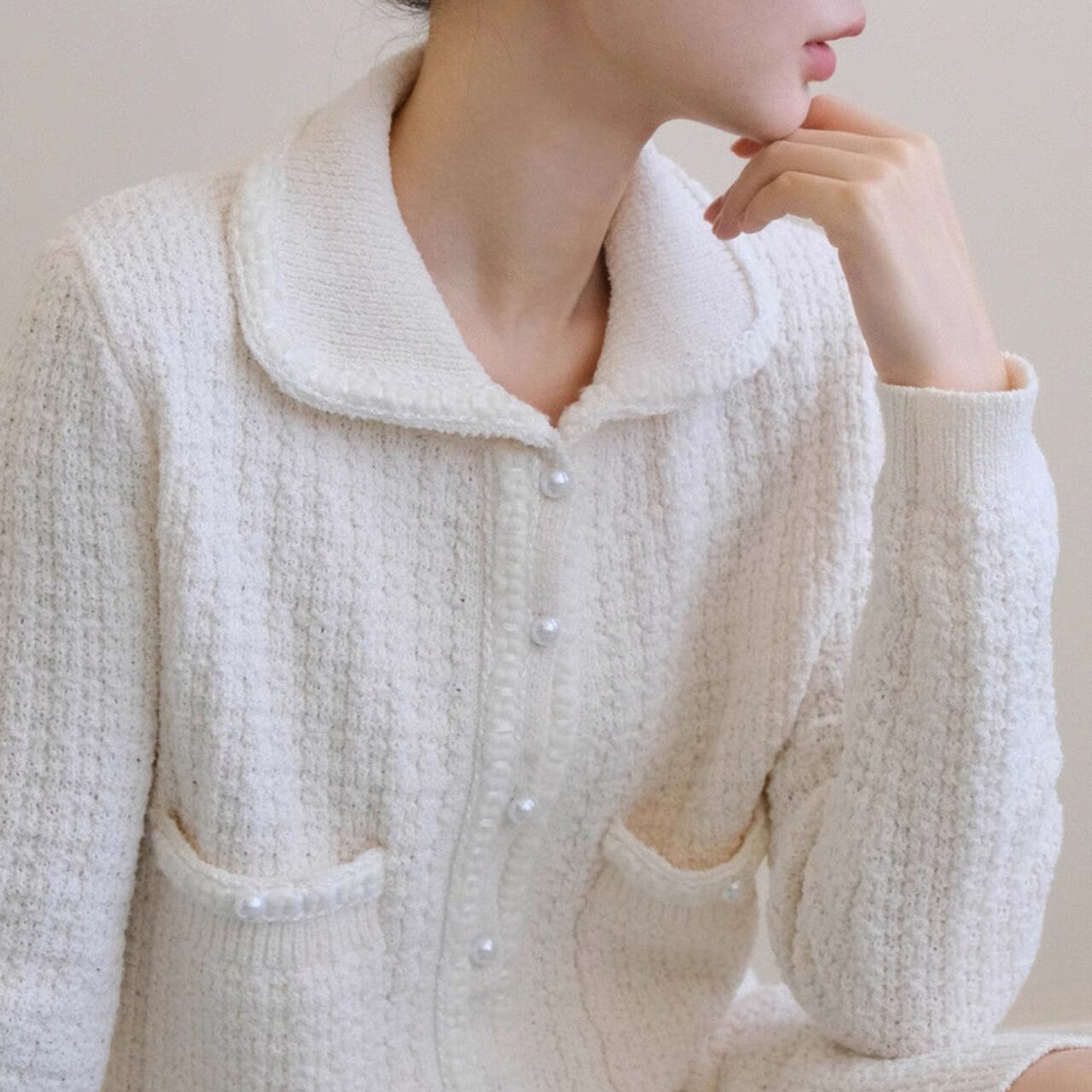 パールボタンと立体感のある編地がエレガントさを引き立て、