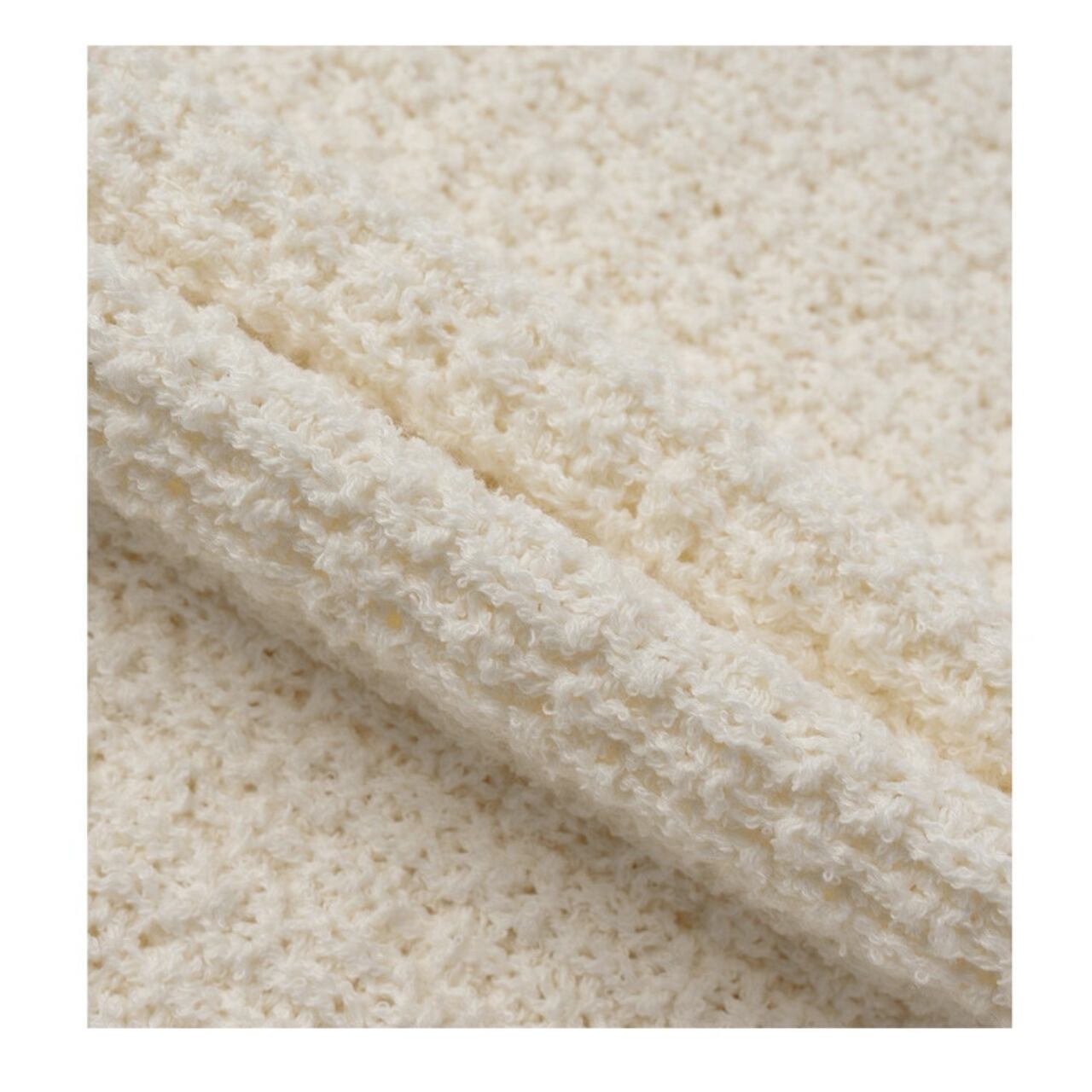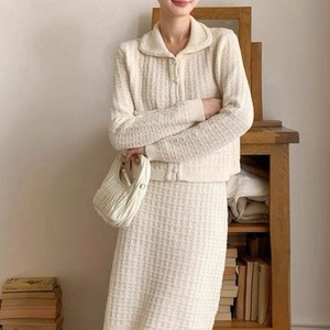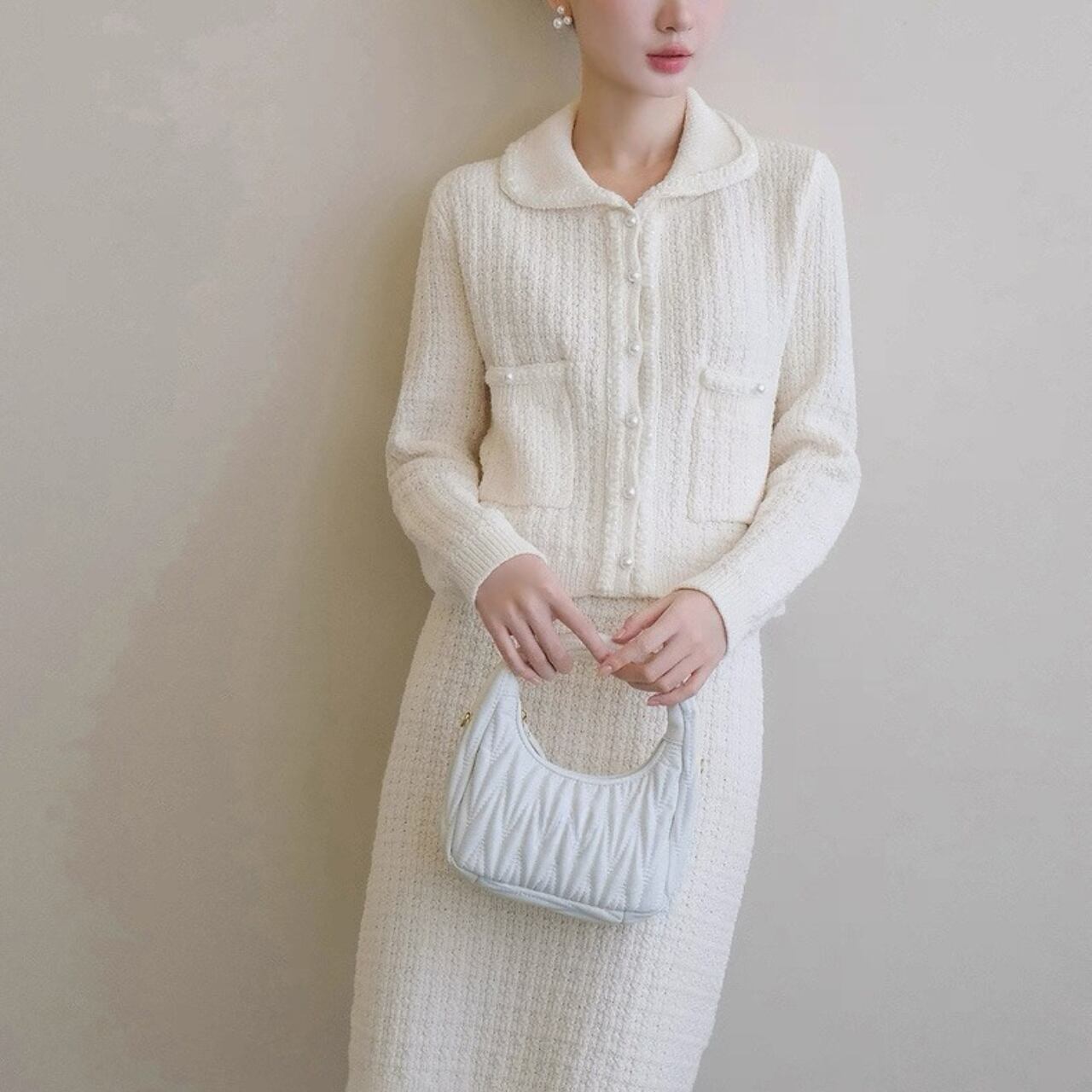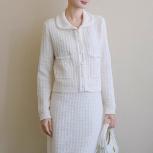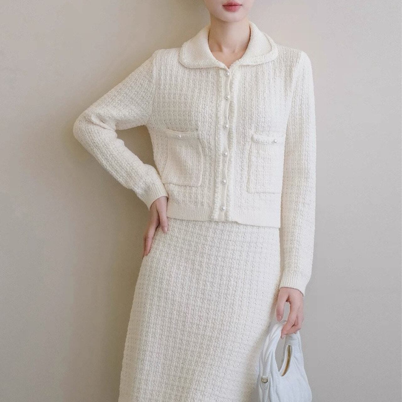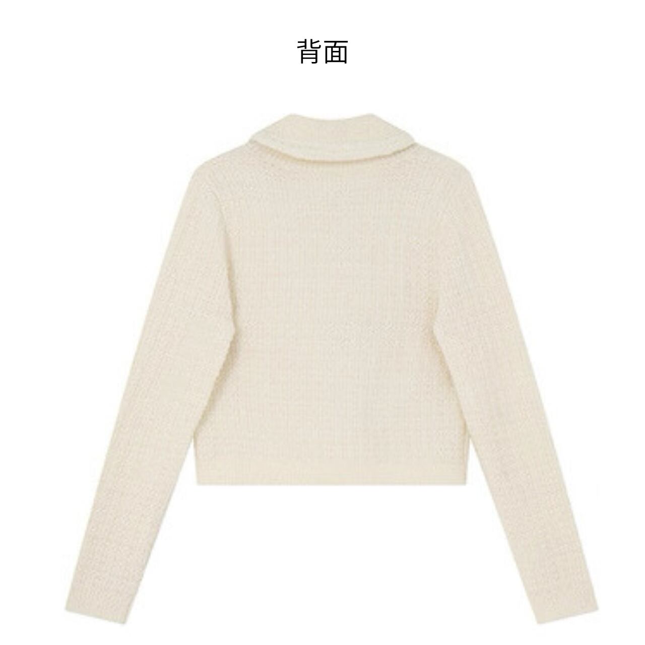 パールボタンと立体感のある編地がエレガントさを引き立て、