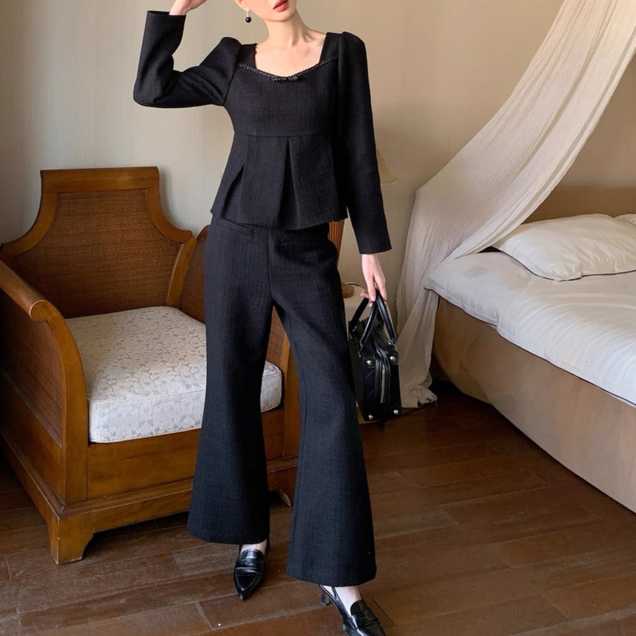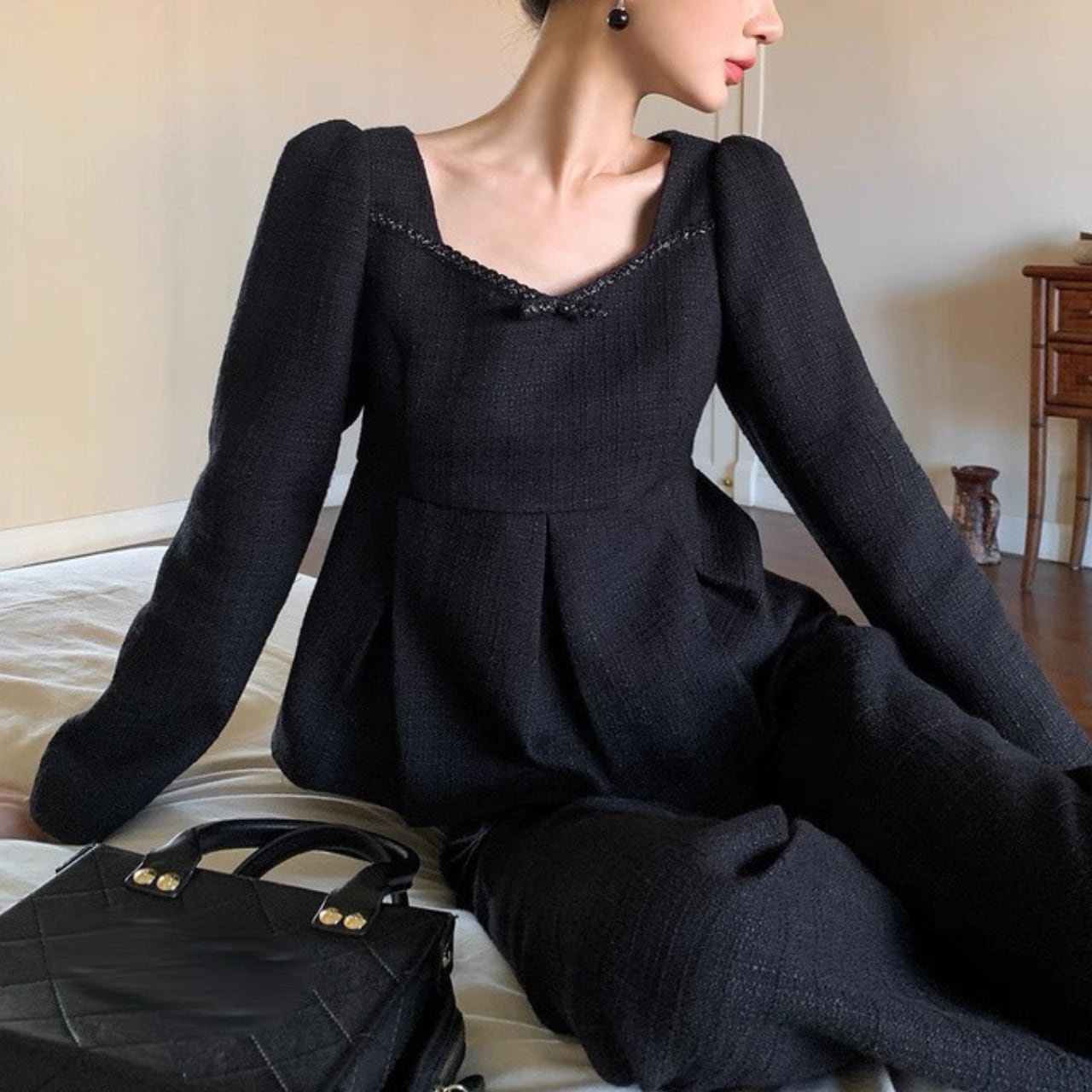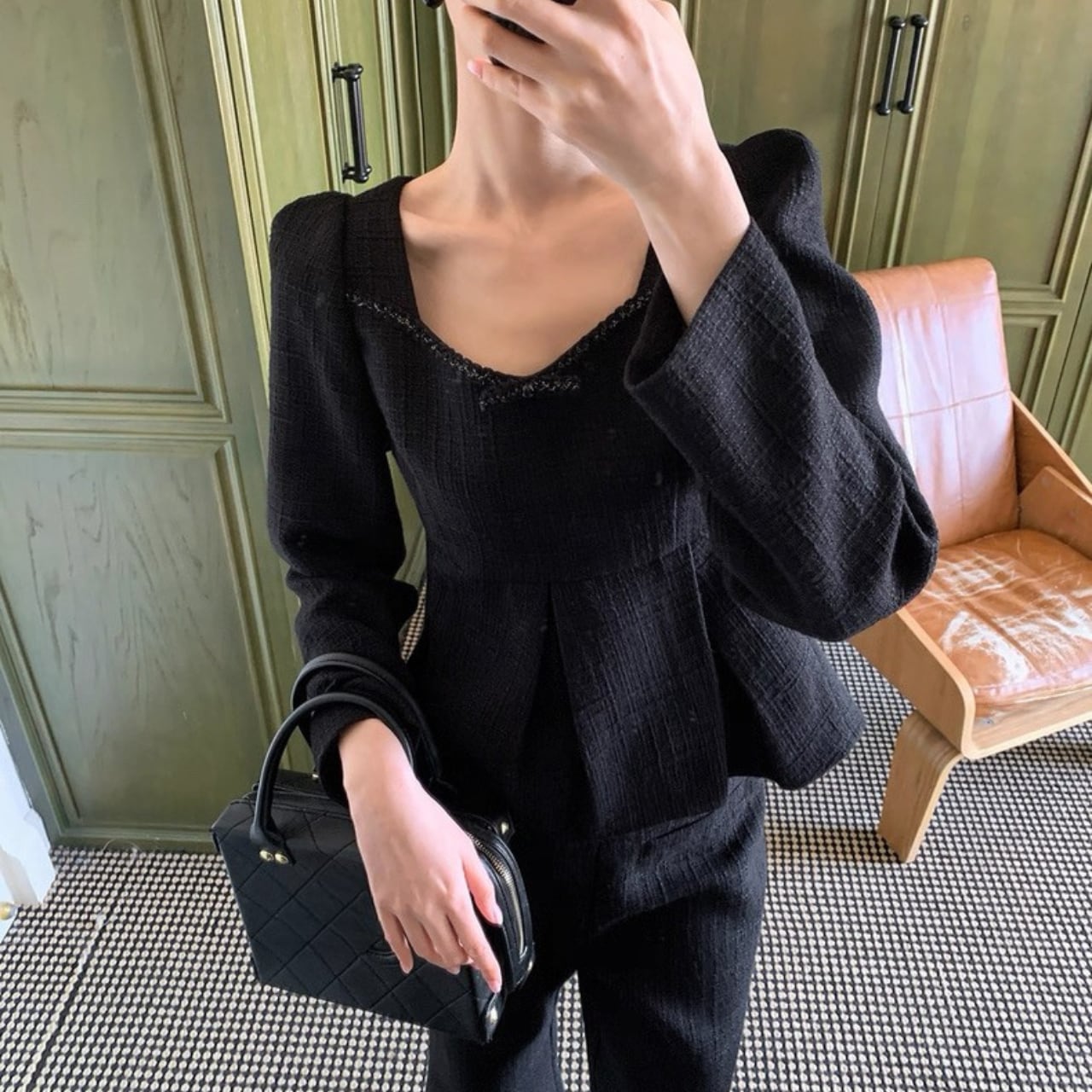 クラシカルな雰囲気を纏うスクエアネックのツイードトップス。