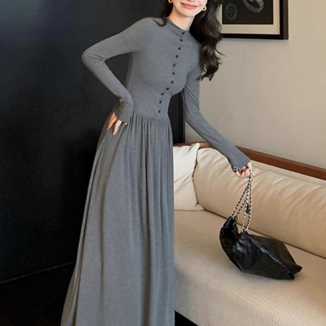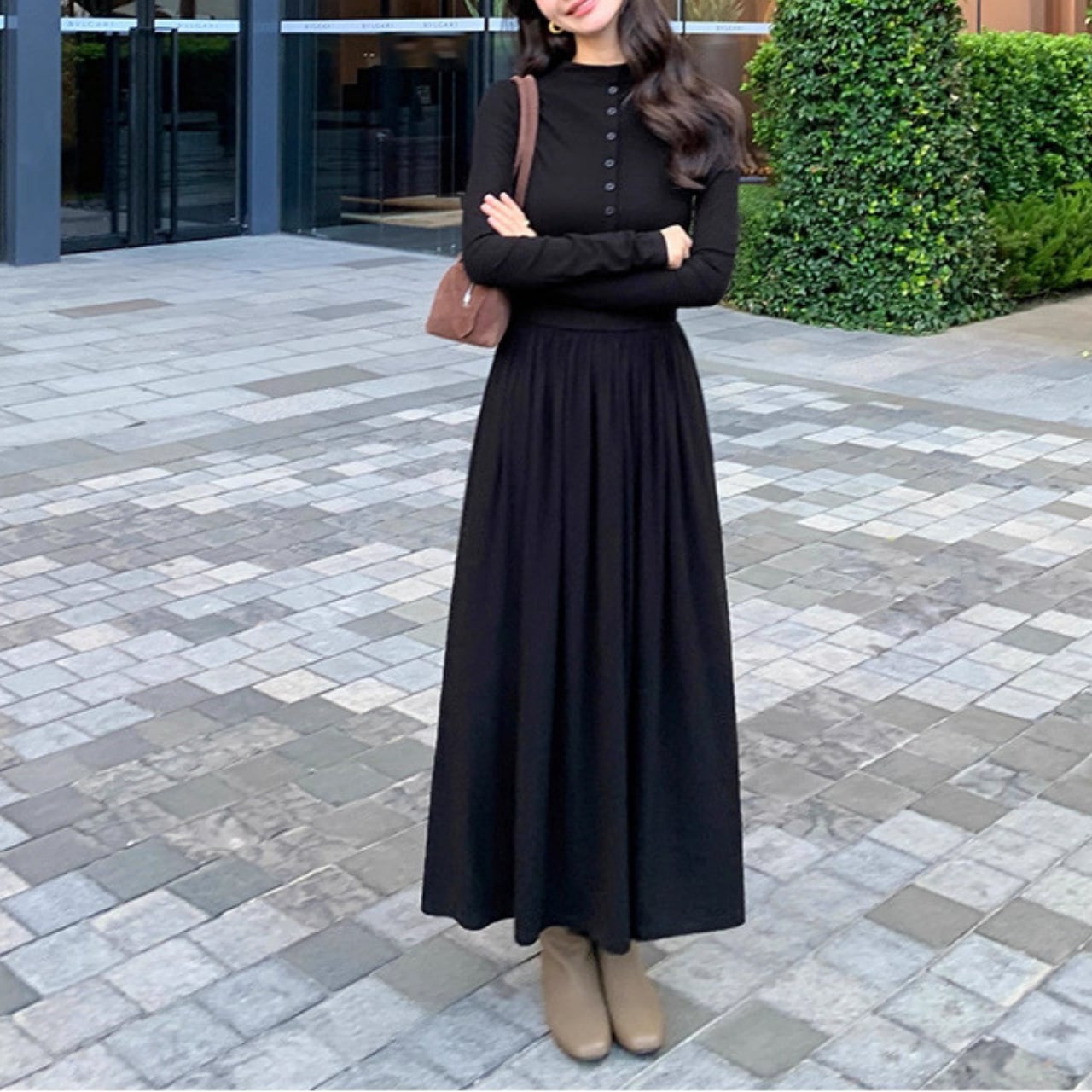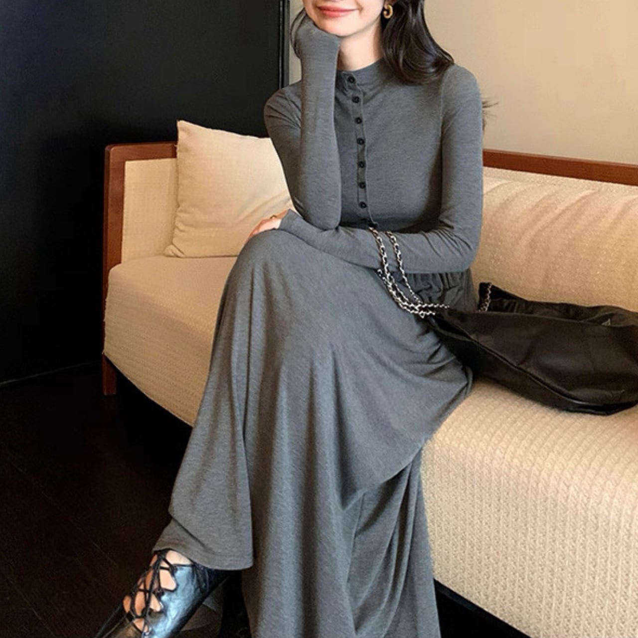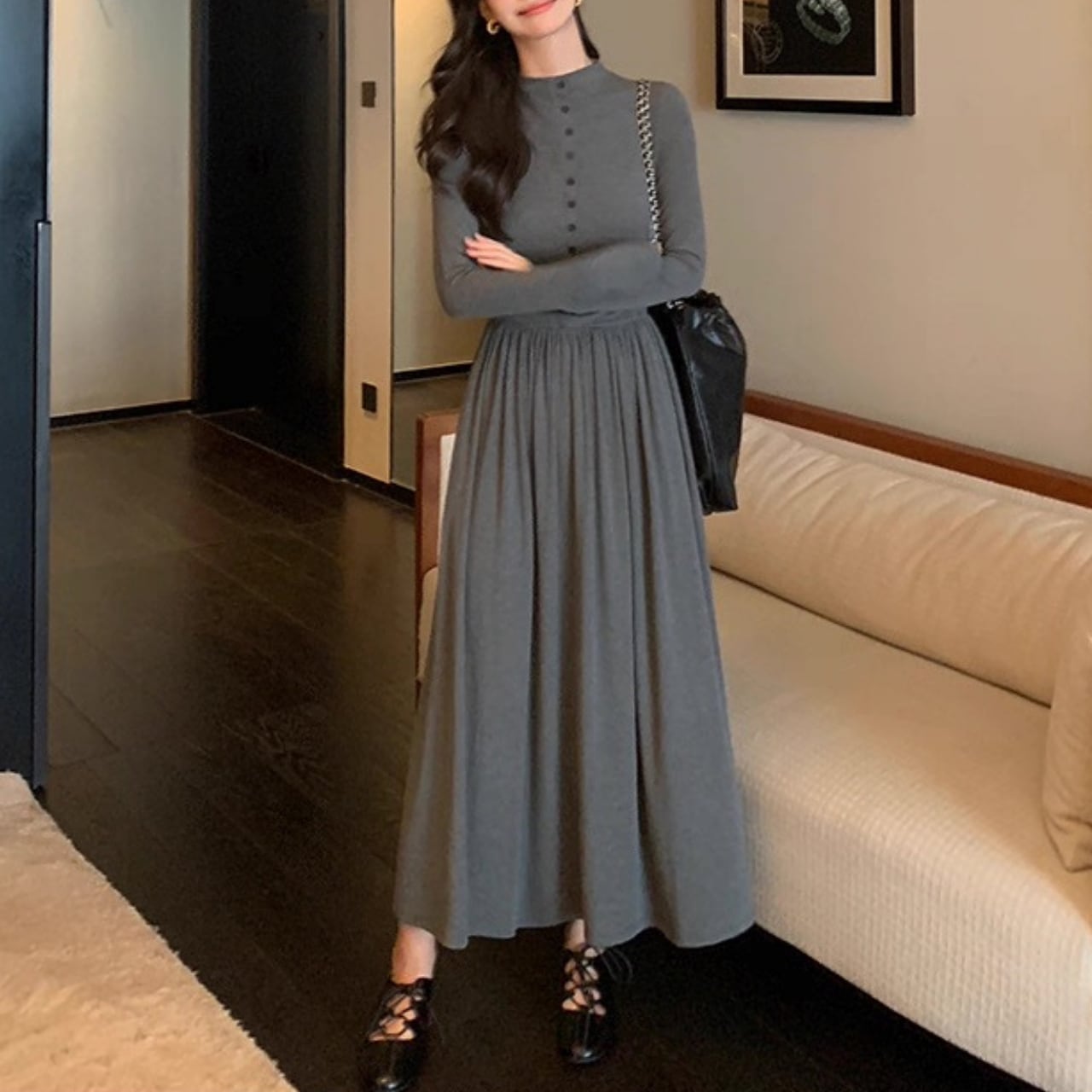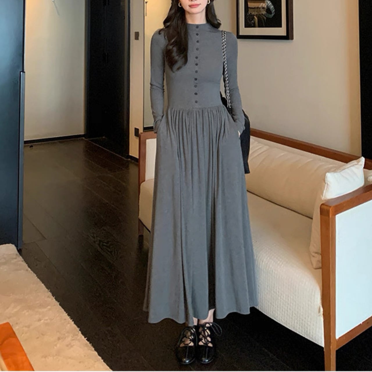 落ち感のあるロングフレアで大人の女性らしさが引き立つ万能ワンピース。