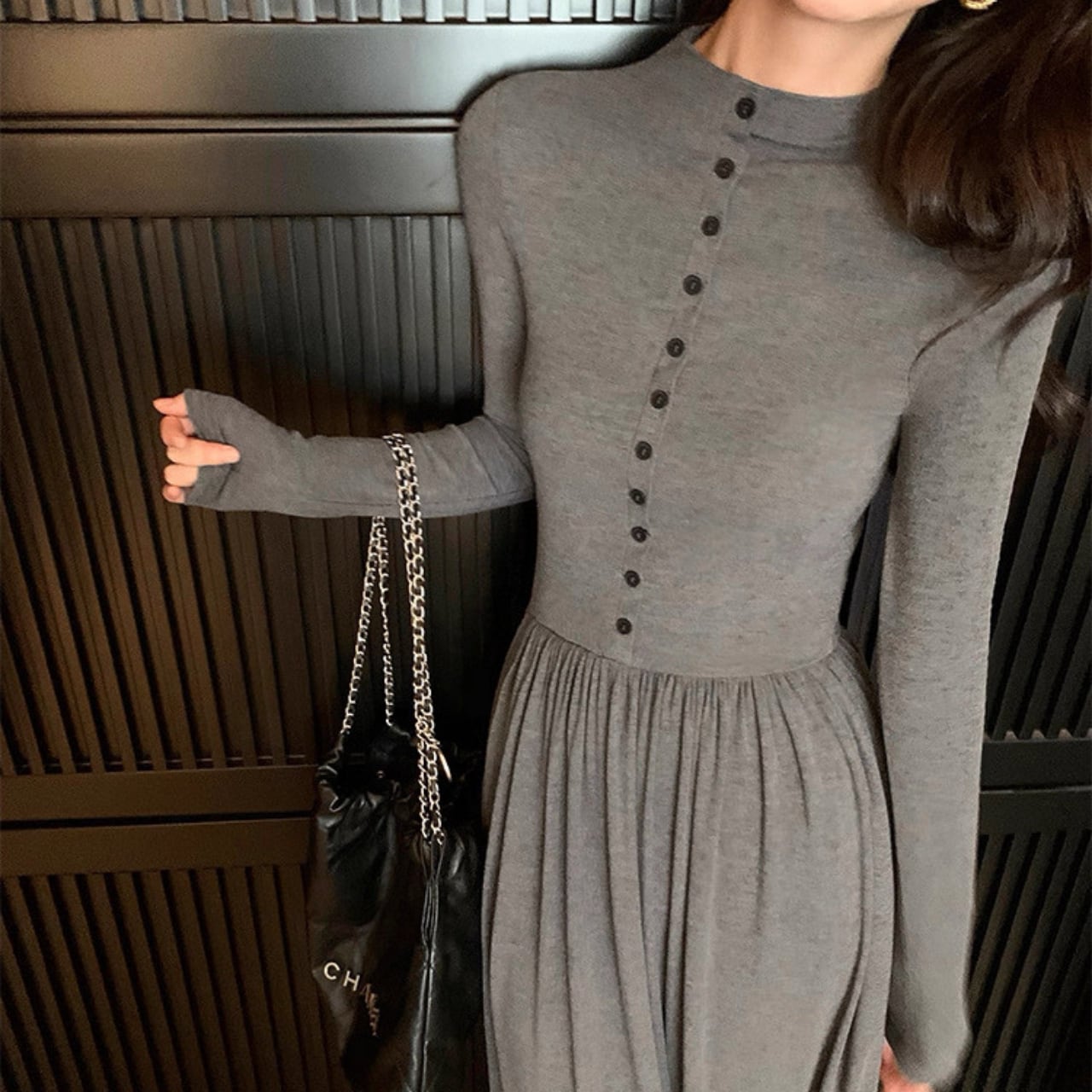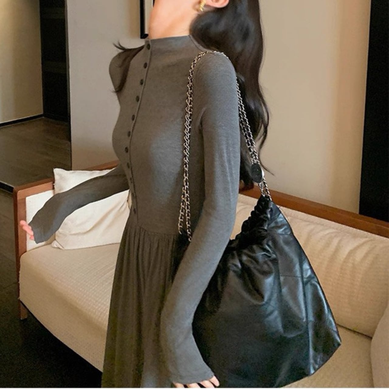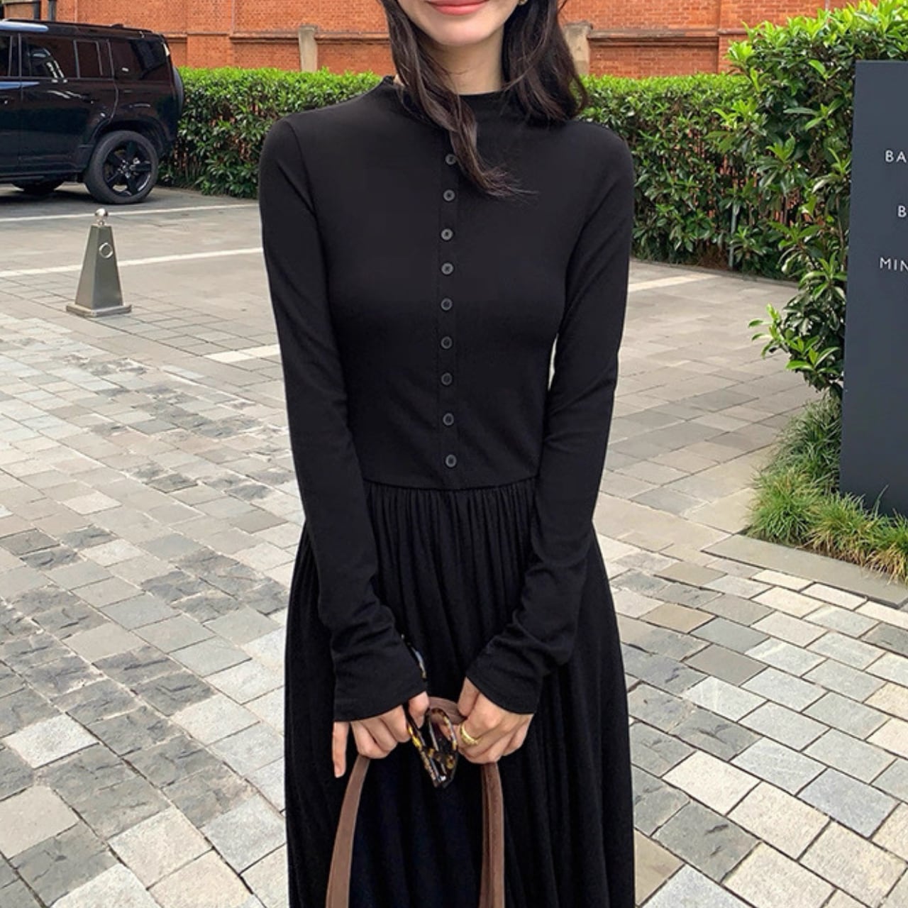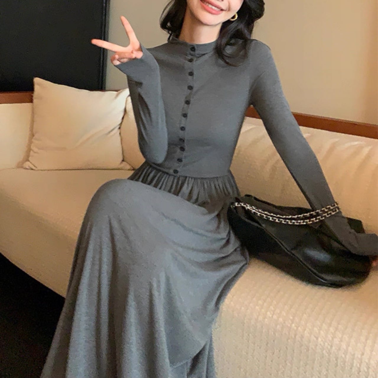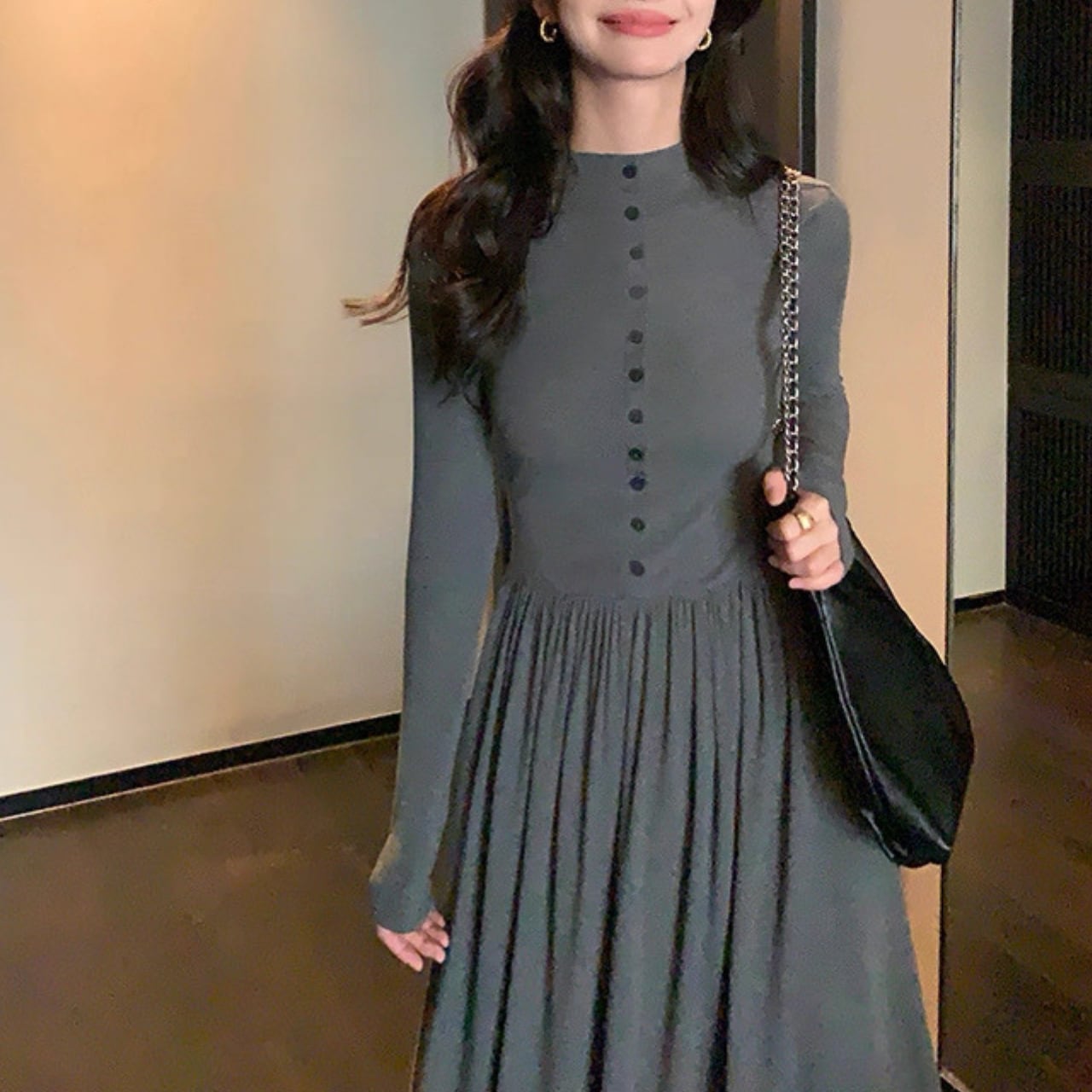 上品なフロントボタンとフィットしたウエストが、すっきりとしたシルエットを演出。