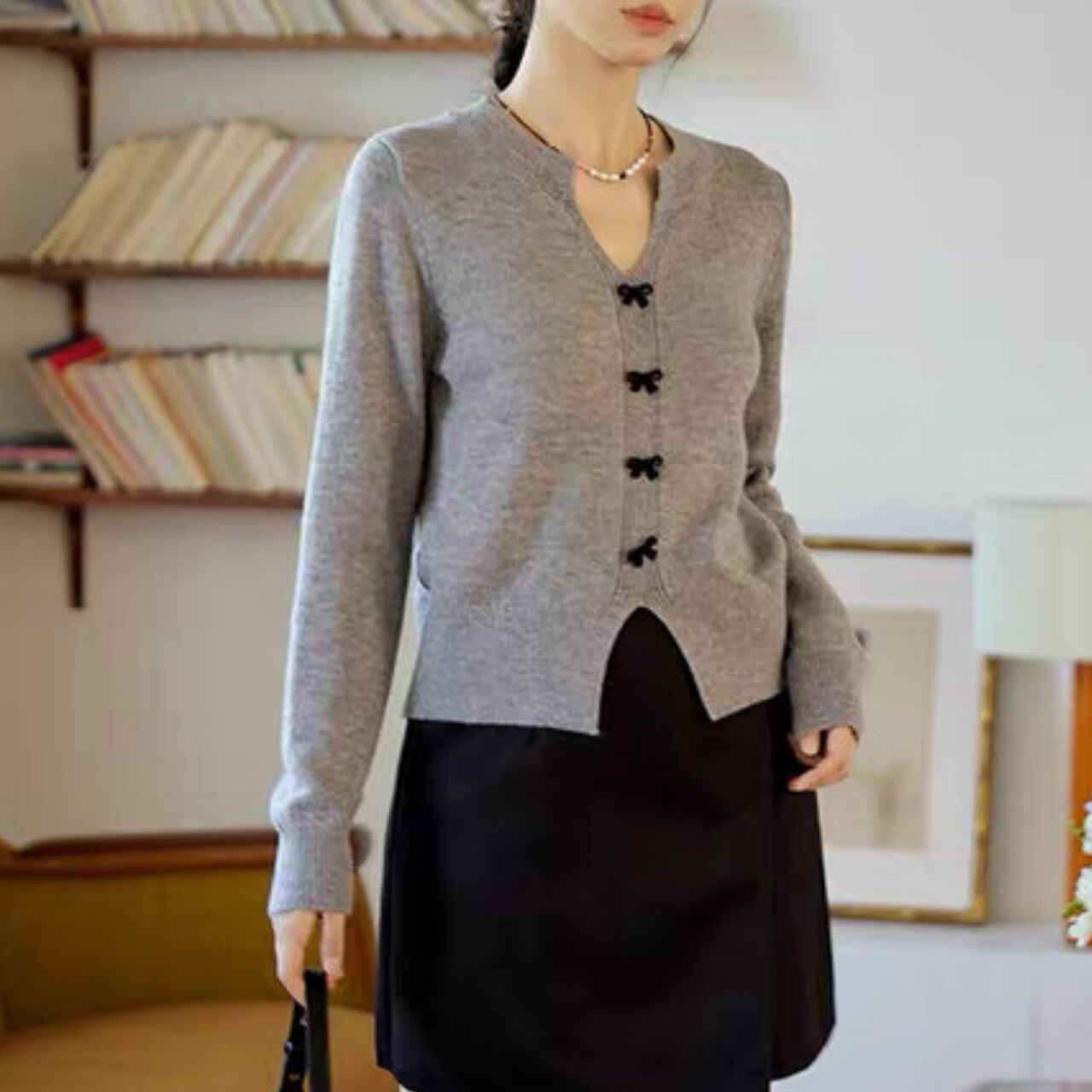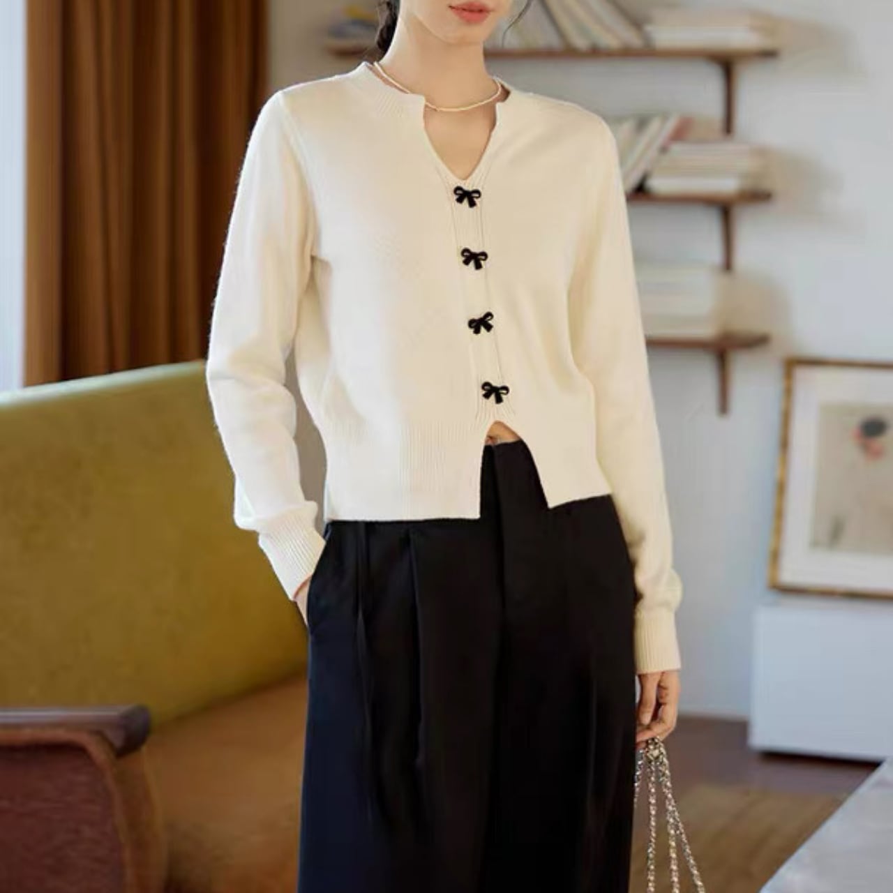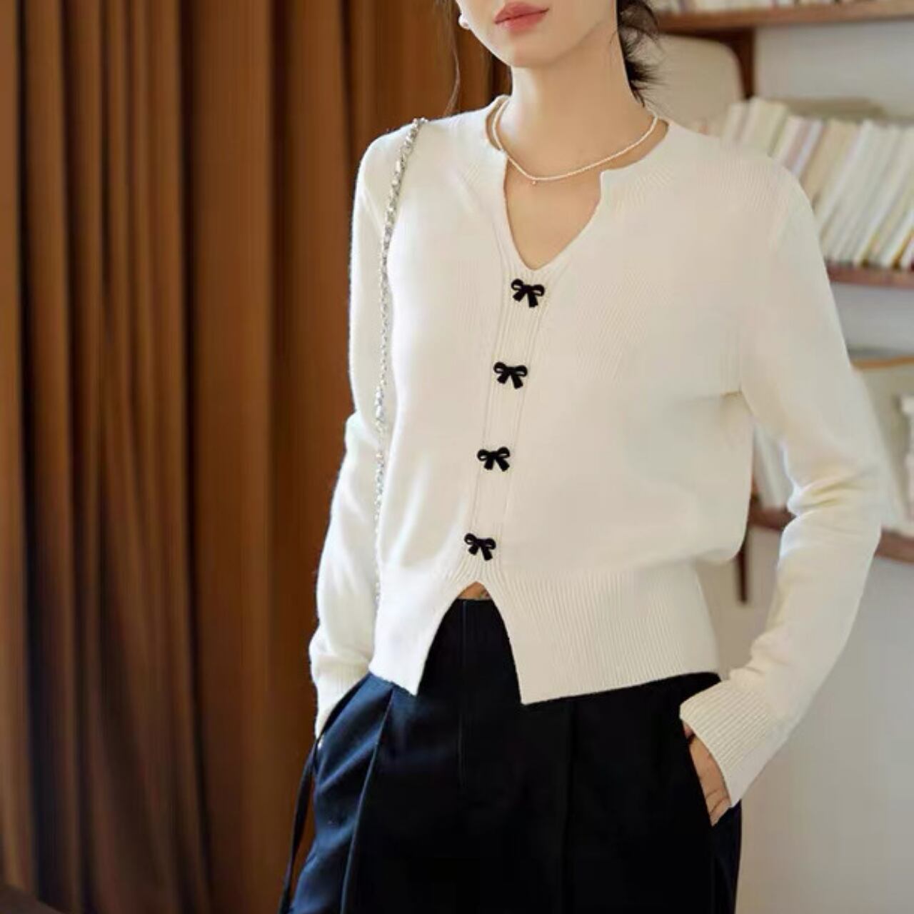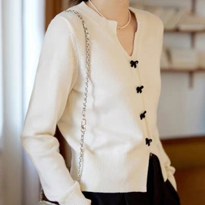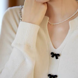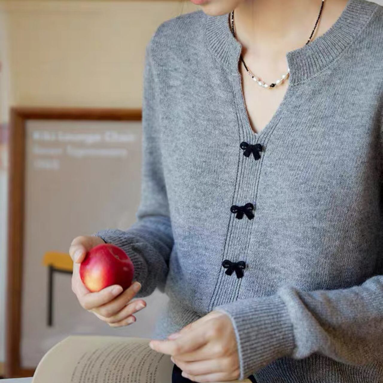 小さなリボンボタンが上品で可憐なアクセントになるVネックカーディガン。