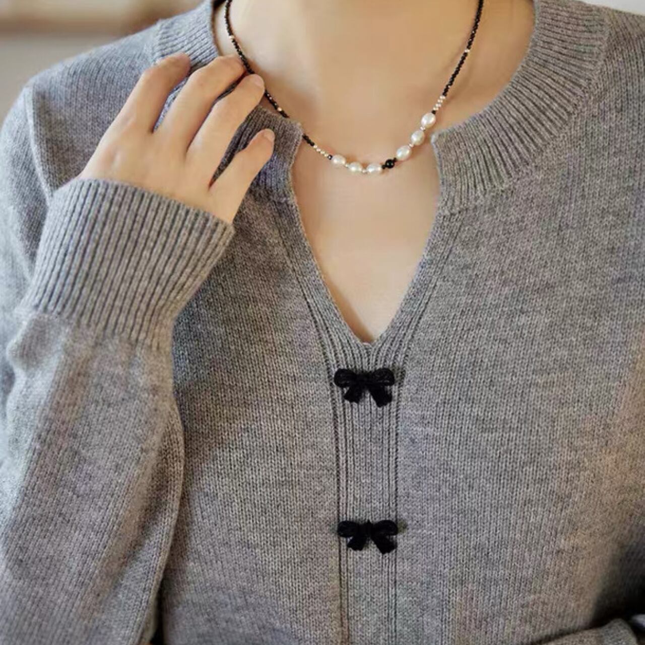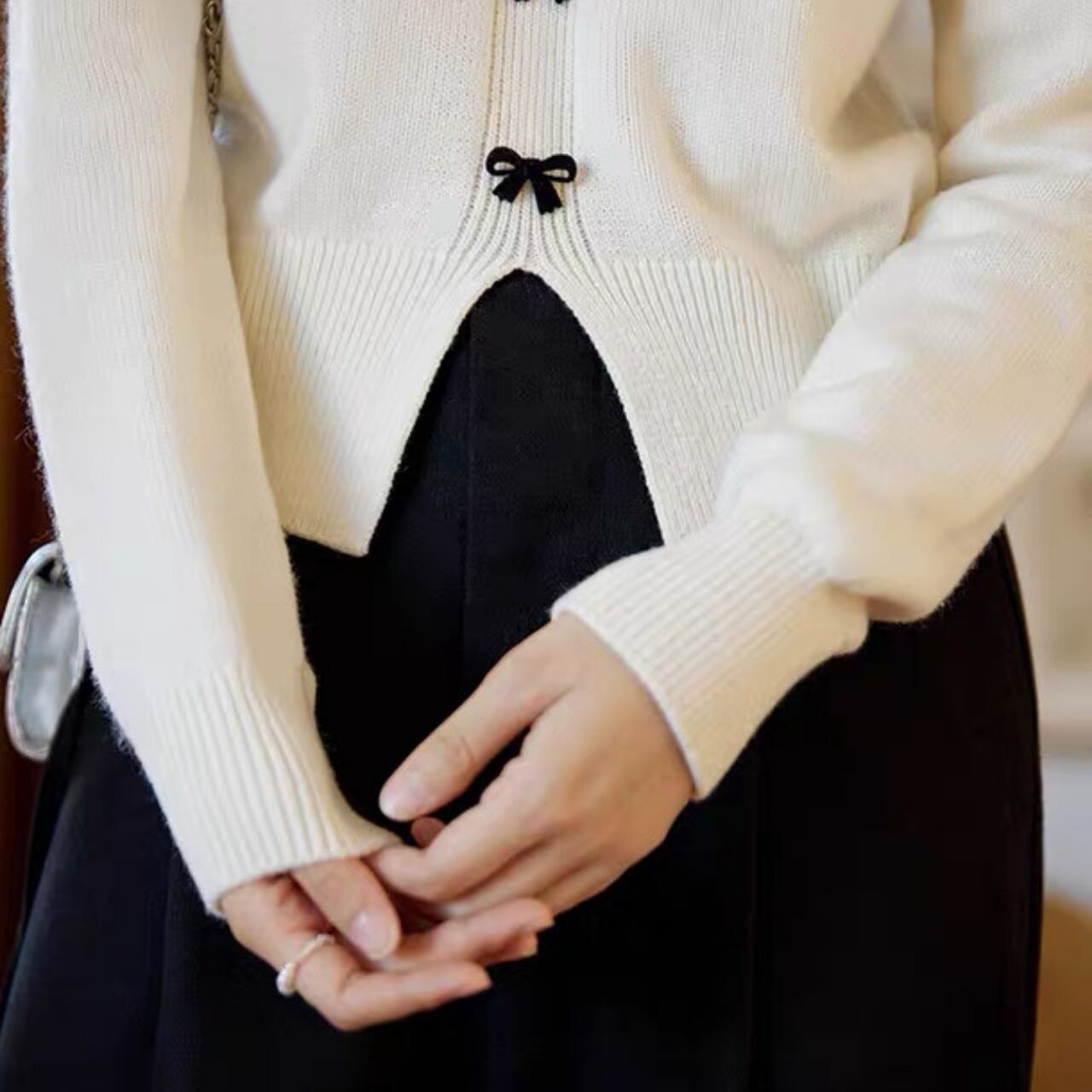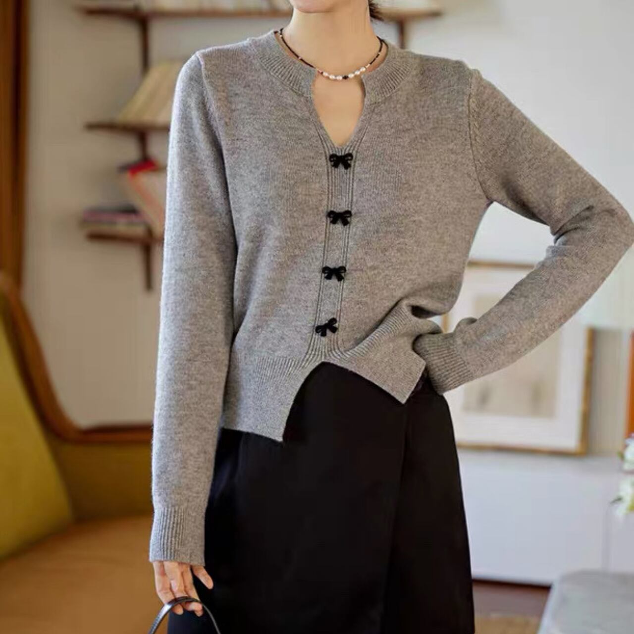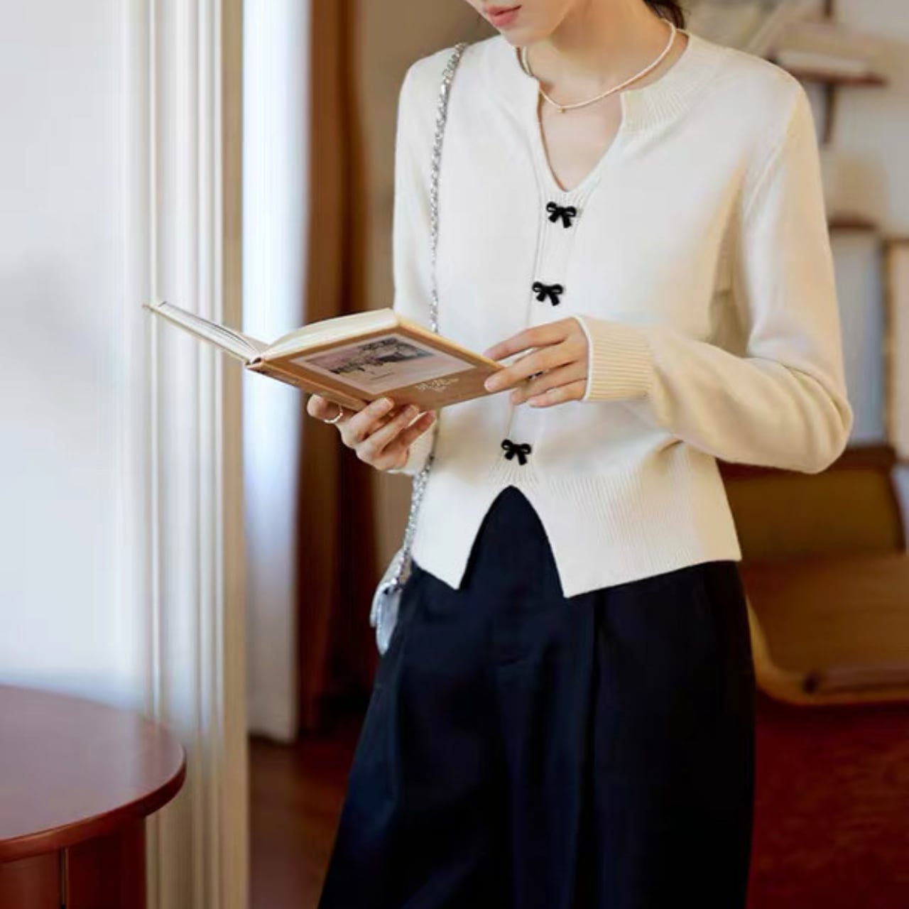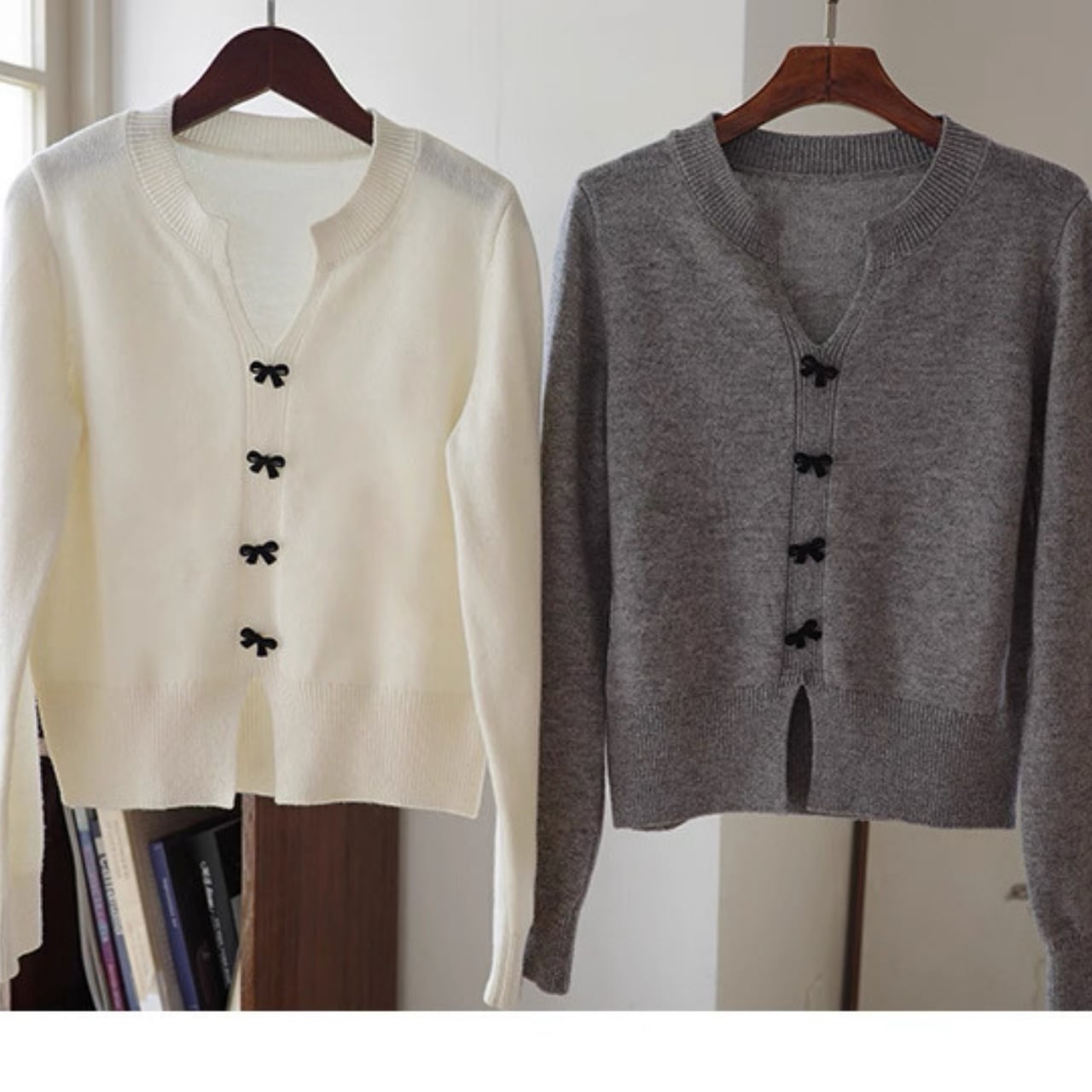 小さなリボンボタンが上品で可憐なアクセントになるVネックカーディガン。