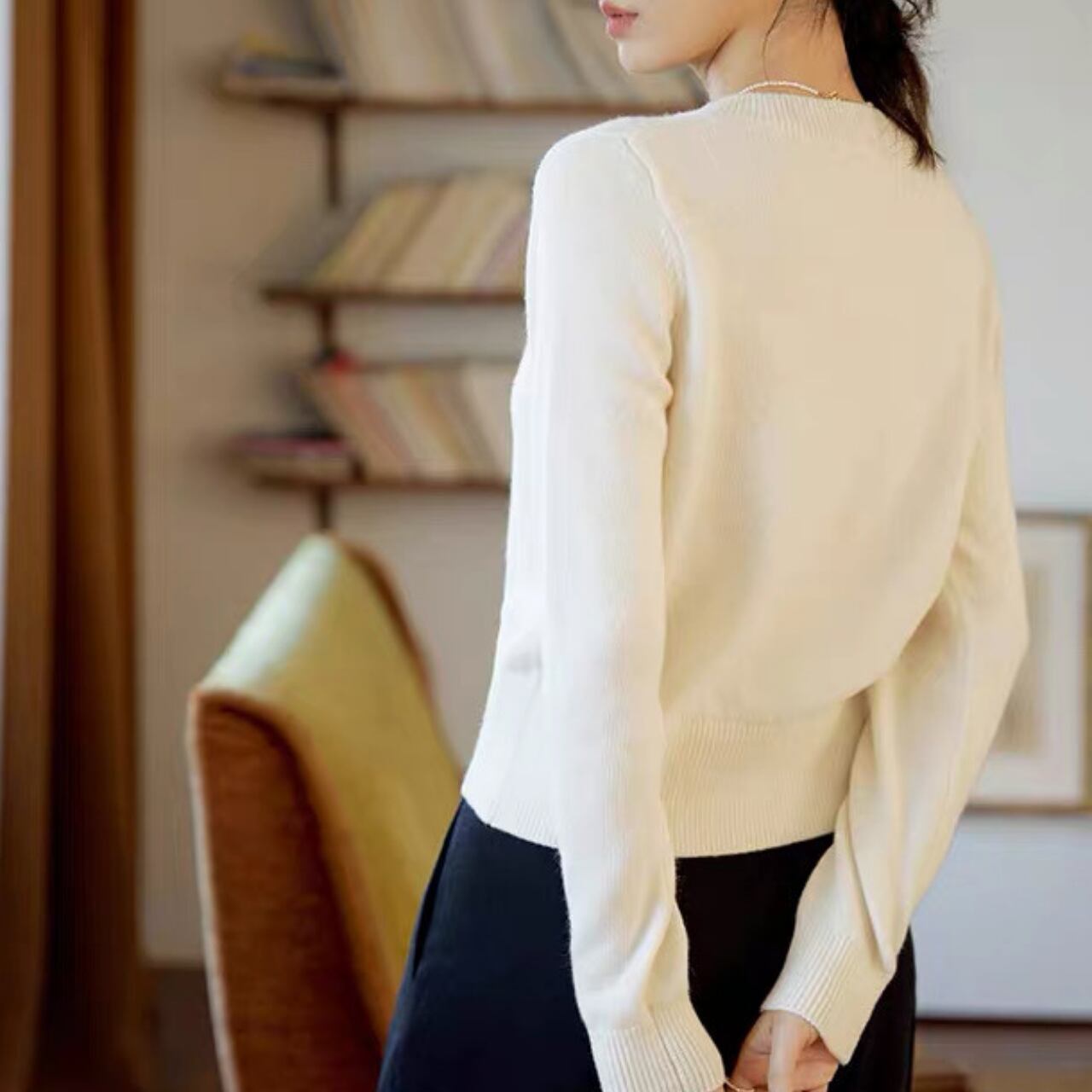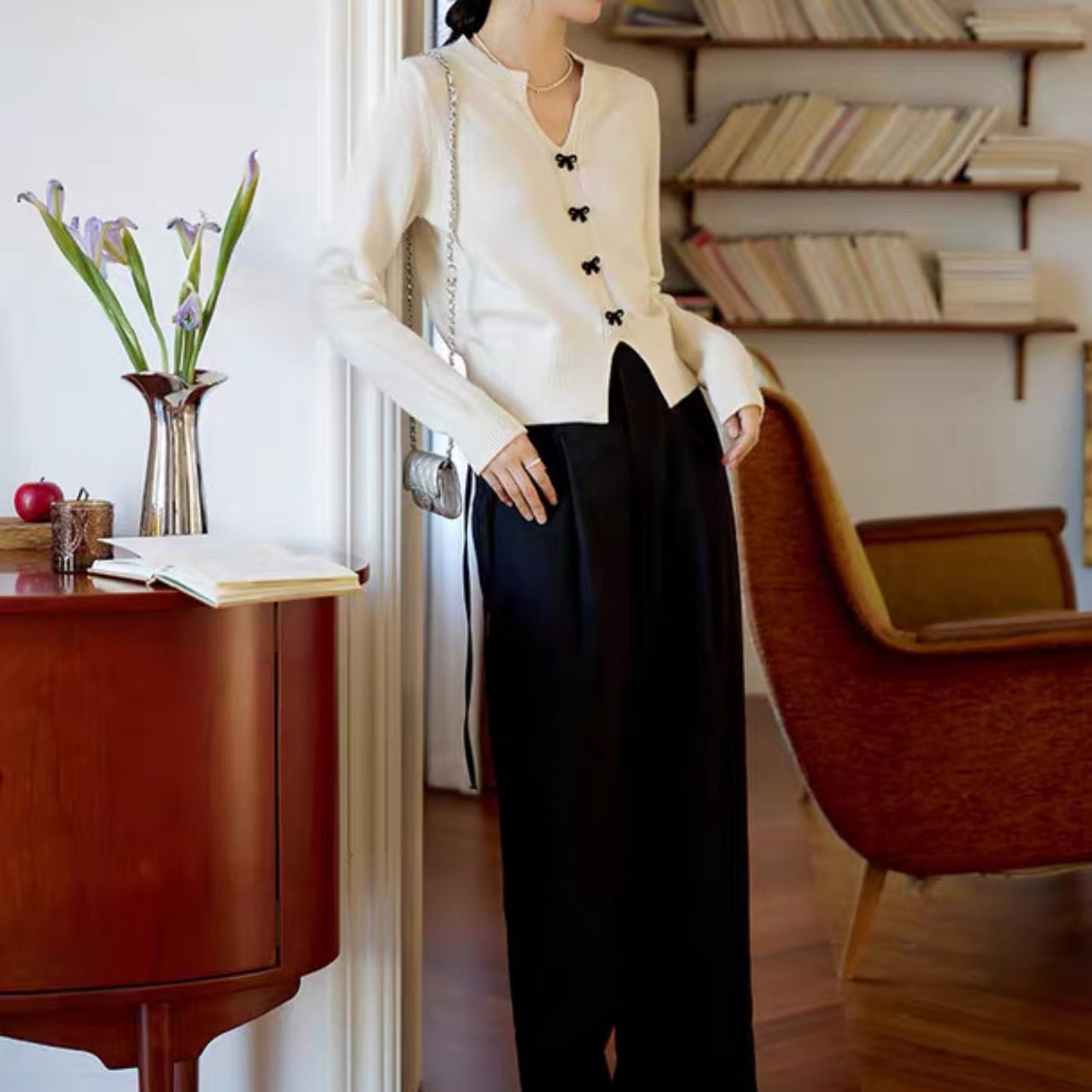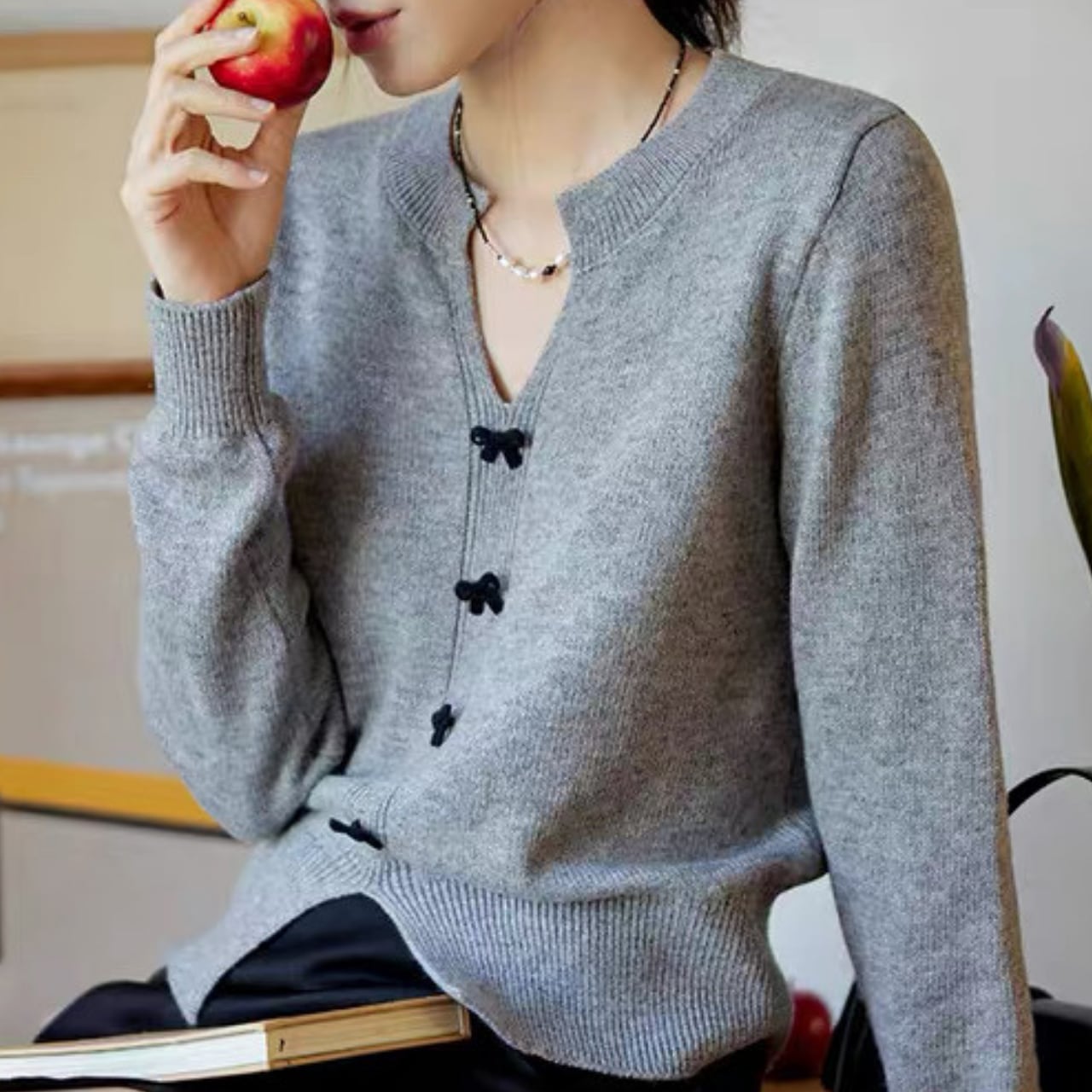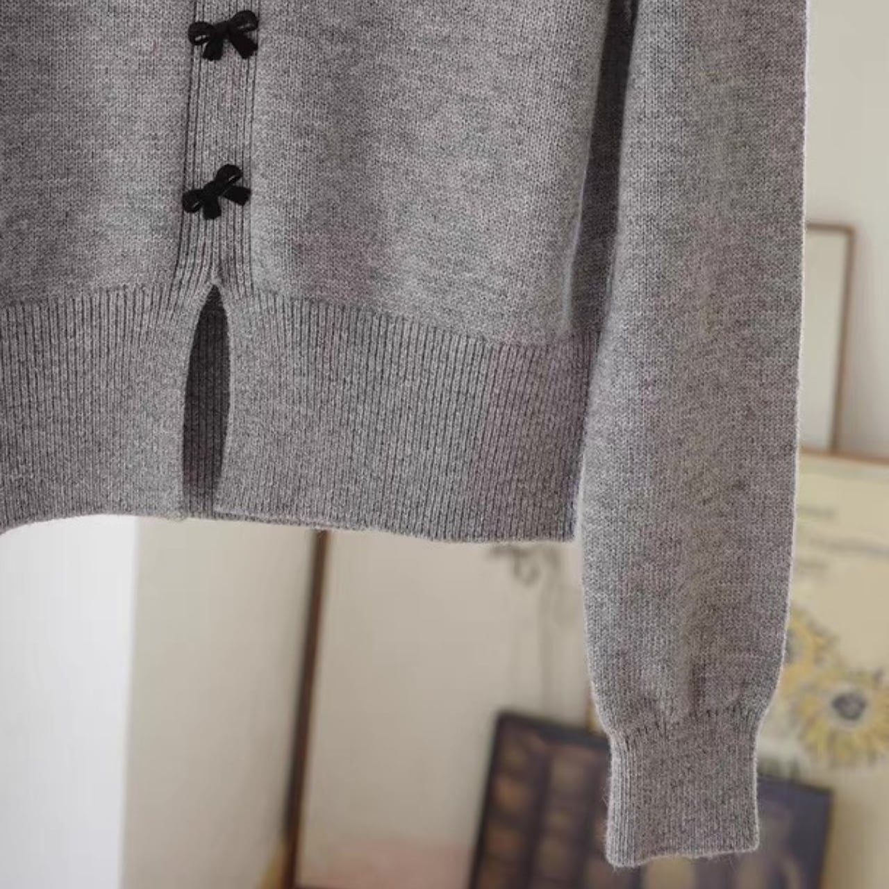 小さなリボンボタンが上品で可憐なアクセントになるVネックカーディガン。