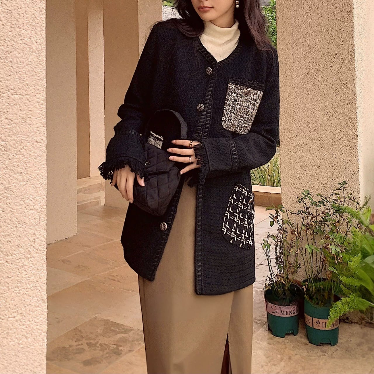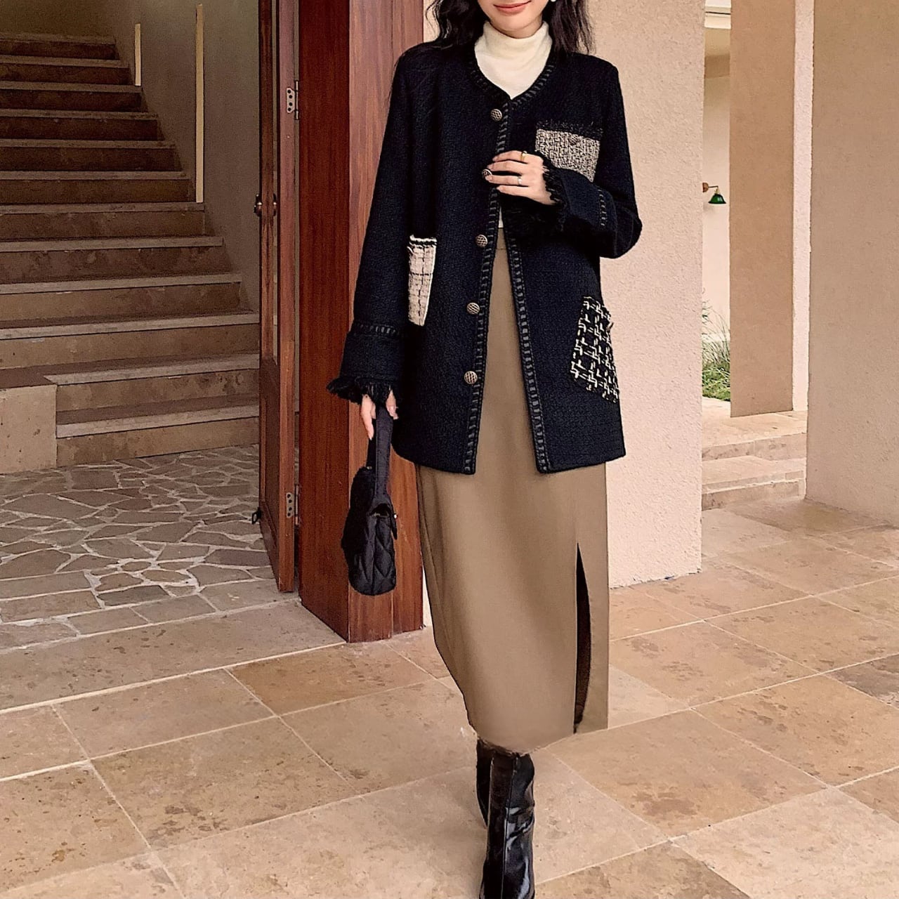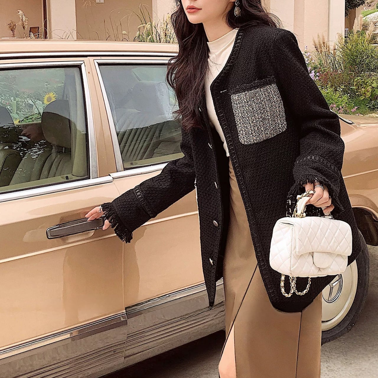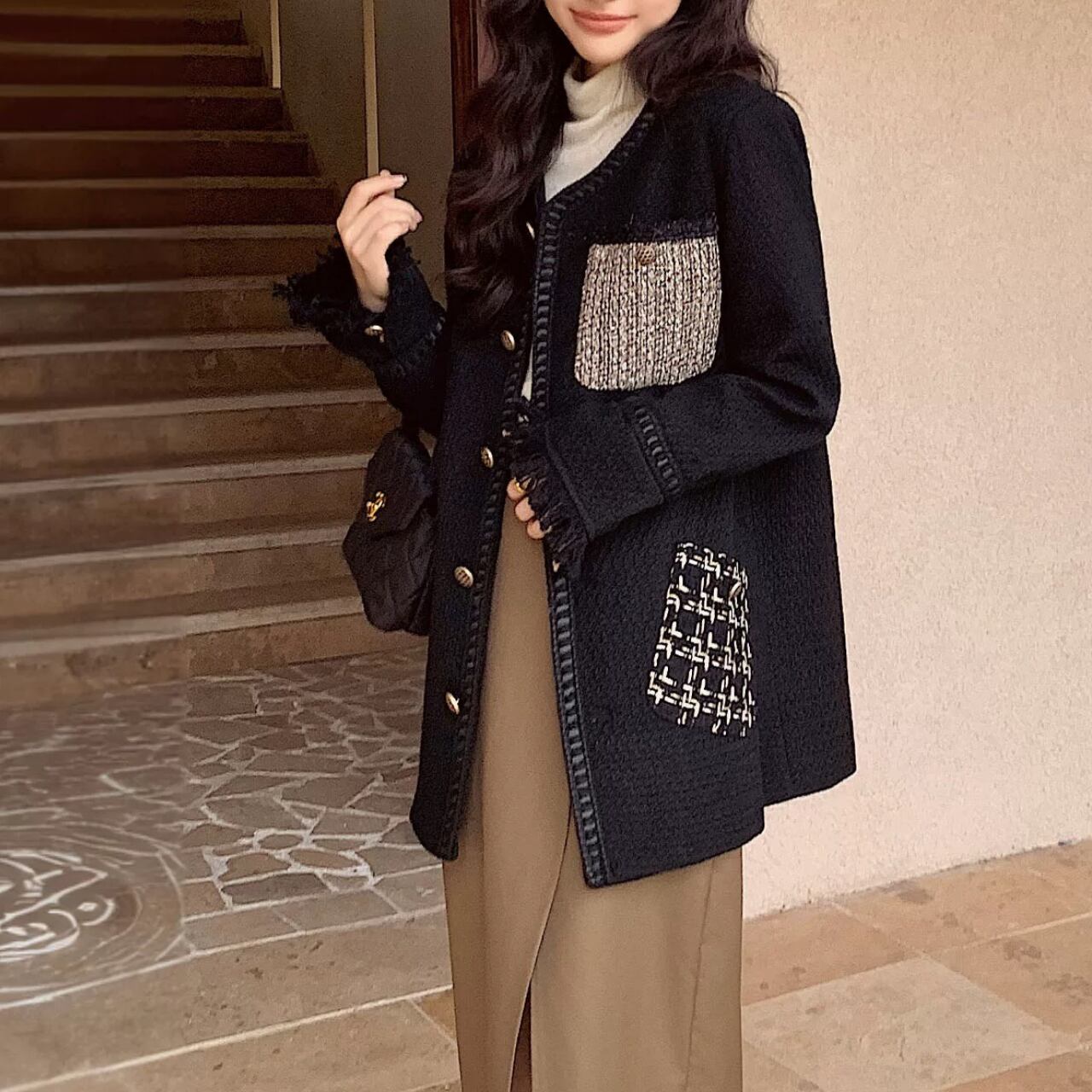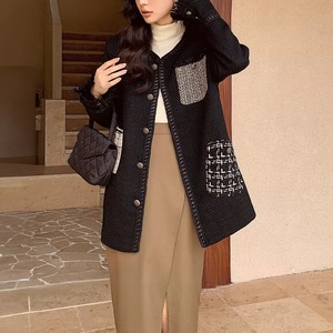 異素材ポケットがアクセントになった、クラシカルなノーカラーツイードジャケット。