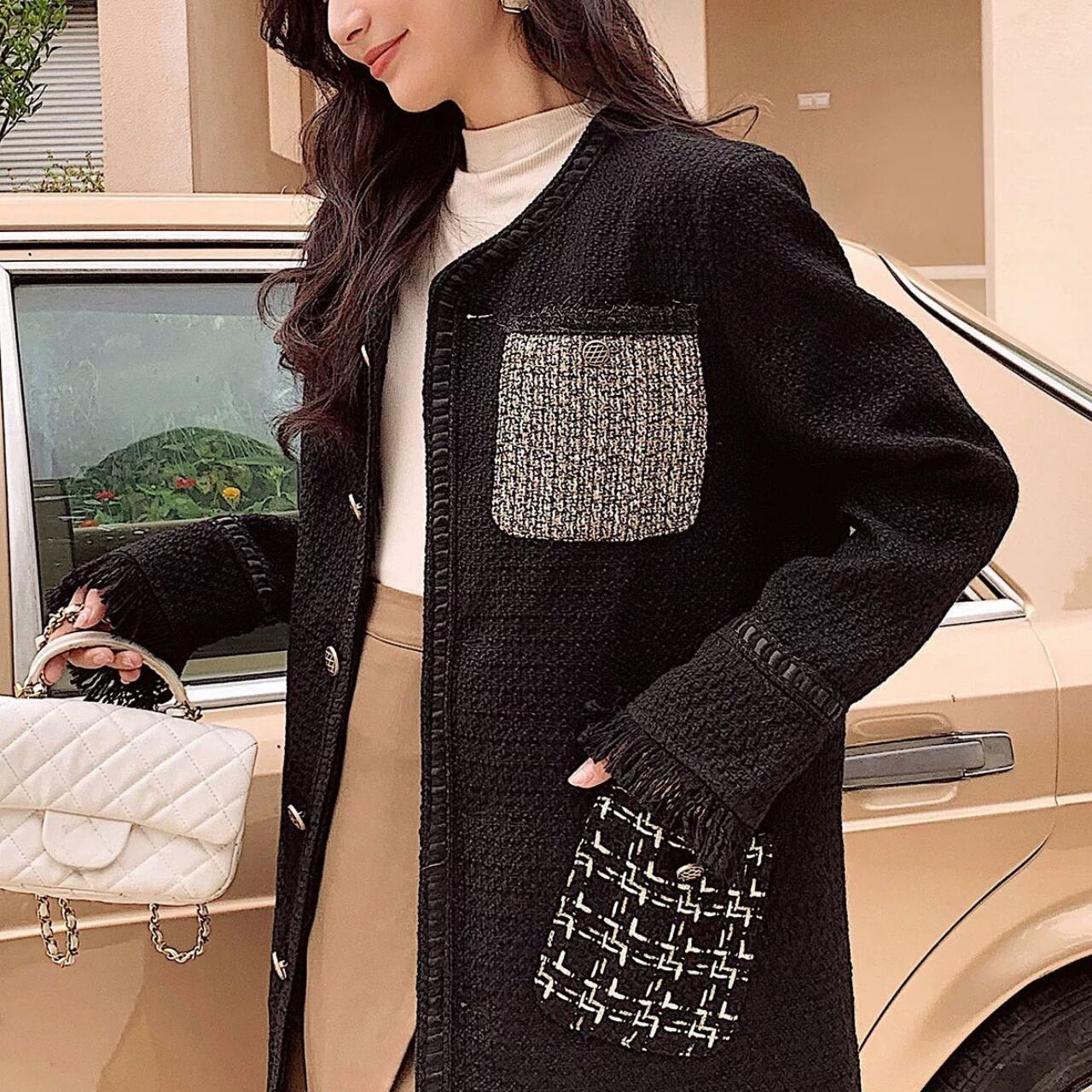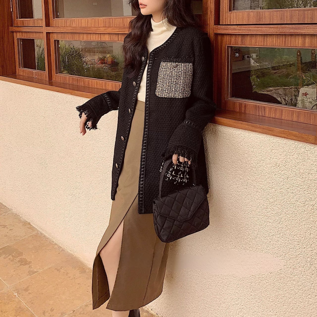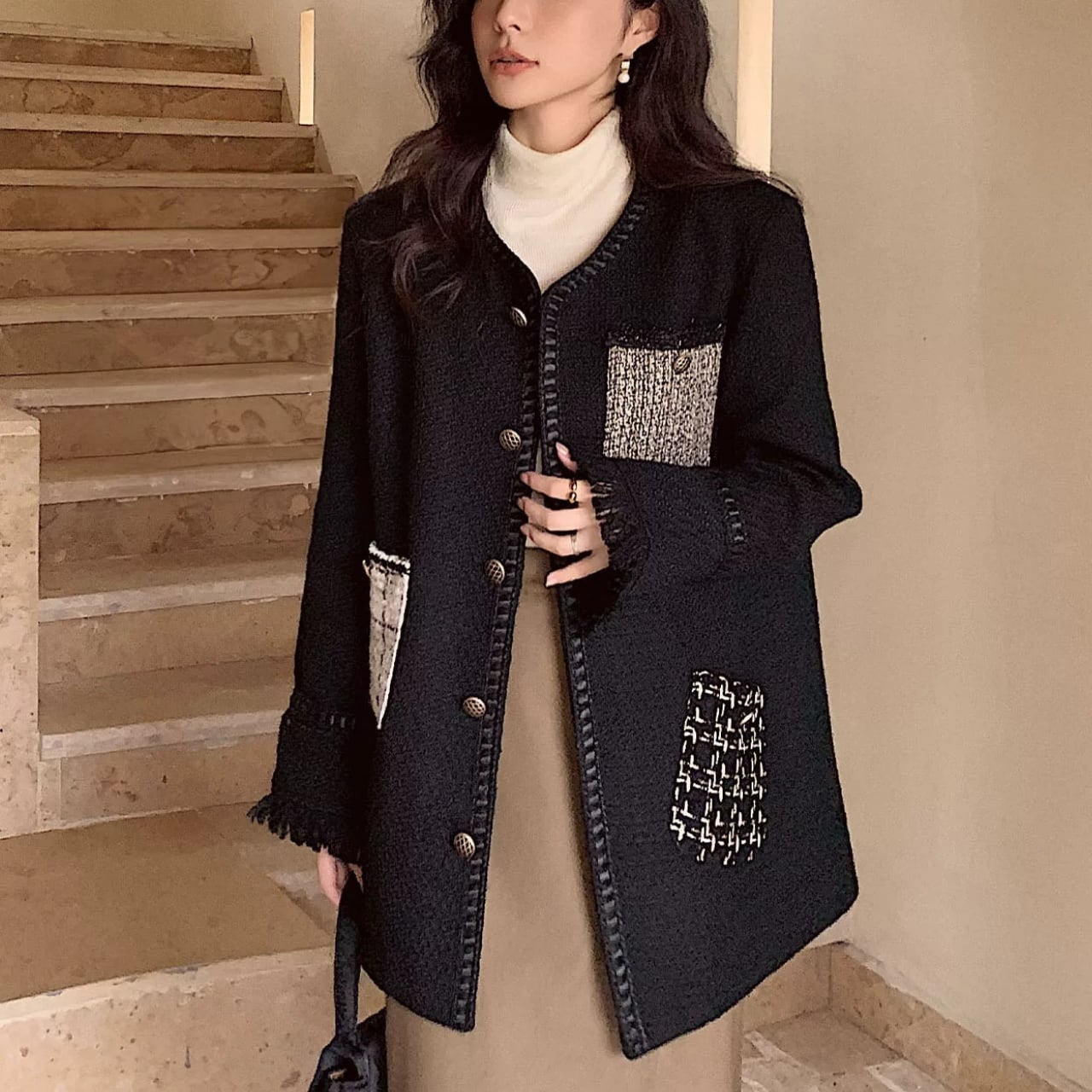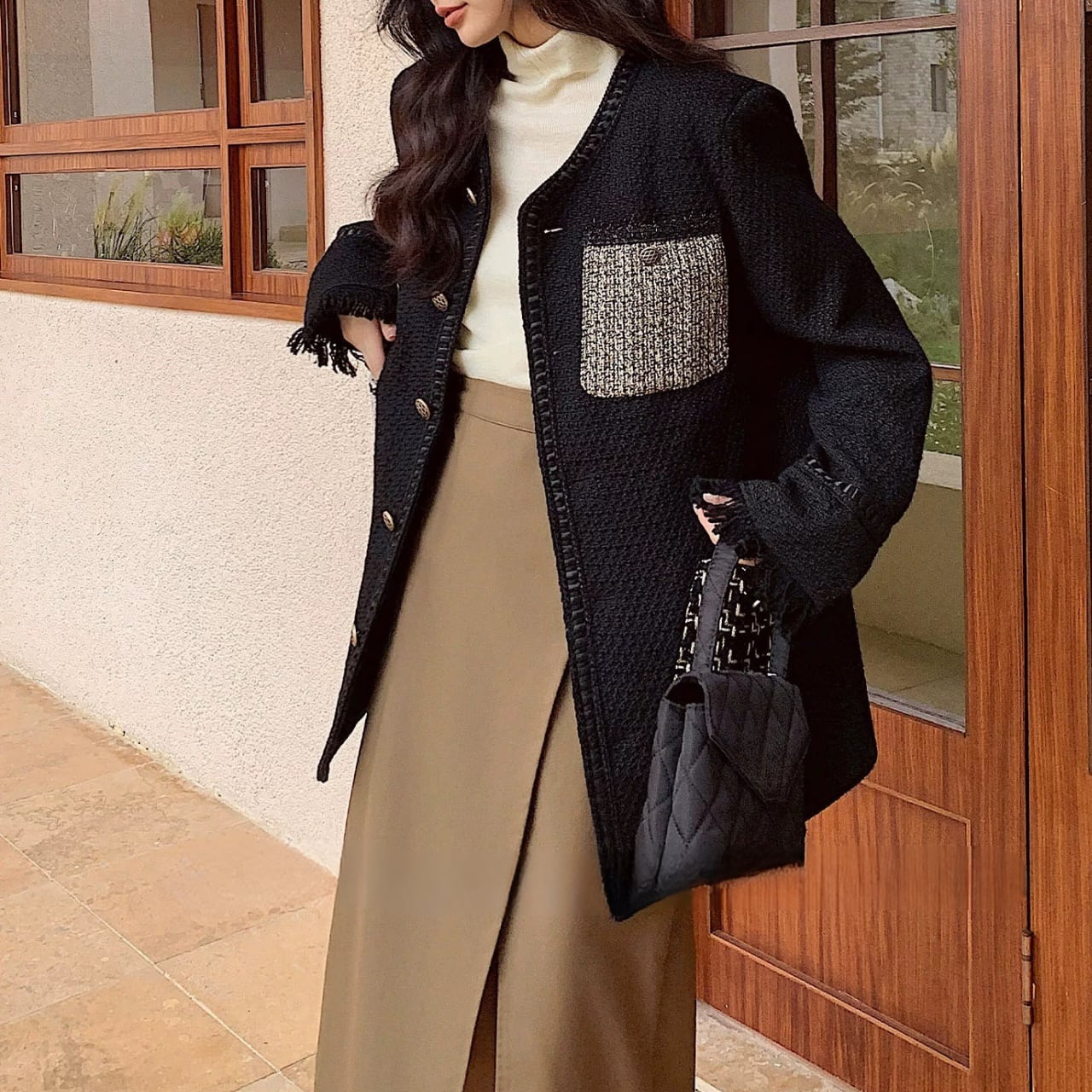 異素材ポケットがアクセントになった、クラシカルなノーカラーツイードジャケット。