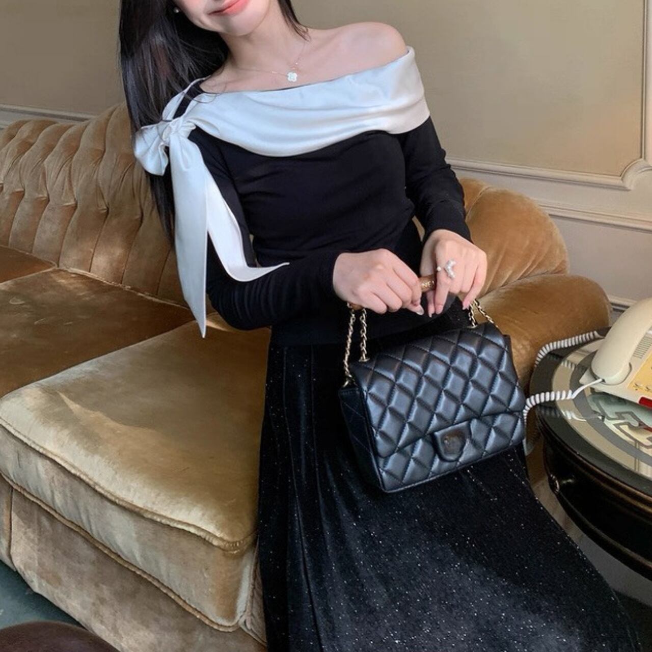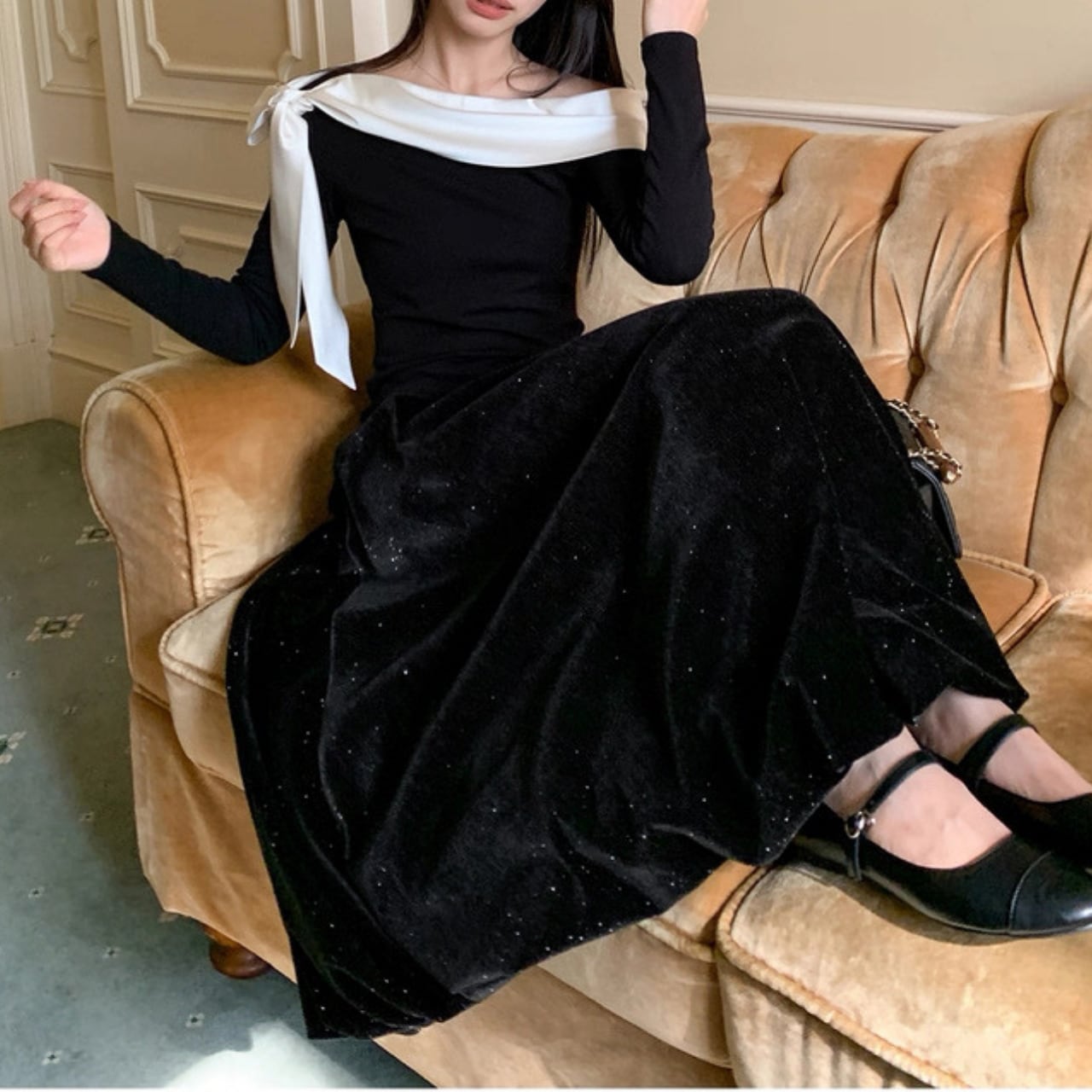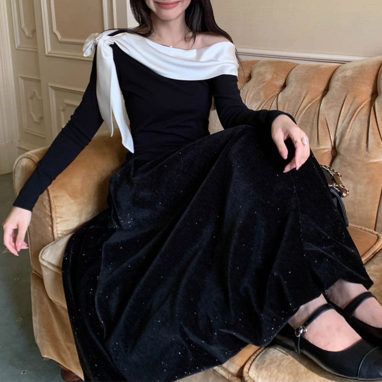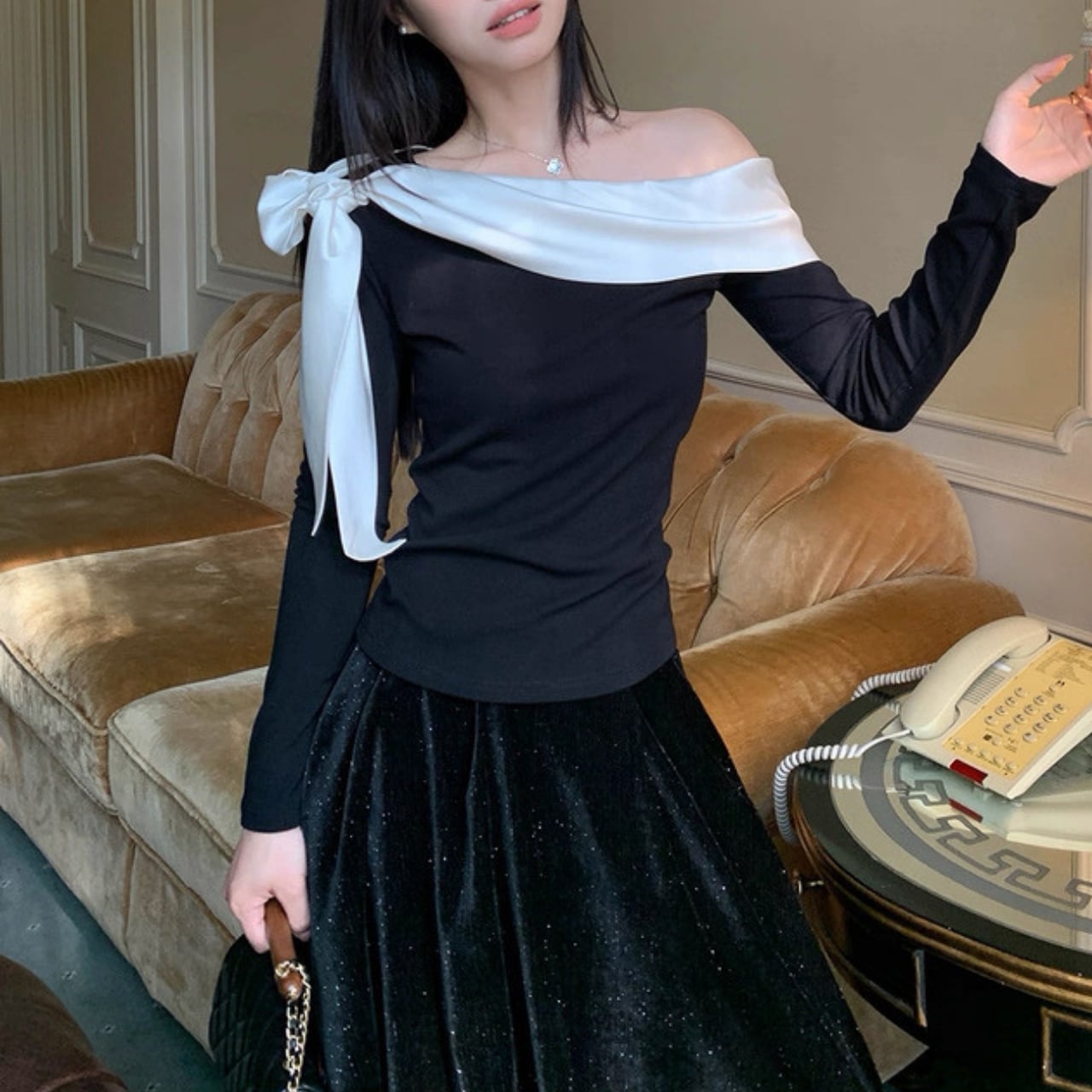 肩のラインを美しく見せるシルエットで、特別感のある大人の魅力を演出。