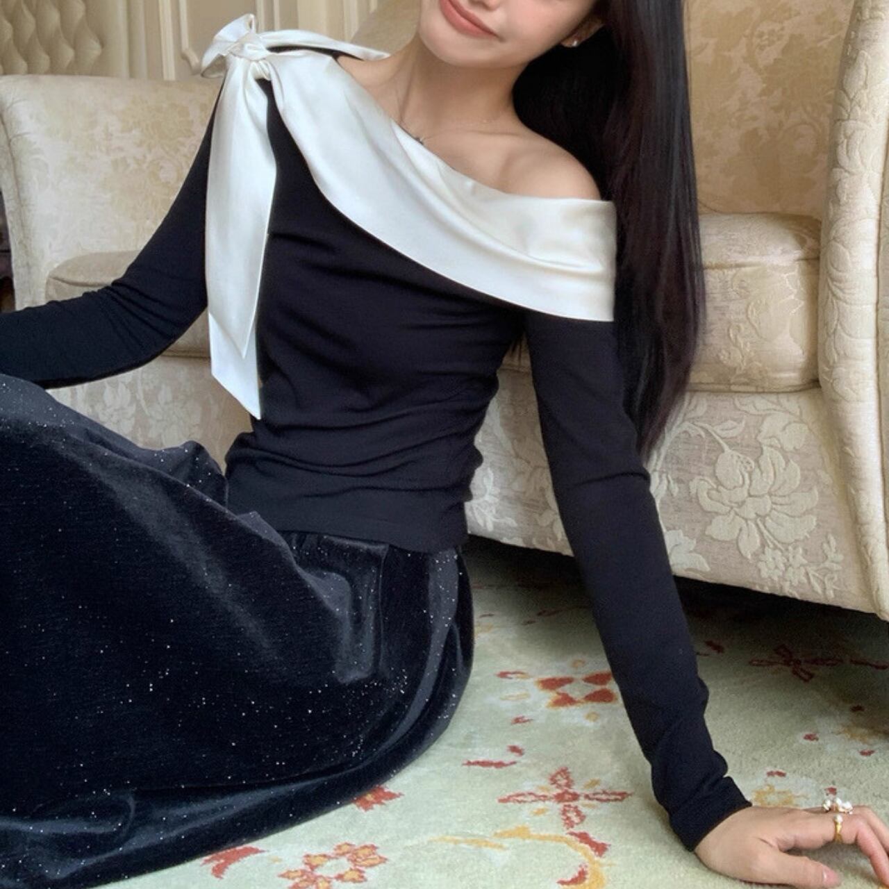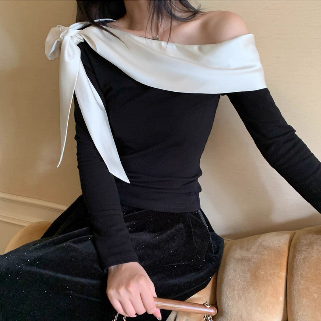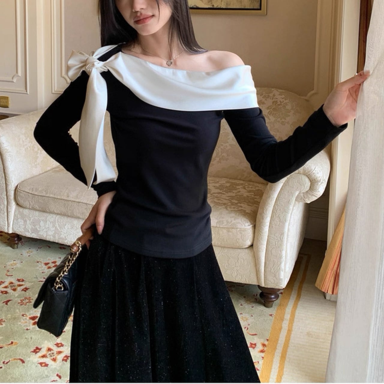 大ぶりのリボンが印象的な、アシンメトリーデザインの上品トップス。