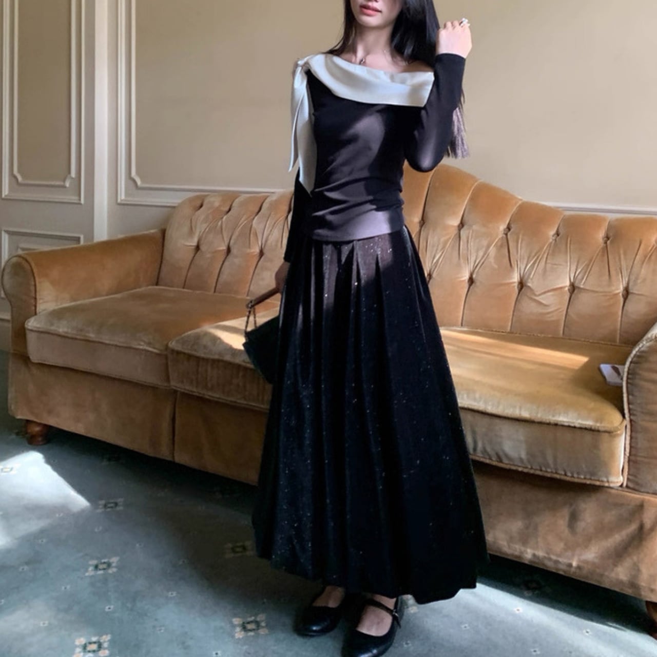 スカート合わせで華やかに、パンツ合わせでモードにも決まる万能アイテムです。