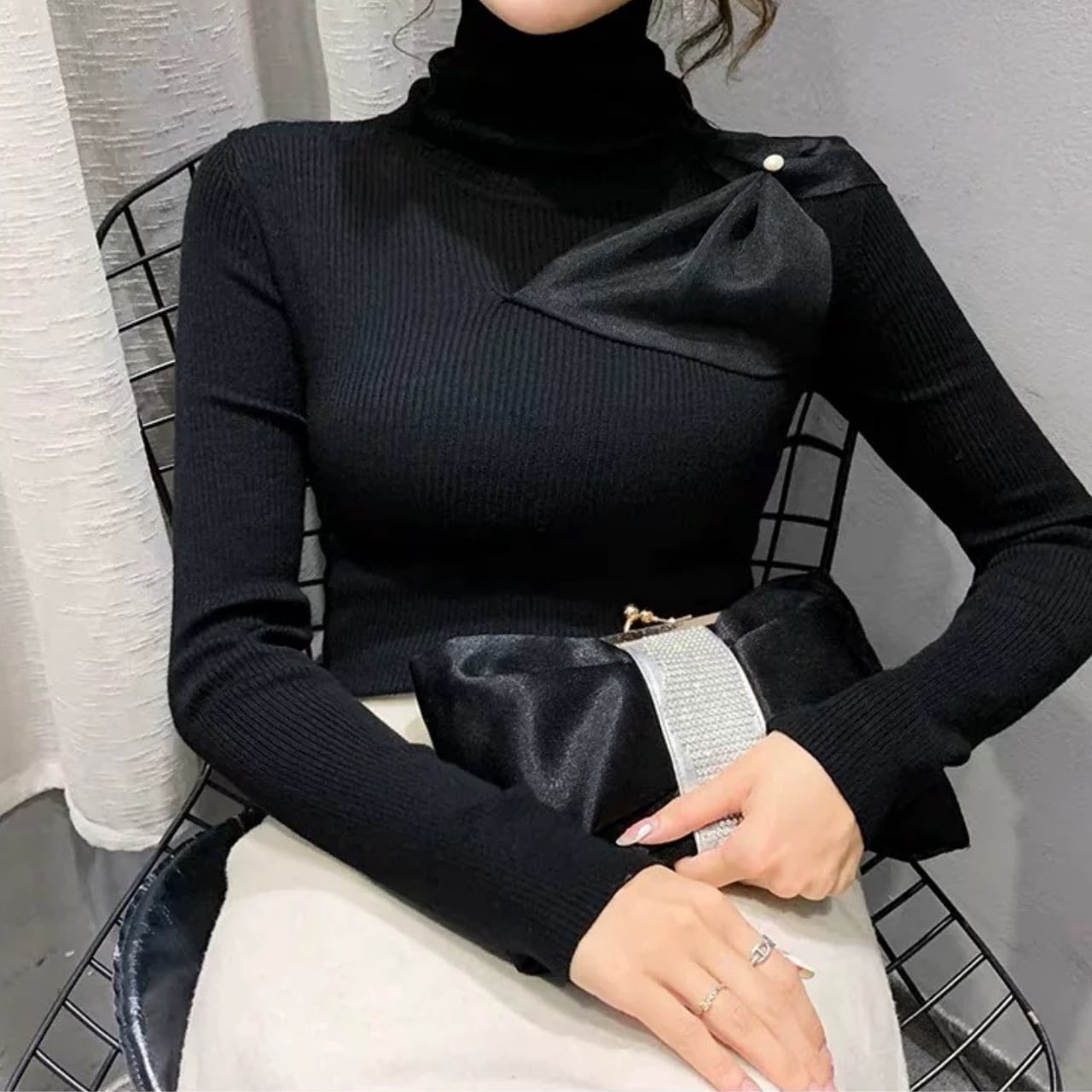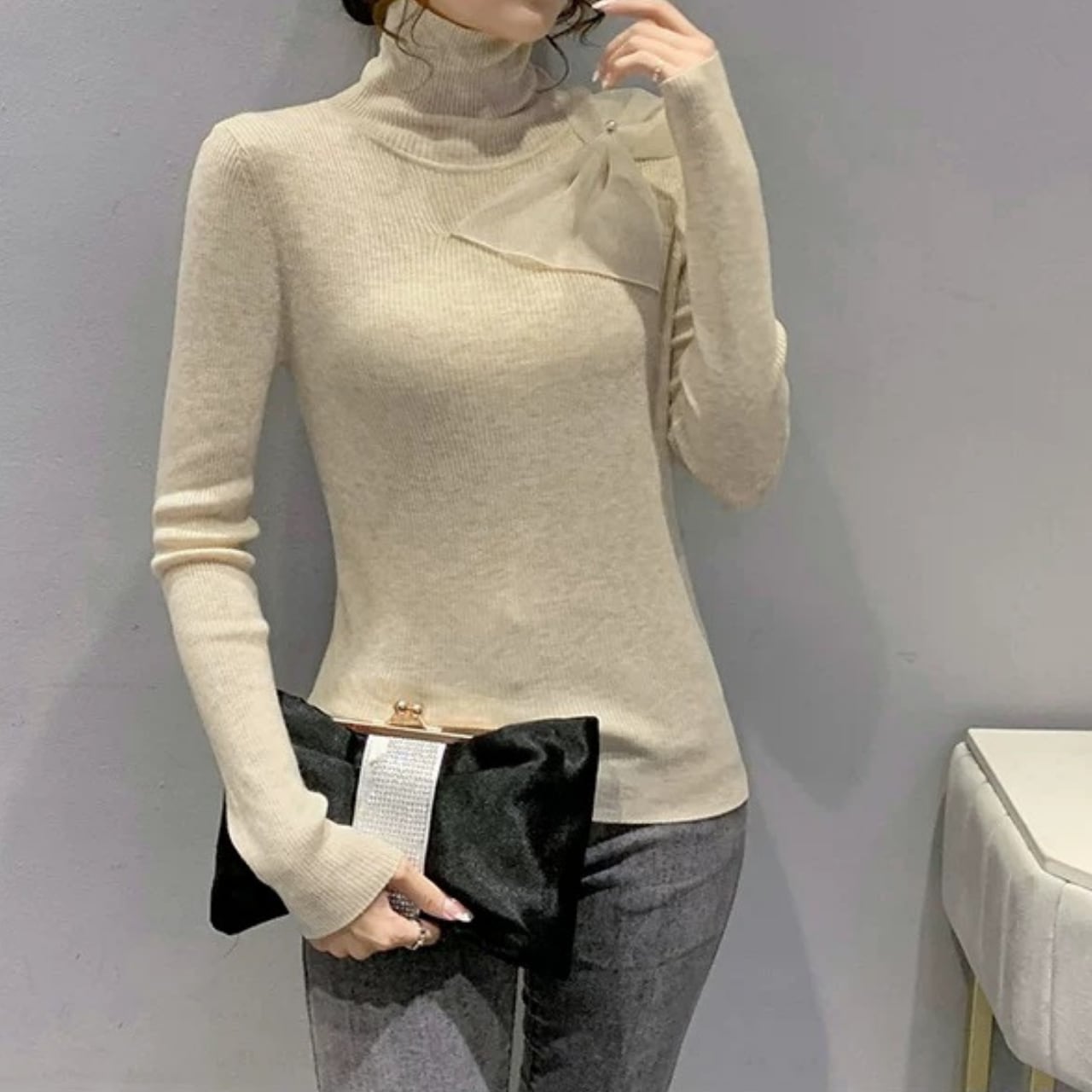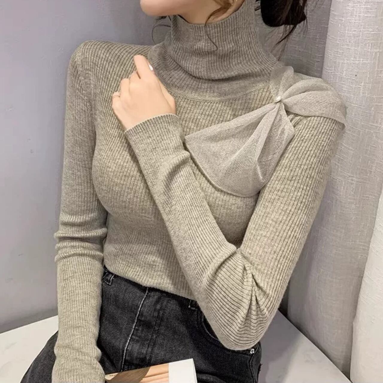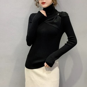 片肩のリボンディテールが上品なアクセントになるタートルニット。