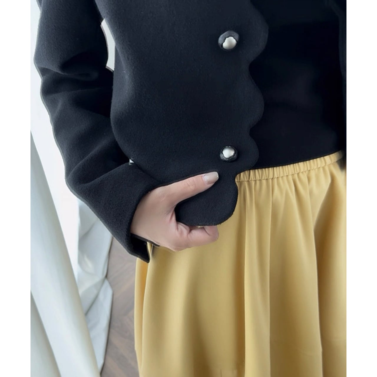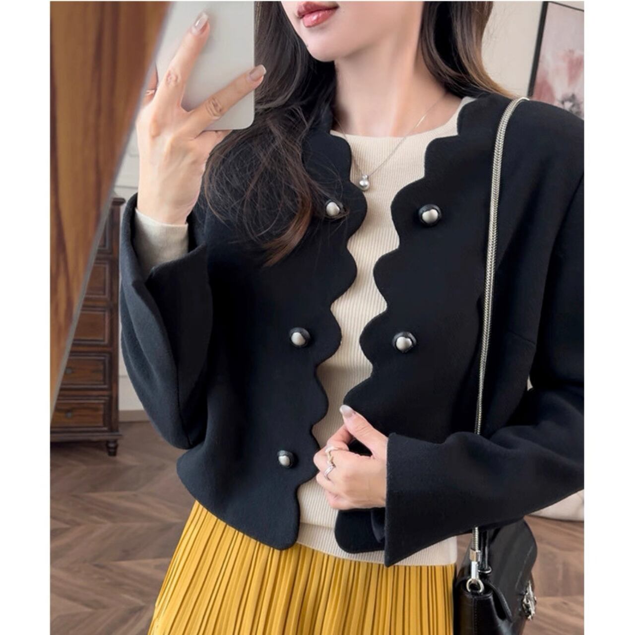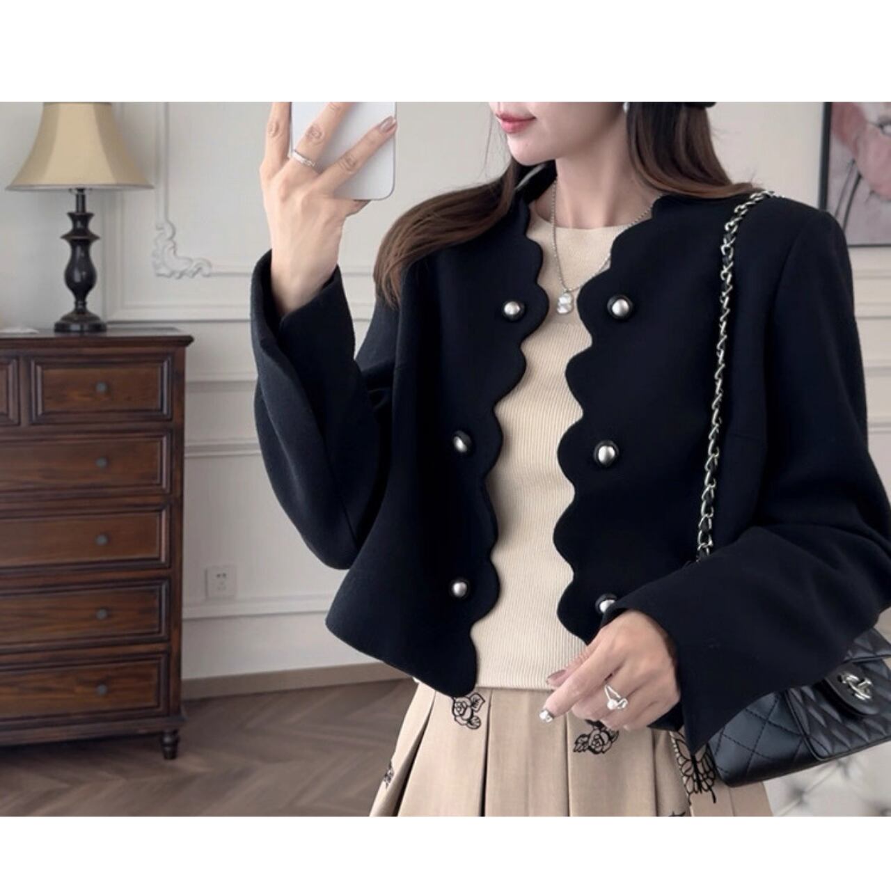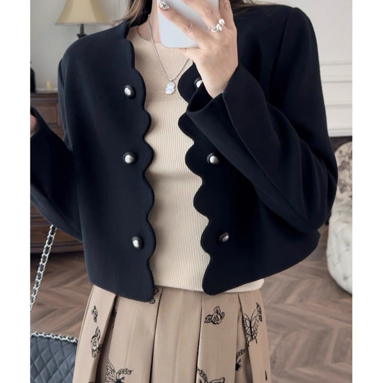 スカラップラインとパールボタンがクラシカルな魅力を放つショートジャケット。
